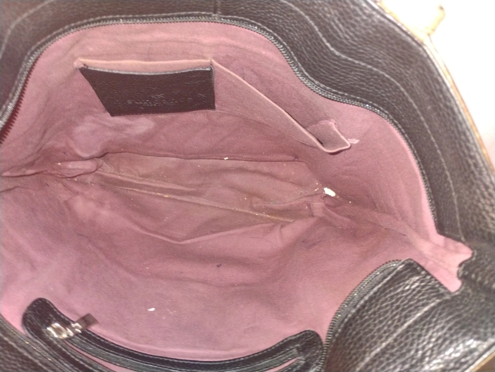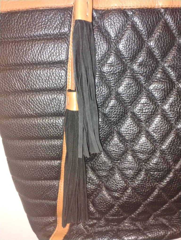 Black quilted leather tote bag. Brown leather trim. Two tassels. Interior zipper pocket. Made in Italy.