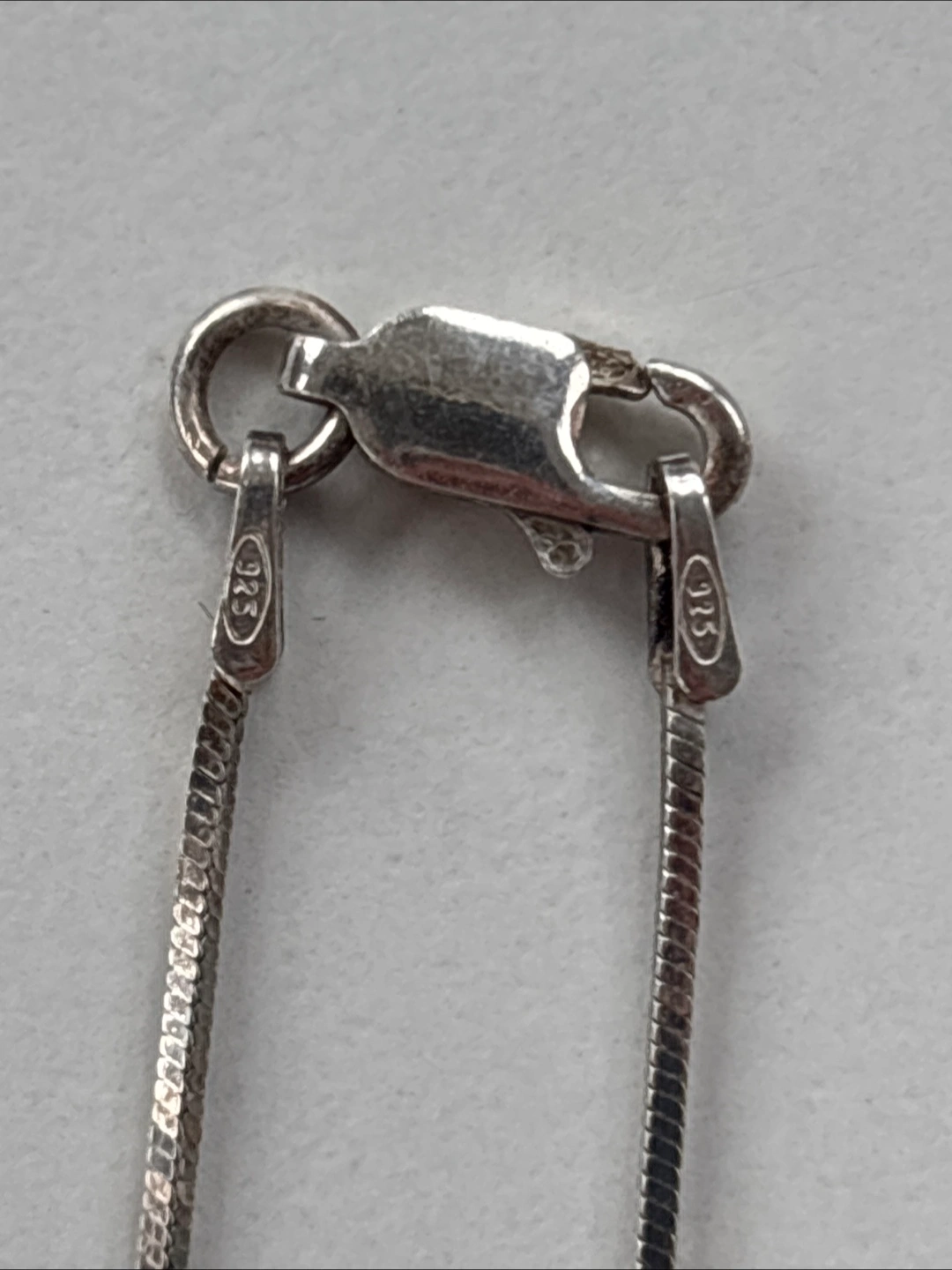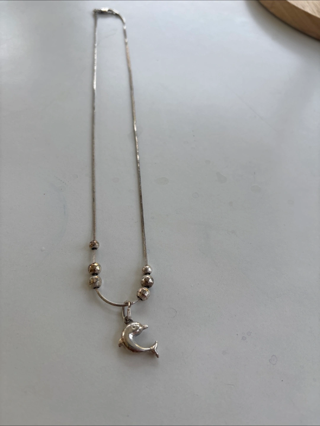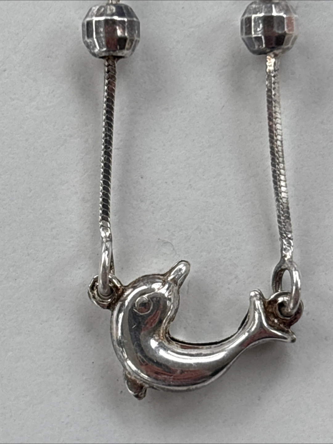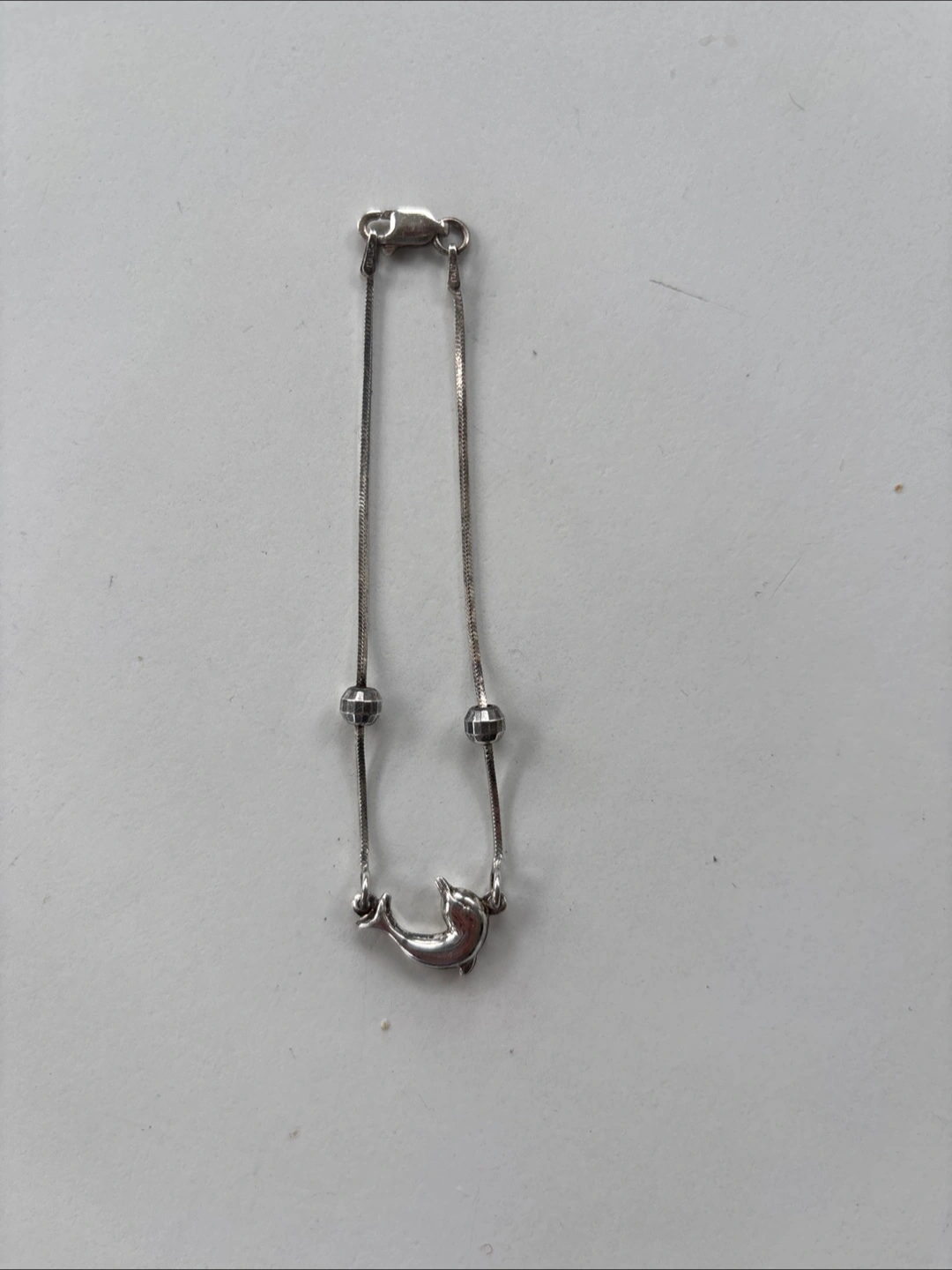 925 sterling silver bracelet. Features a dolphin charm and two faceted beads. Snake chain. Lobster clasp.