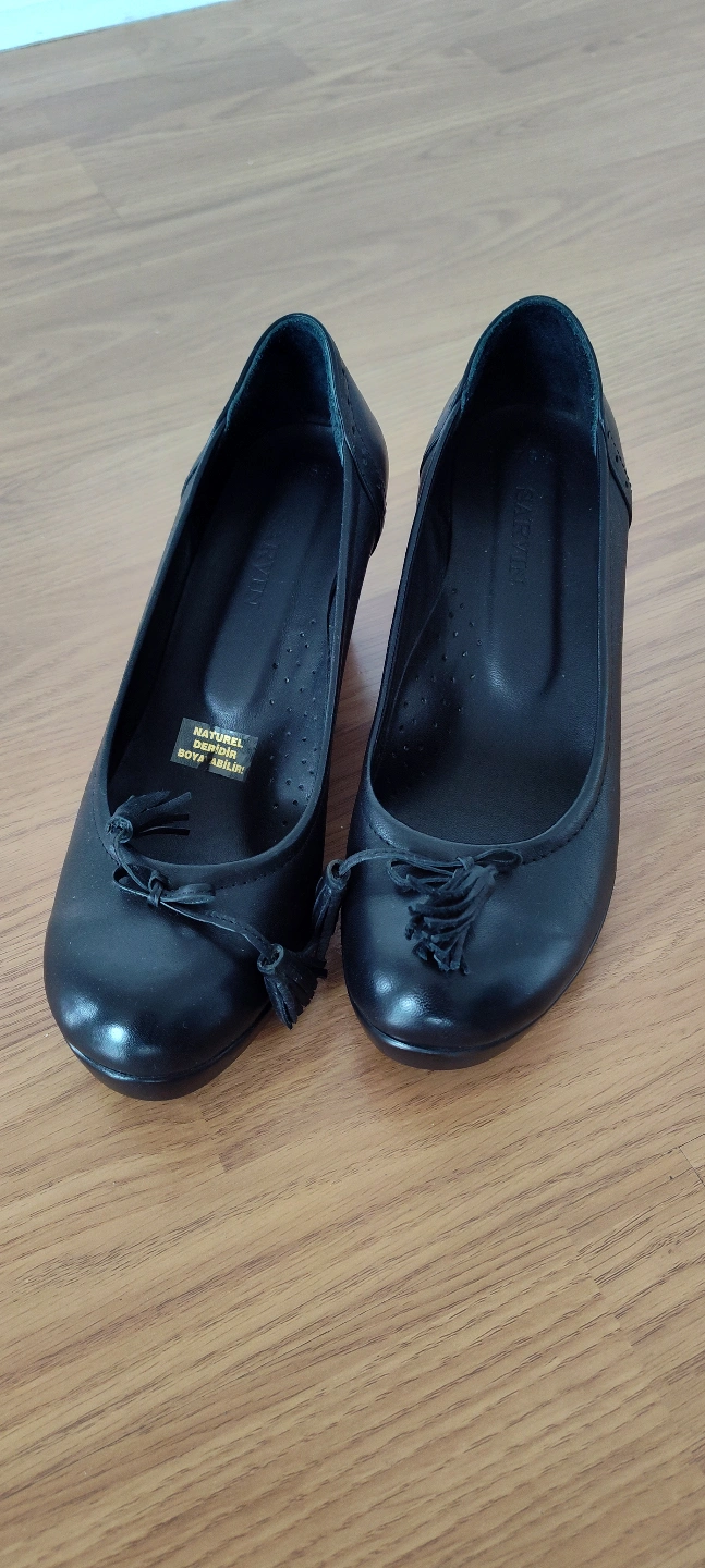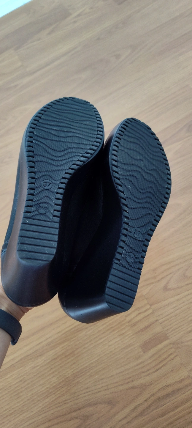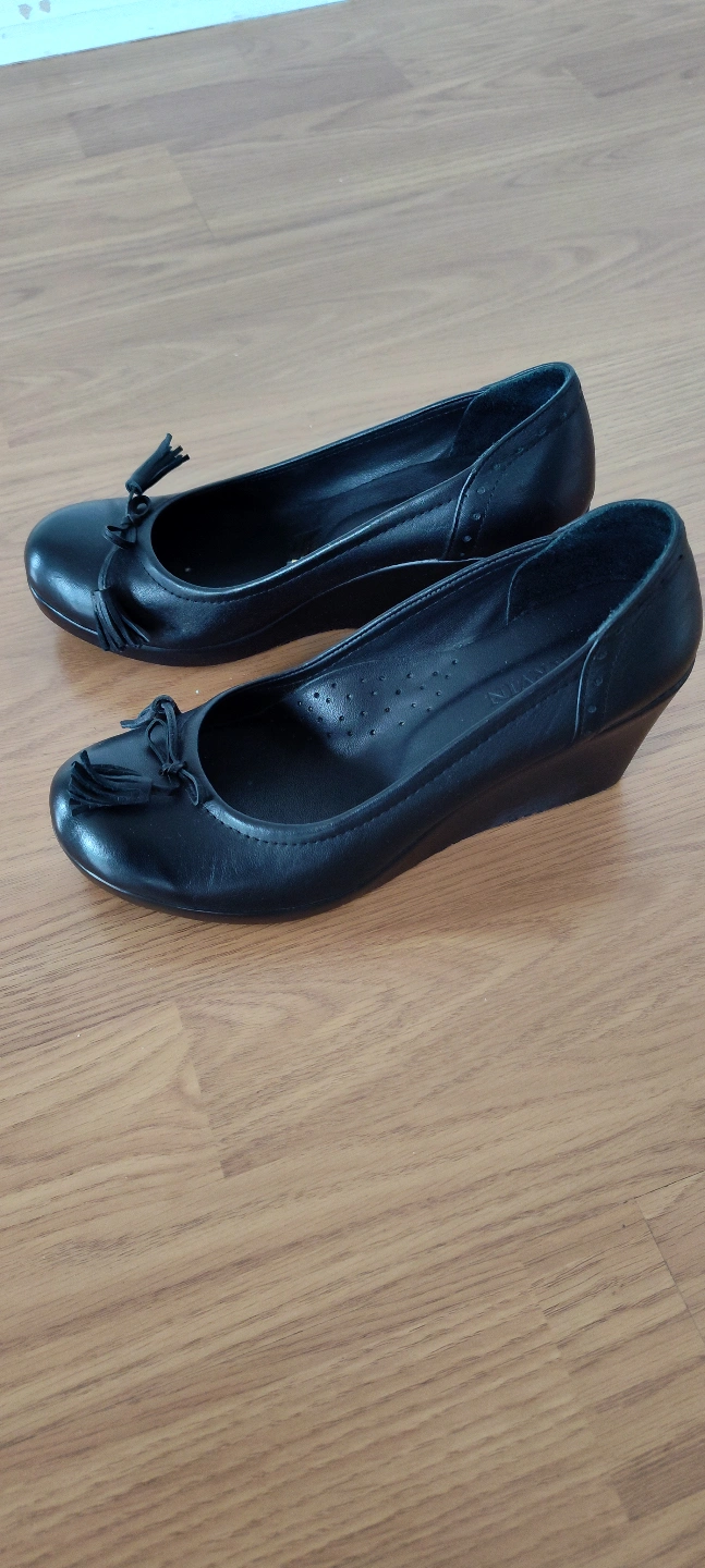 Pair of black genuine leather wedge shoes. Features small tassels at the toe. Wedge heel.