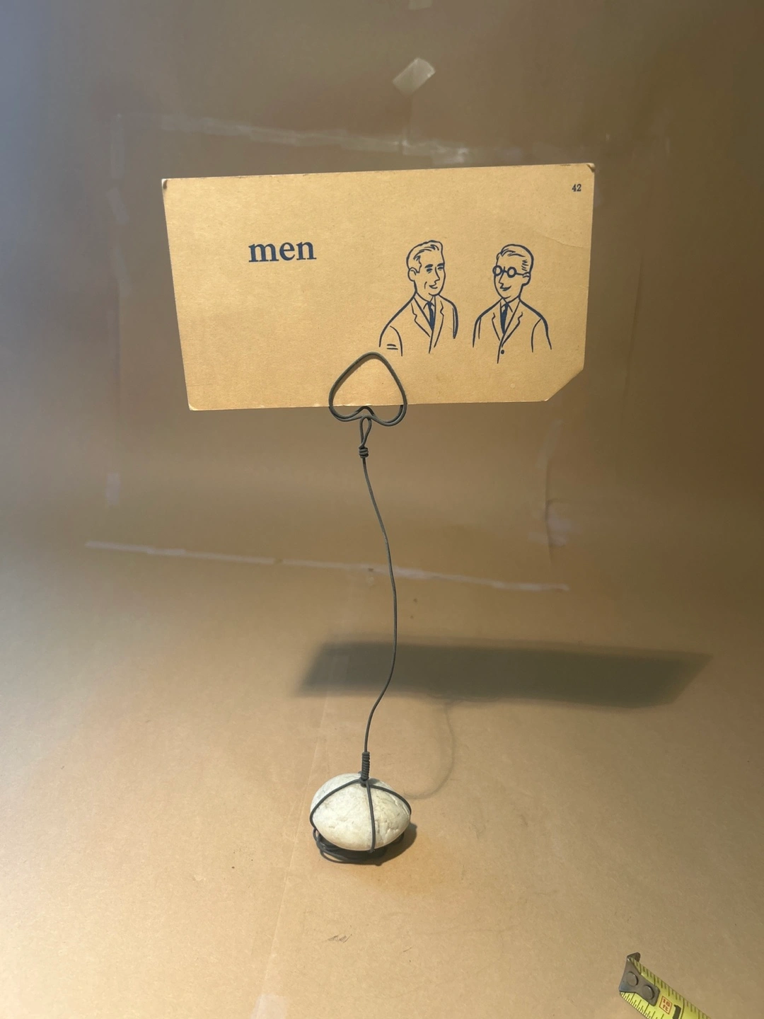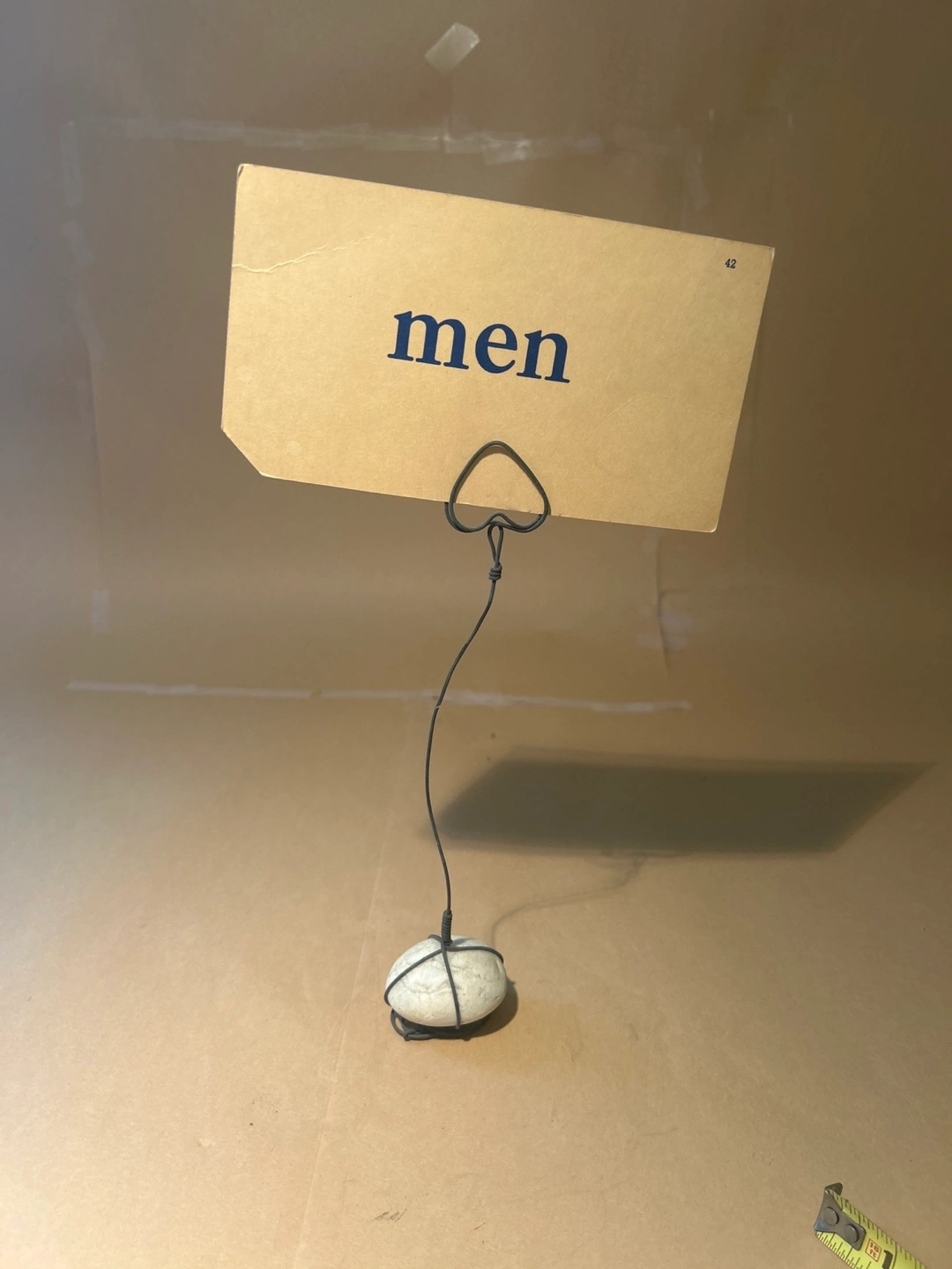 Unique vintage table tent card holder. Features a wire frame, stone base, and a small card. Perfect for adding a touch of vintage charm to your home or event.