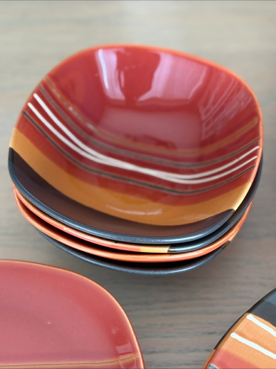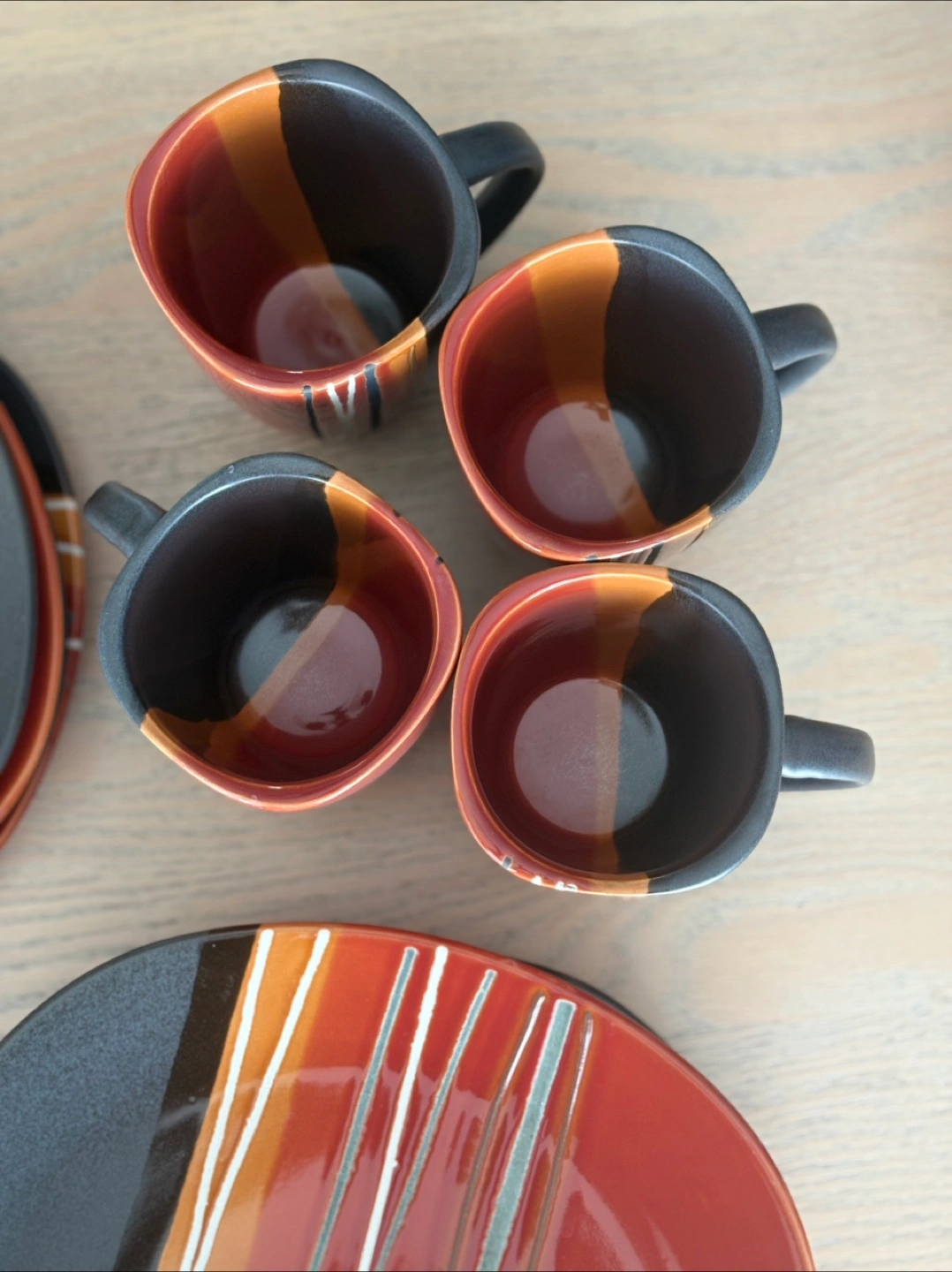 Beautiful Gibson Home Rio dinnerware set.(16 pieces)Includes 4 small plates, 4 big plates, 4 bowls and 4 mugs. Southwest-inspired design. Multi-coloured stripes. Excellent condition except for one small plate. *Note: one of the small plate had a chip on it. Please see the picture