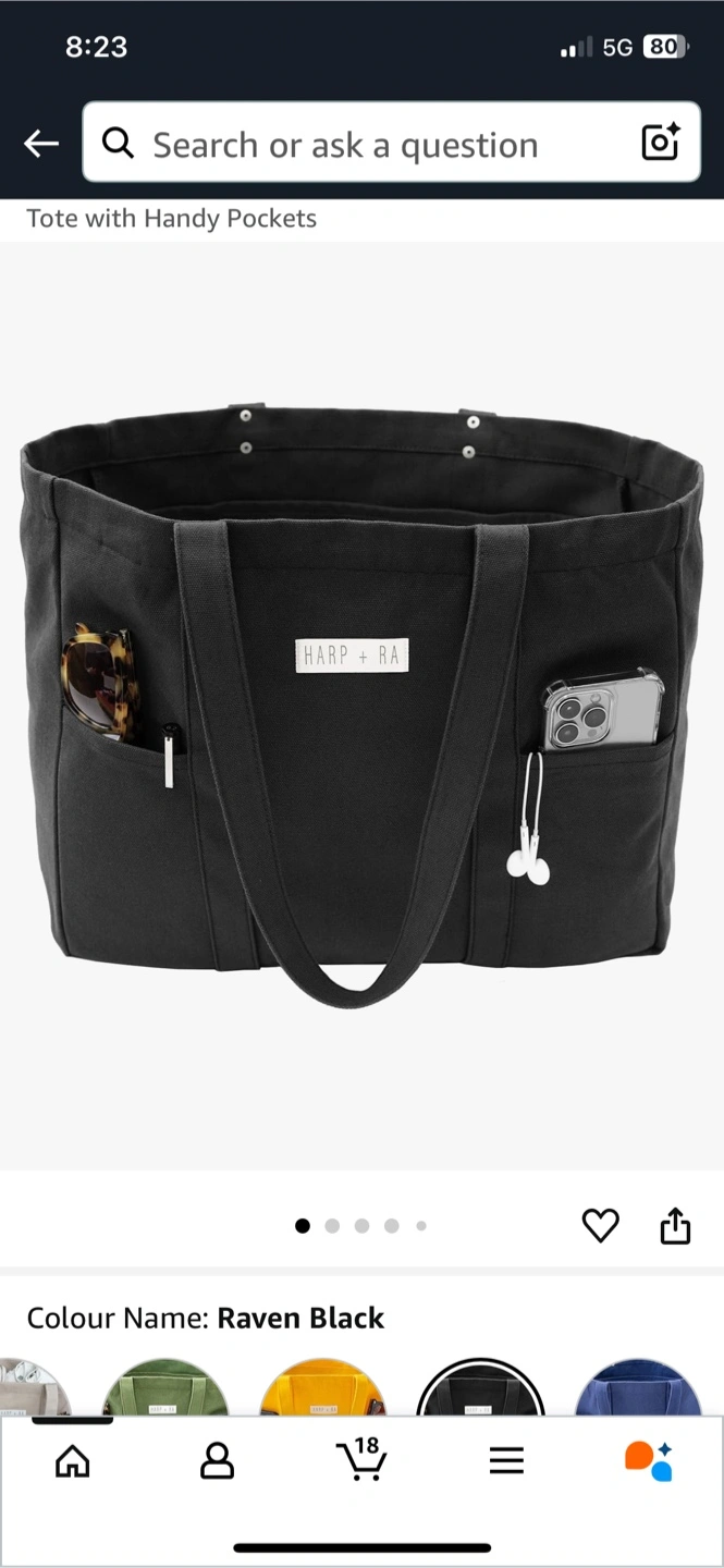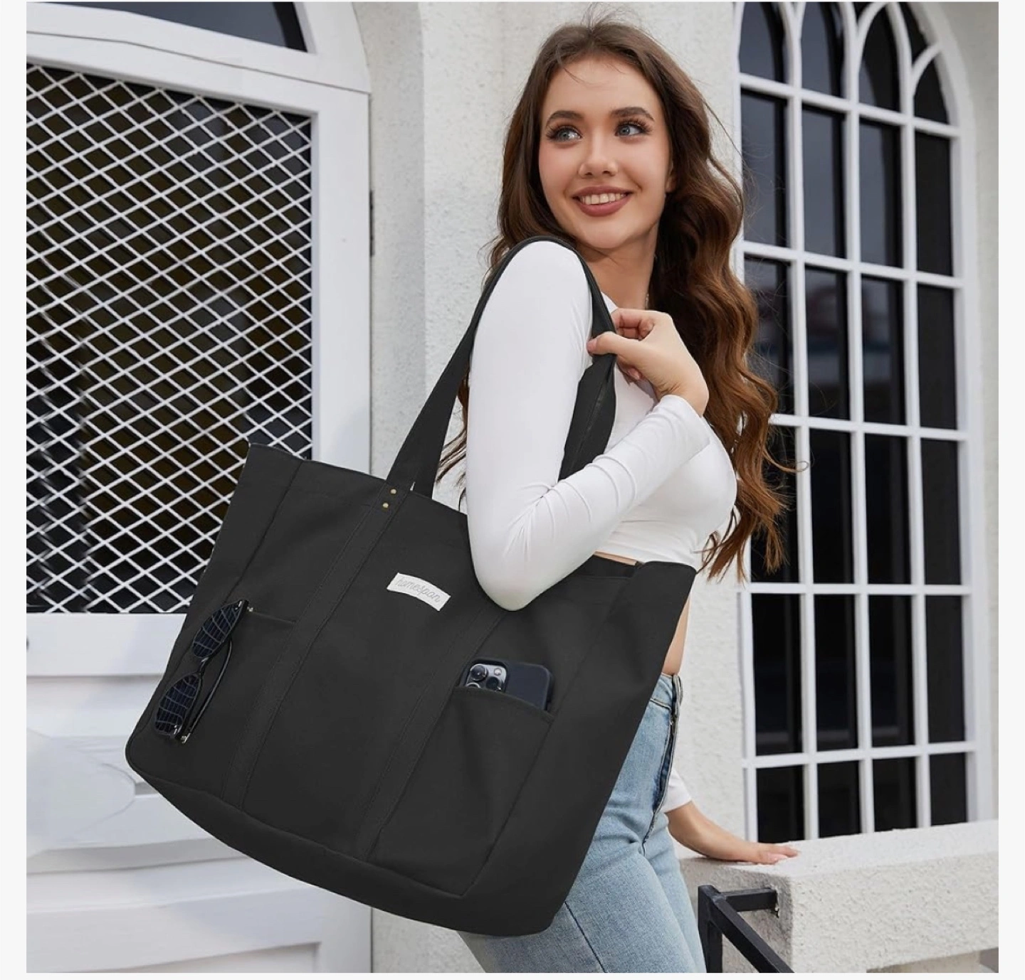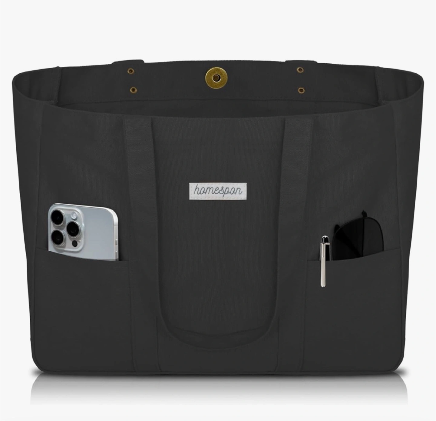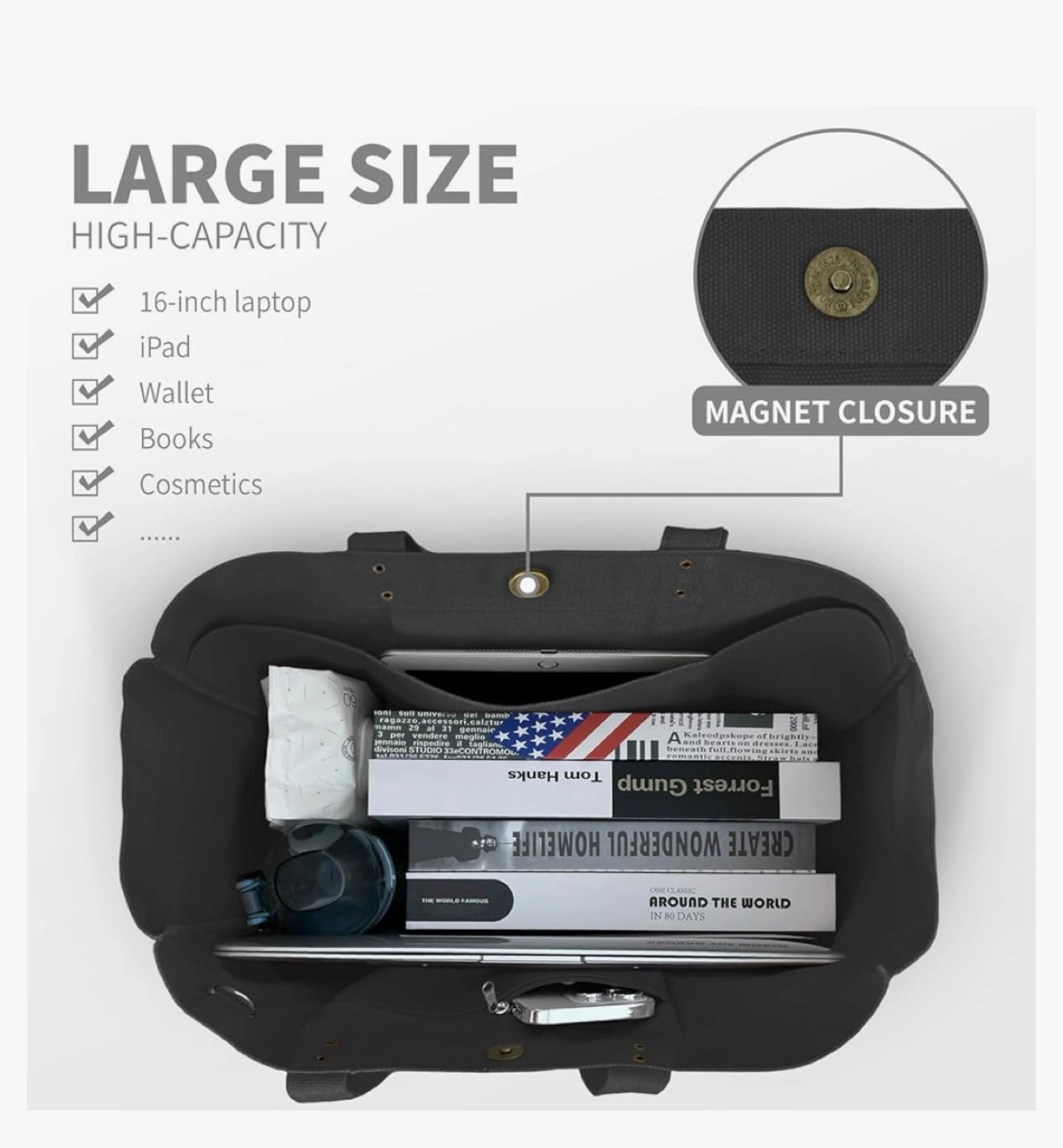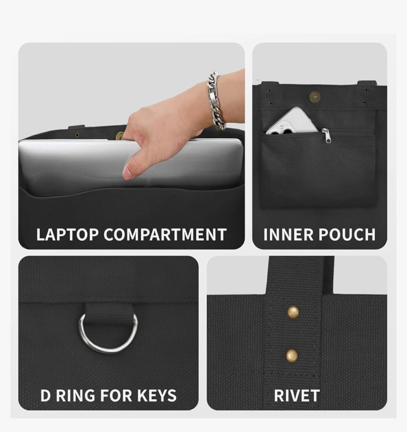 Large capacity tote bag. Features laptop compartment, inner pouch, and D-ring for keys. Magnet closure. Made of black canvas. Great for everyday use.
