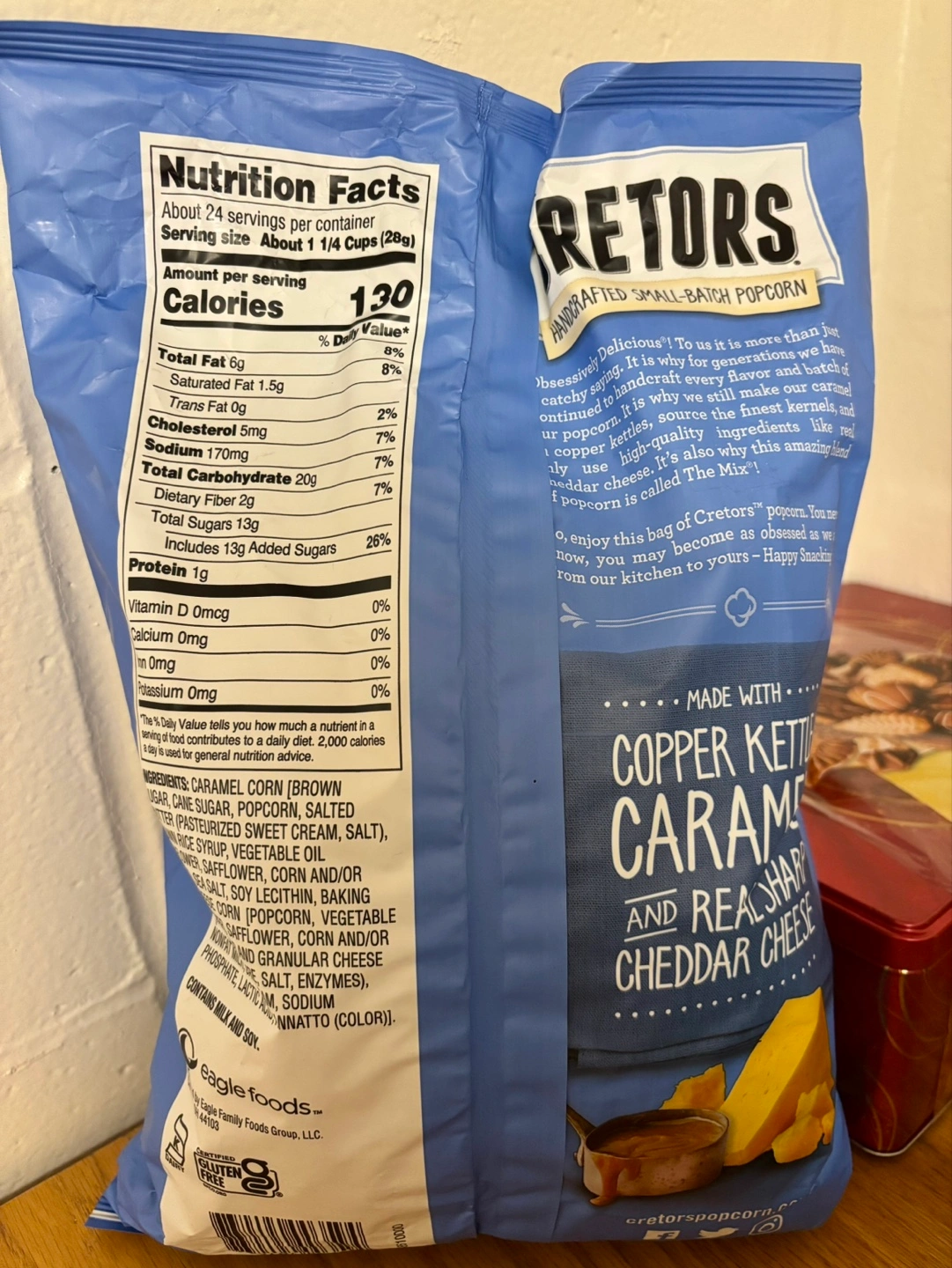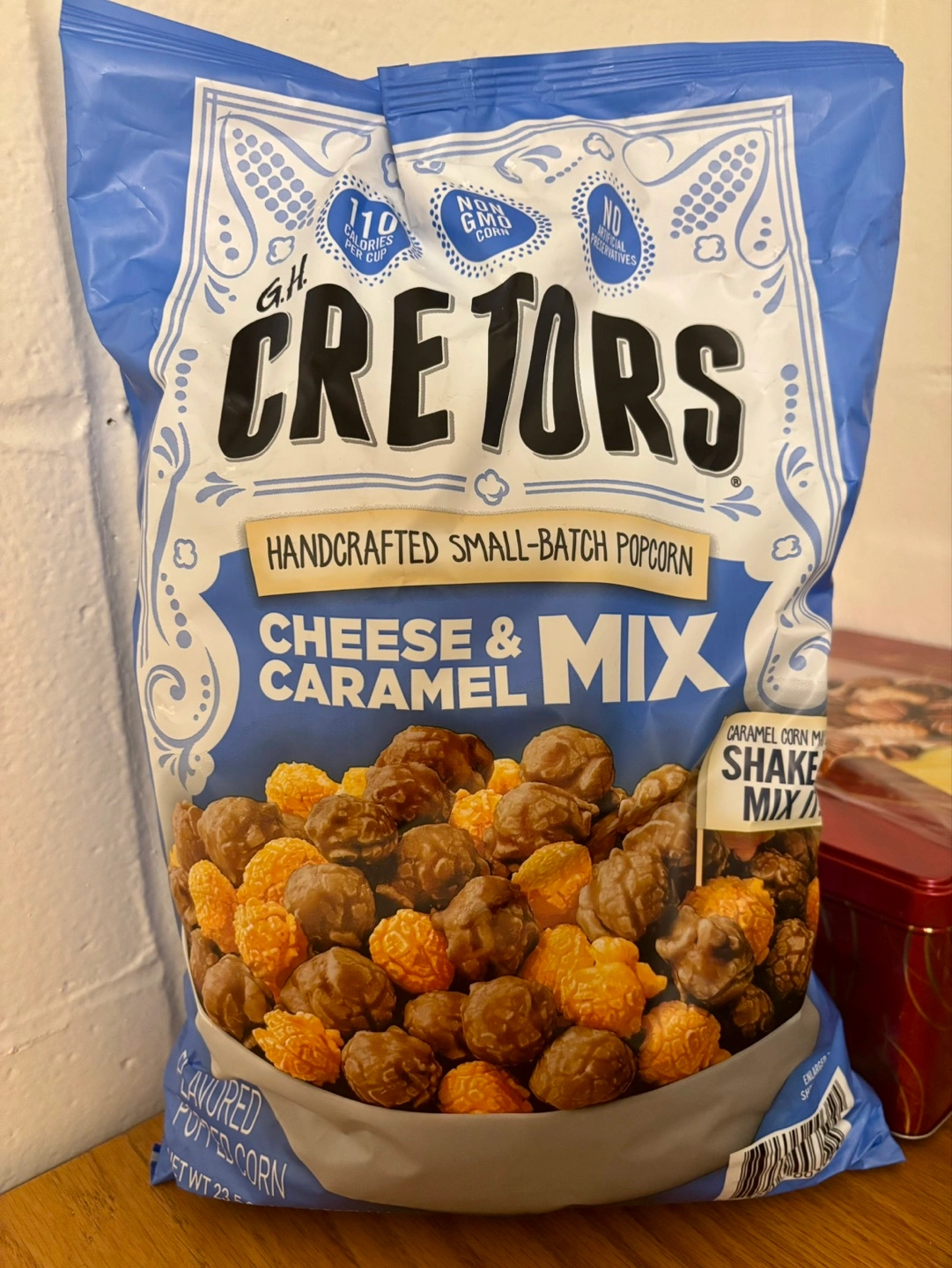 A bag of Crestor's Cheese & Caramel Mix popcorn. Handcrafted small-batch popcorn. Flavored popcorn. Contains caramel corn and cheddar cheese popcorn.