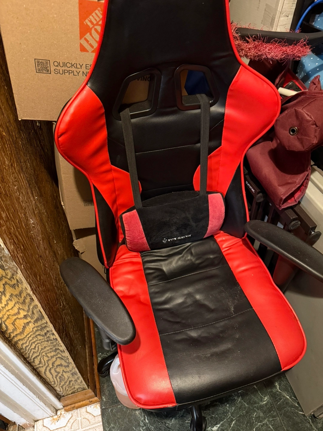 Comfortable racing-style chair. Red and black leather-like material. Includes head and lumbar support pillows. Good condition.