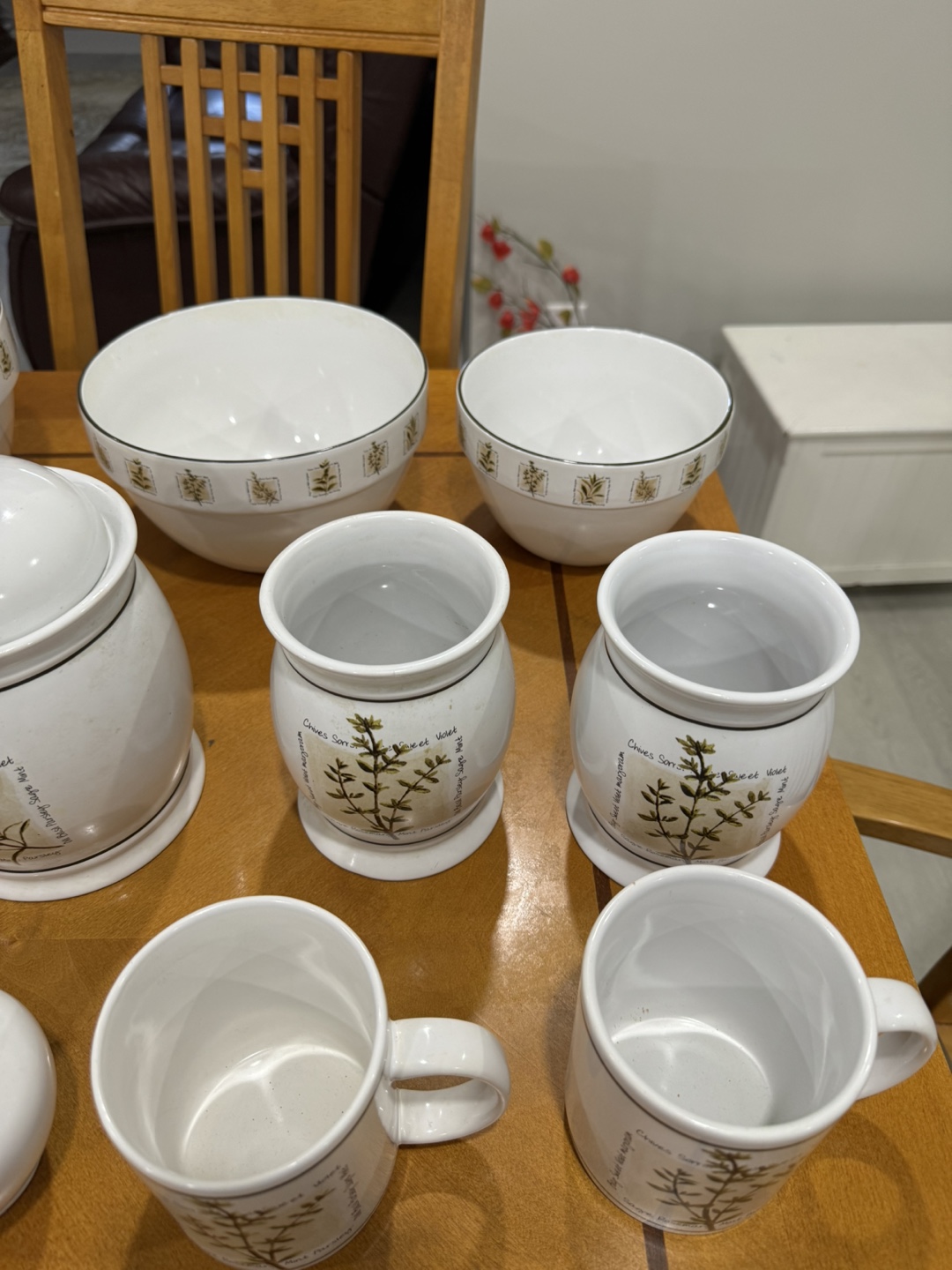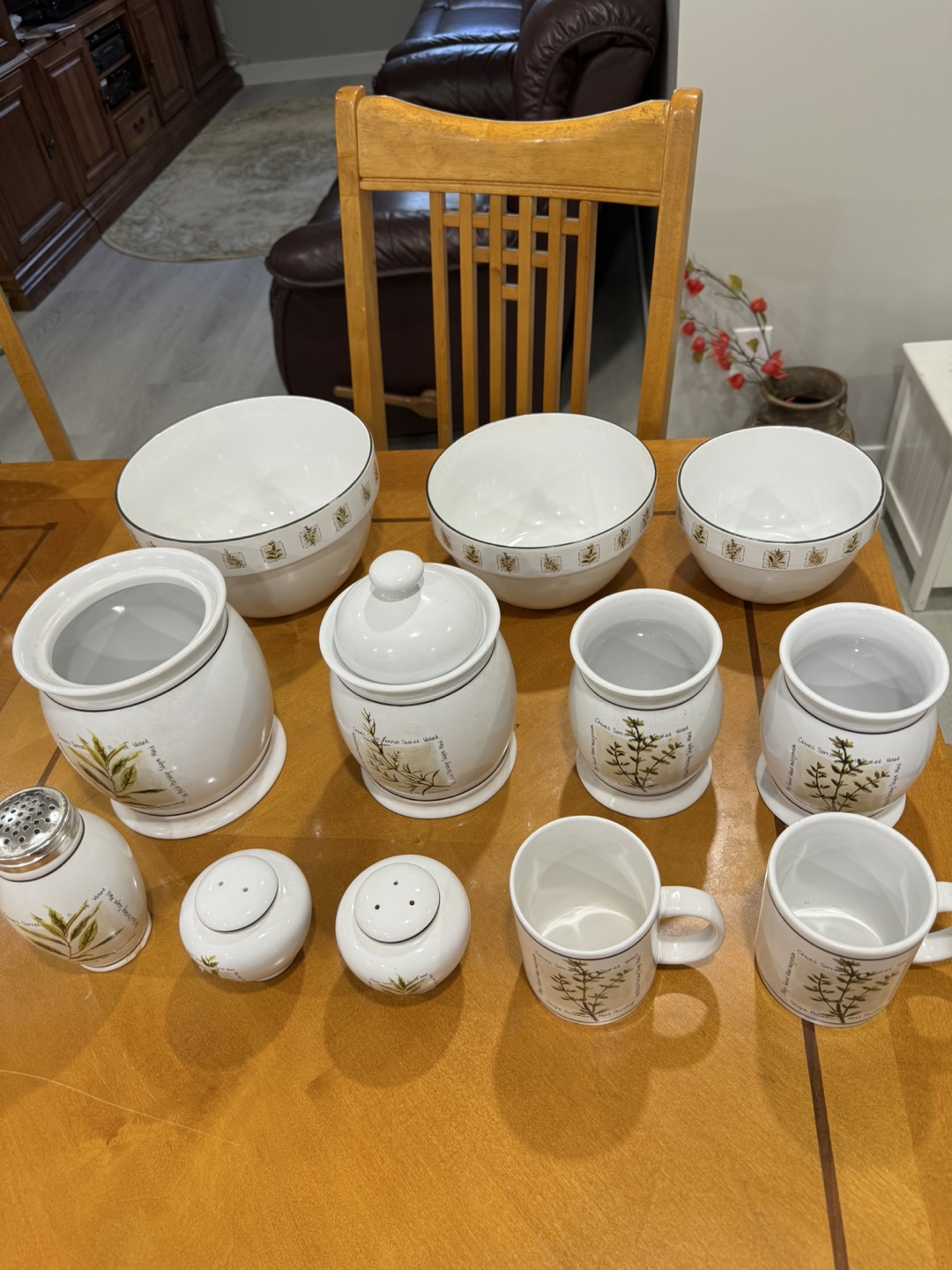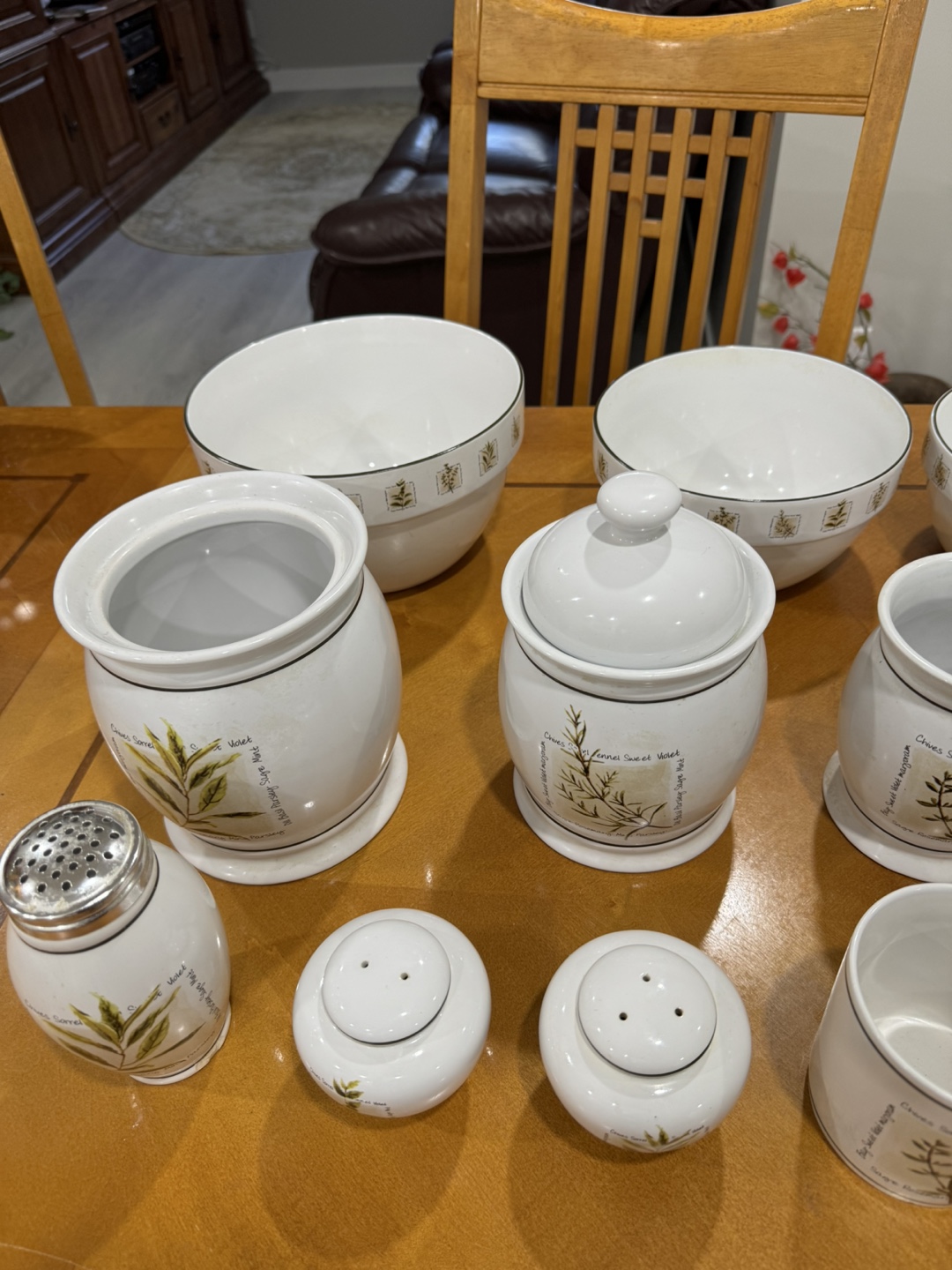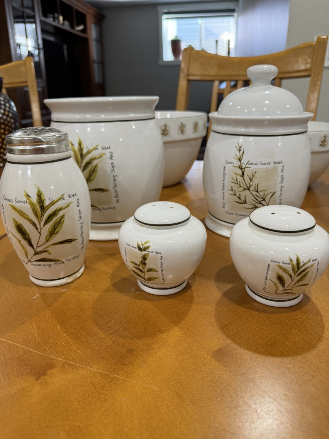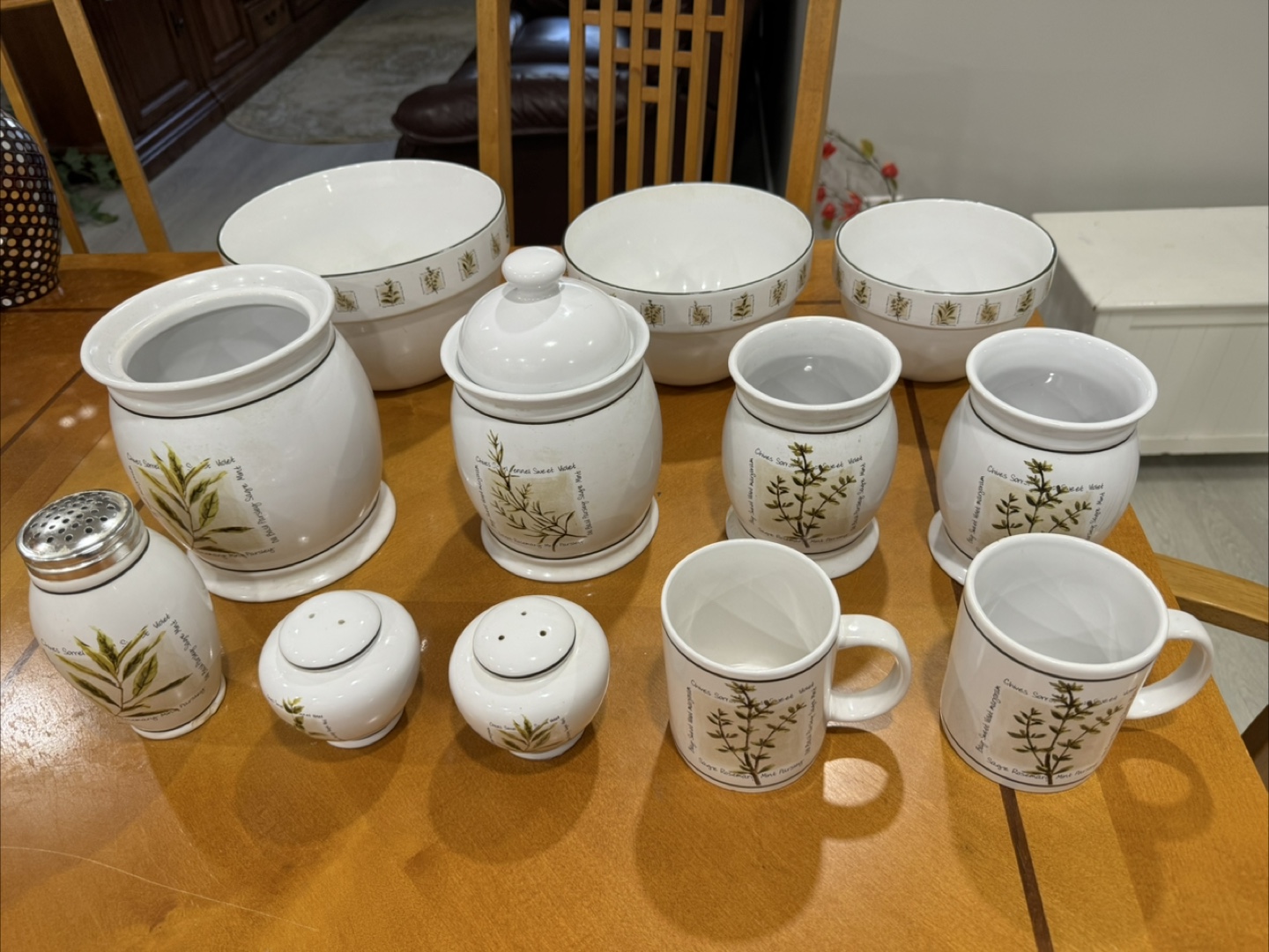 Beautiful ceramic kitchen canister set. Includes mugs, bowls, canisters, salt and pepper shakers. And 3 mixing bowls .Herb theme. Excellent condition.