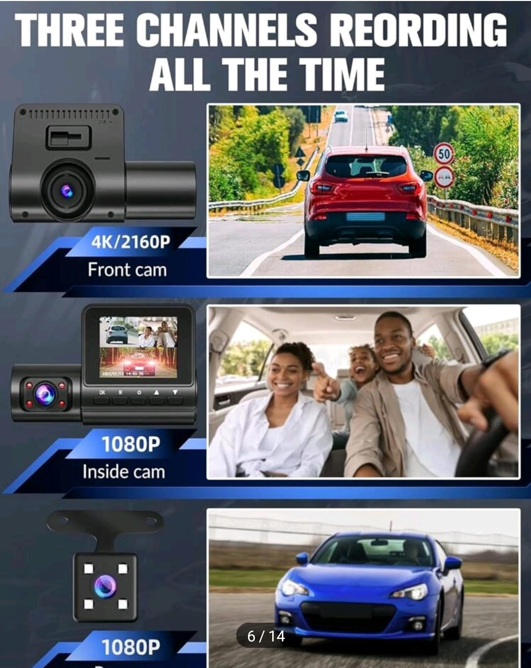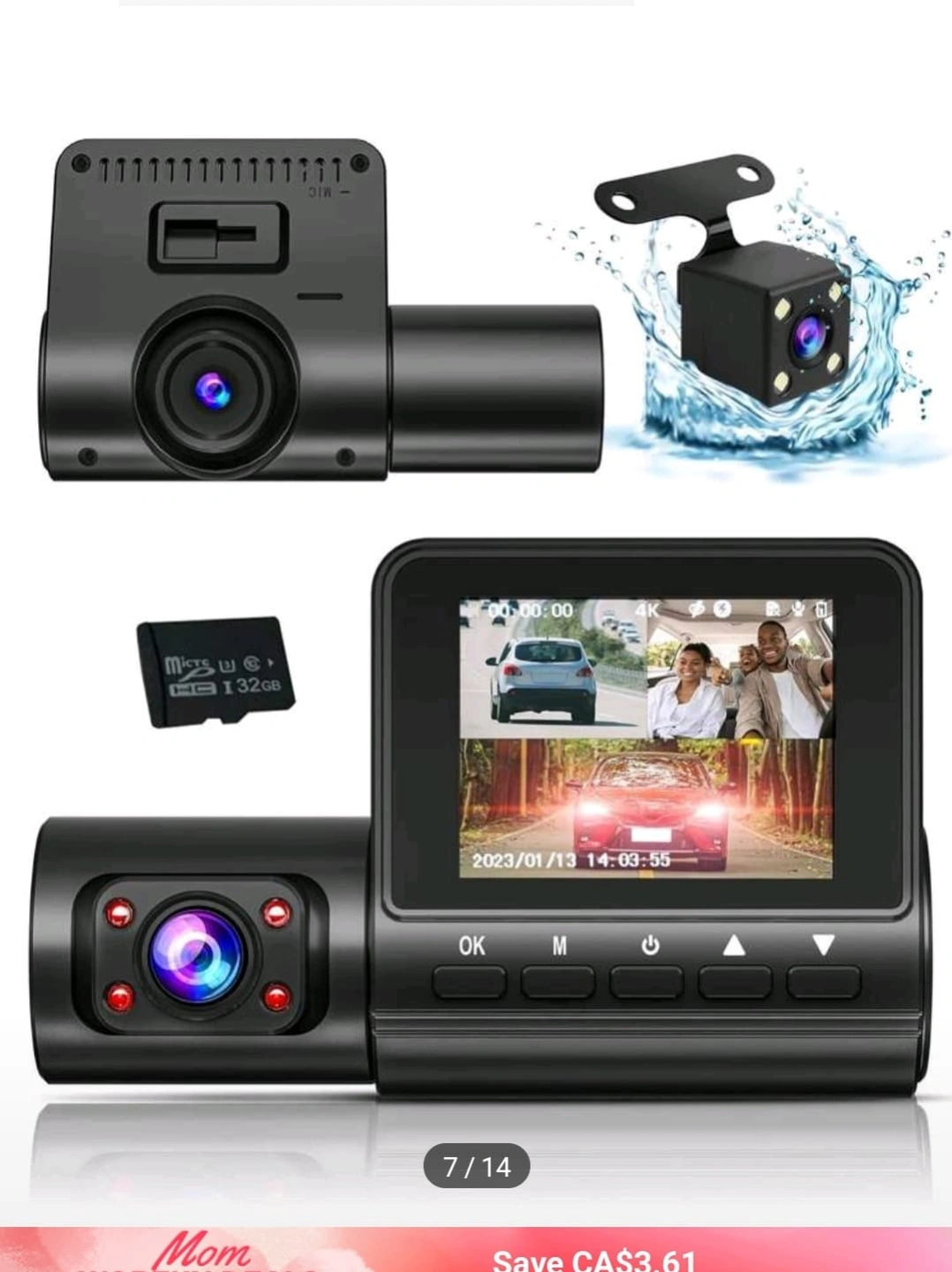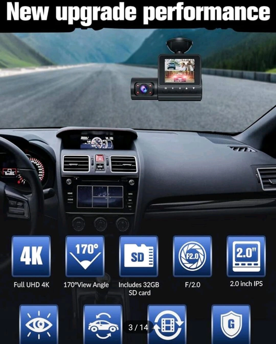 Full UHD 4K dash cam. Features three channels recording simultaneously. Includes a 32GB SD card. Boasts a 170° wide-angle view and night vision. 2.0 inch IPS screen. F/2.0 aperture. Wide dynamic range.
