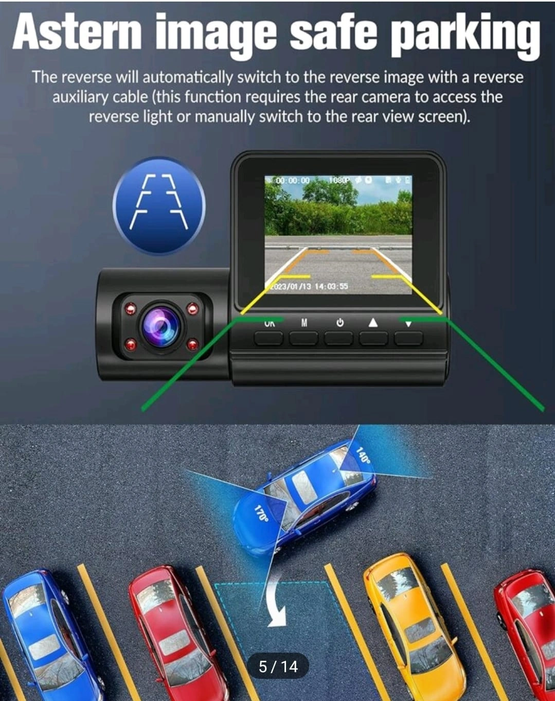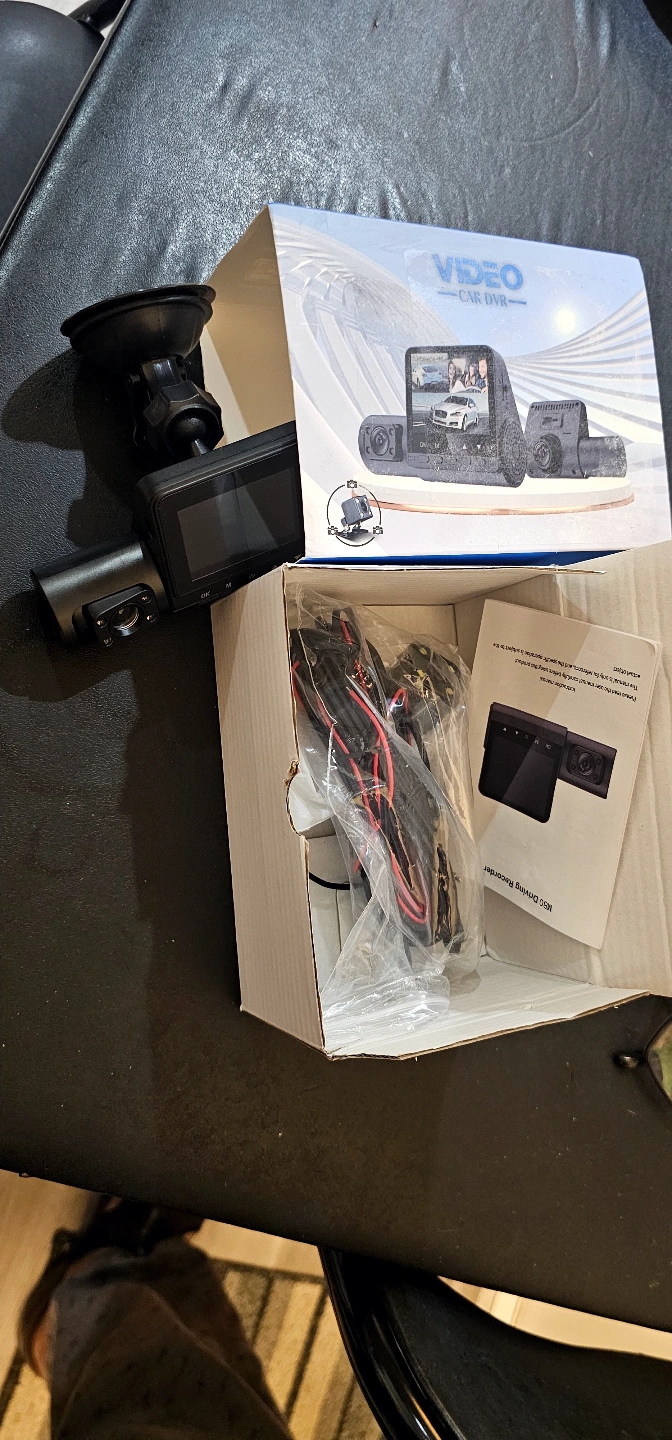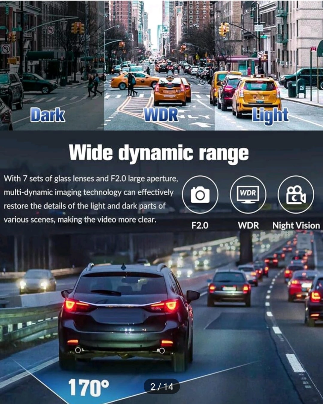 Full UHD 4K dash cam. Features three channels recording simultaneously. Includes a 32GB SD card. Boasts a 170° wide-angle view and night vision. 2.0 inch IPS screen. F/2.0 aperture. Wide dynamic range.