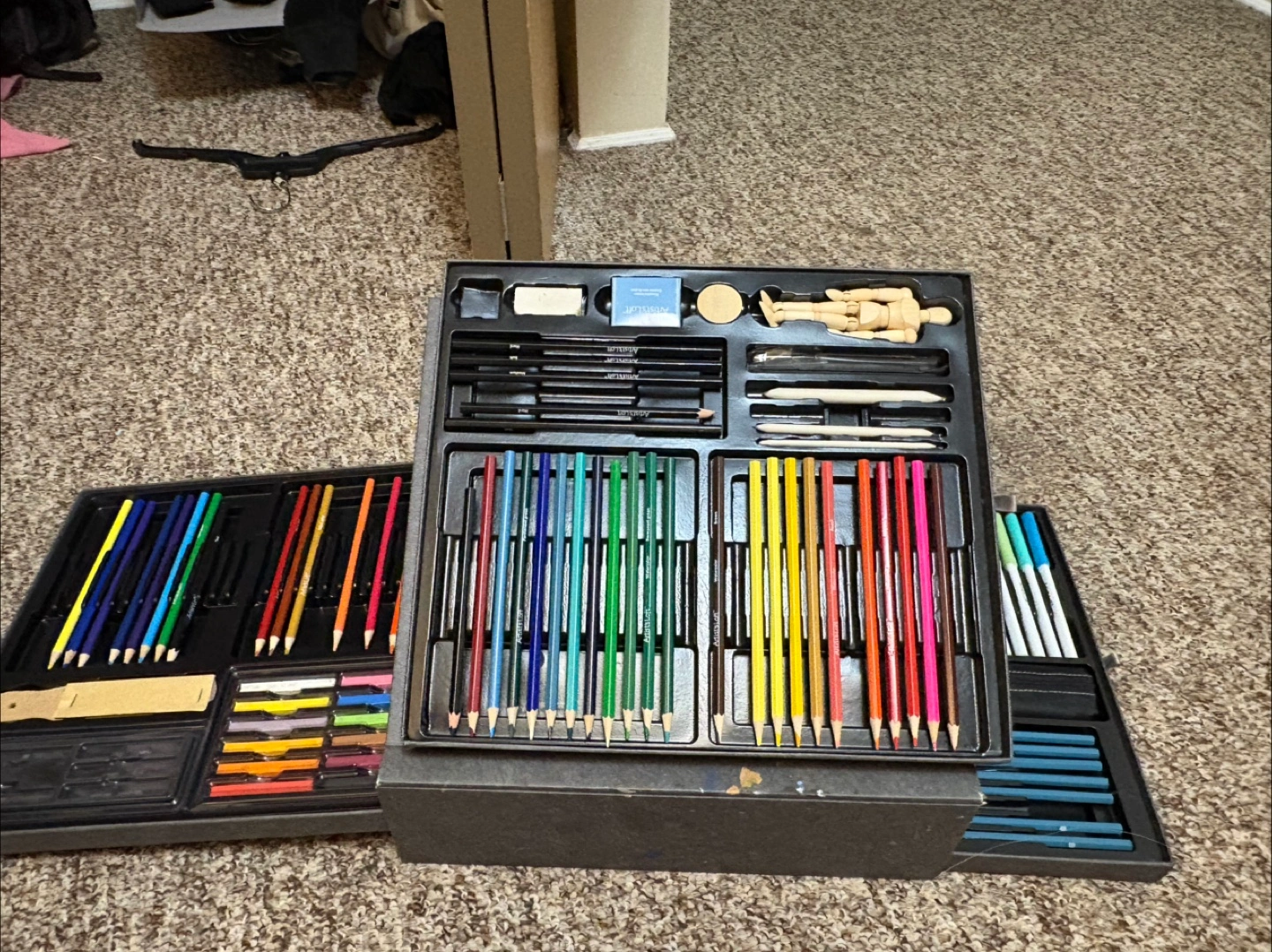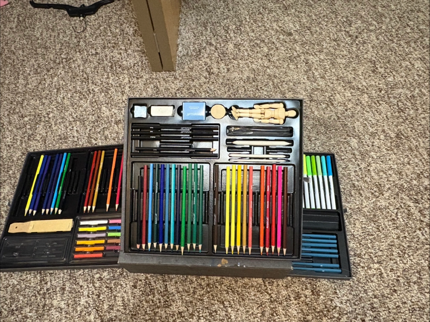 52Comprehensive art supply set. Includes coloured pencils, graphite pencils, charcoal, pastels, erasers, a kneaded eraser, a wooden mannequin, and more. All housed in a portable carrying case. Used so its missing a few colors but nothing has dried out.