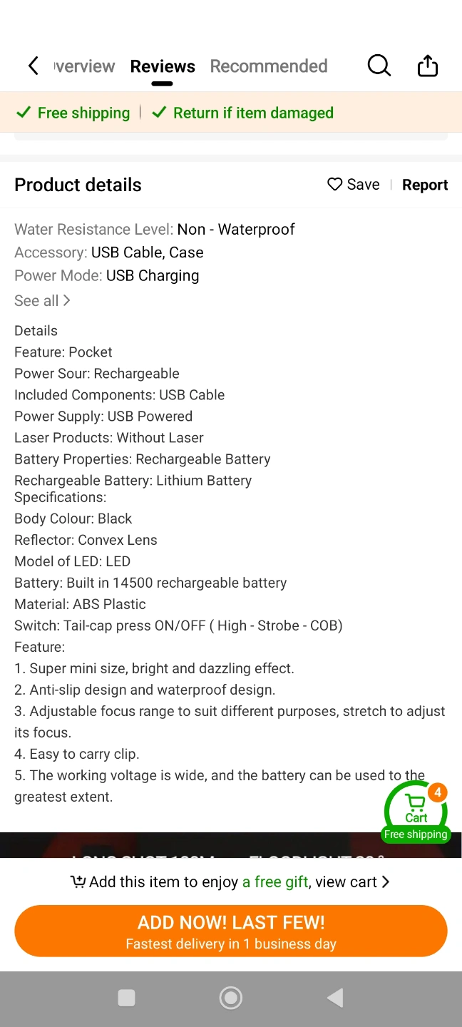 Portable mini LED flashlight with zoom. Multiple lighting modes. Pocket light with pen holder. Ideal for hiking and outdoor emergencies. Rechargeable lithium battery. USB charging. Waterproof. Includes USB cable. Anti-slip design. Bright and dazzling effect. Adjustable focus range. Easy to carry clip.