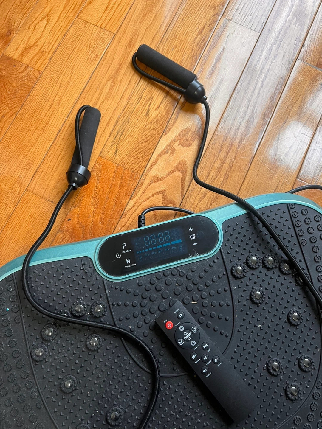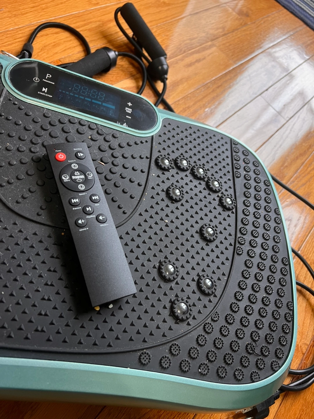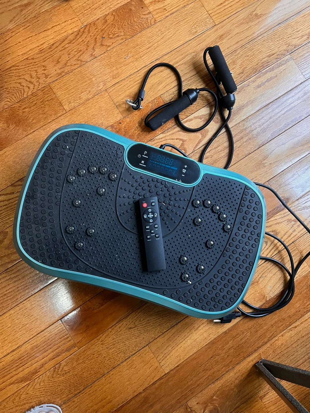Whole body vibration machine. Digital display, remote control. Resistance bands included. Bluetooth compatible with speakers to play your music. Good for fitness, lymphatic drainage and recovery.