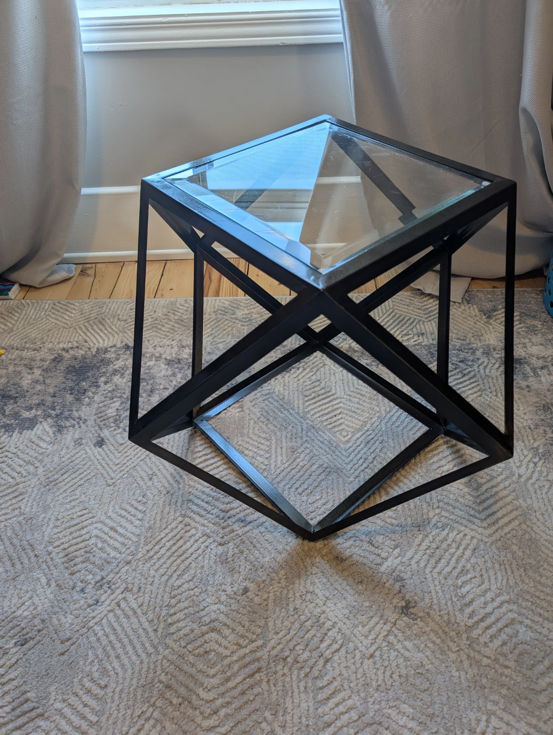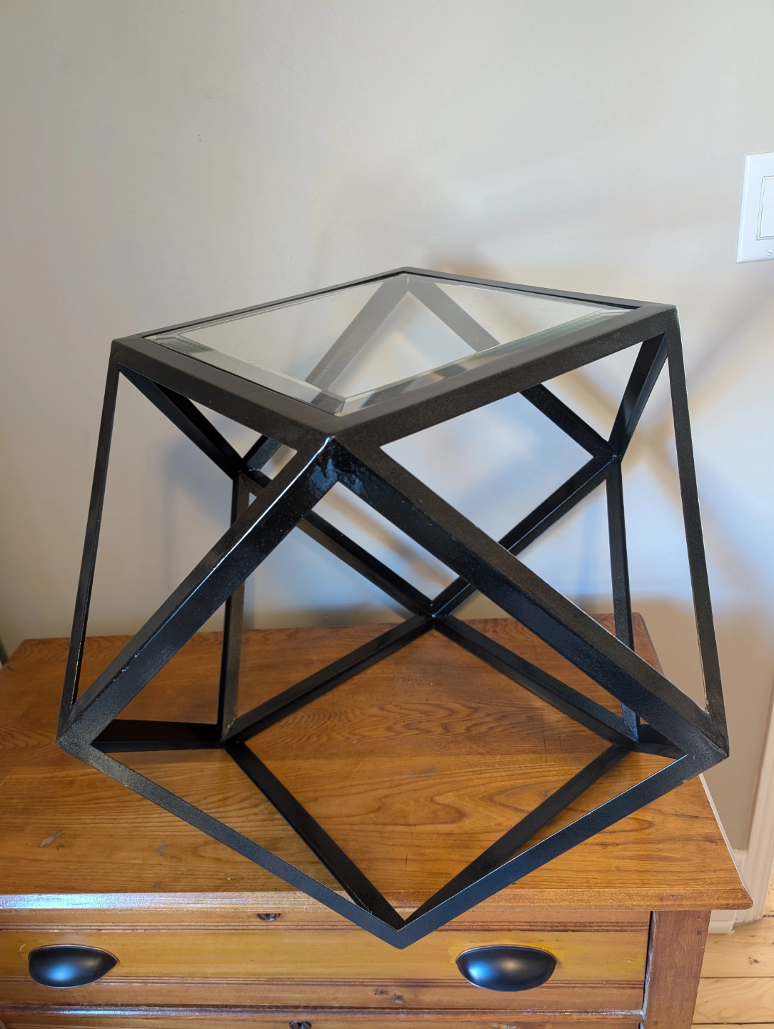 Unique side table. Features a geometric metal frame and glass top. Sleek, modern design.