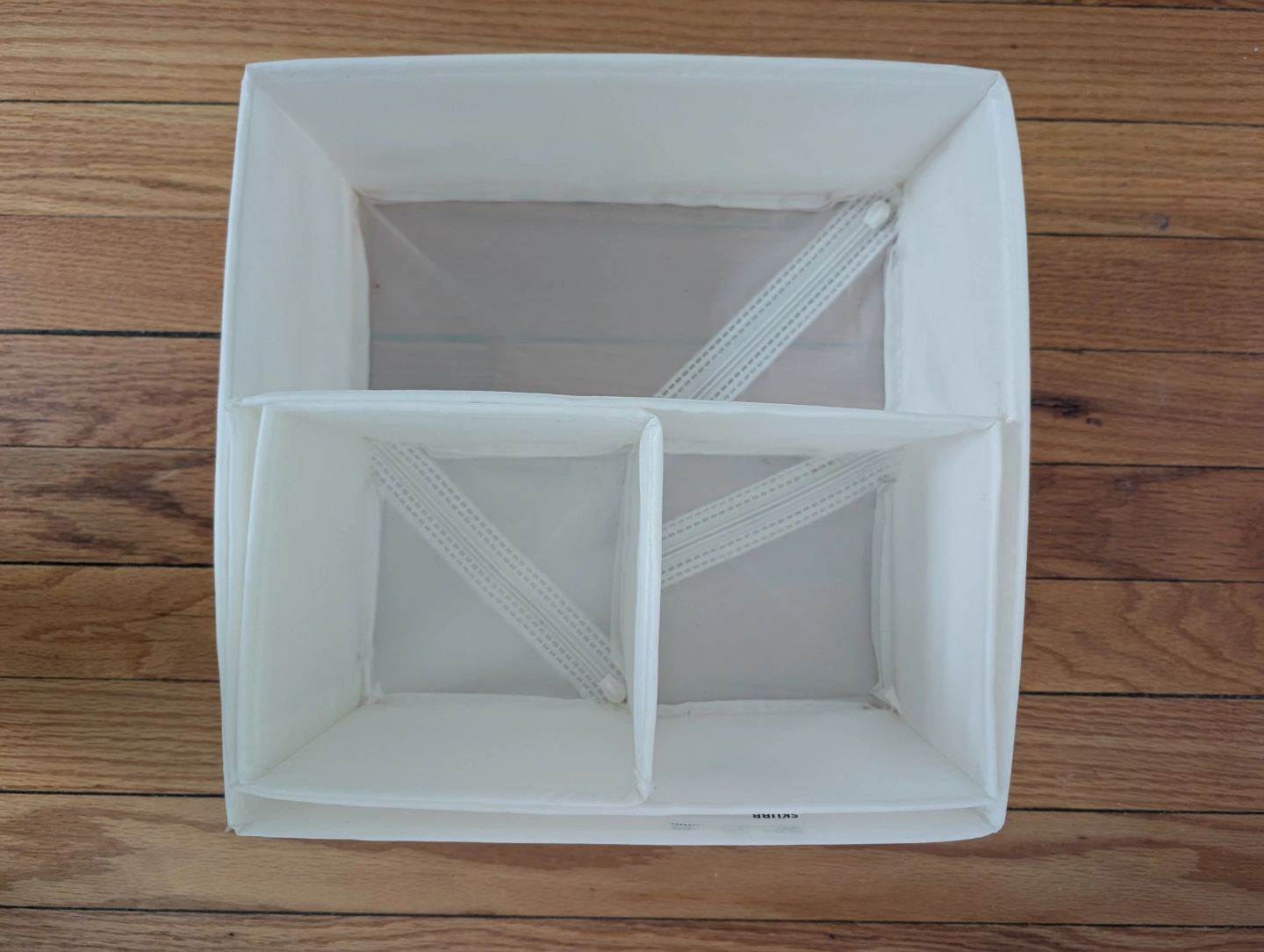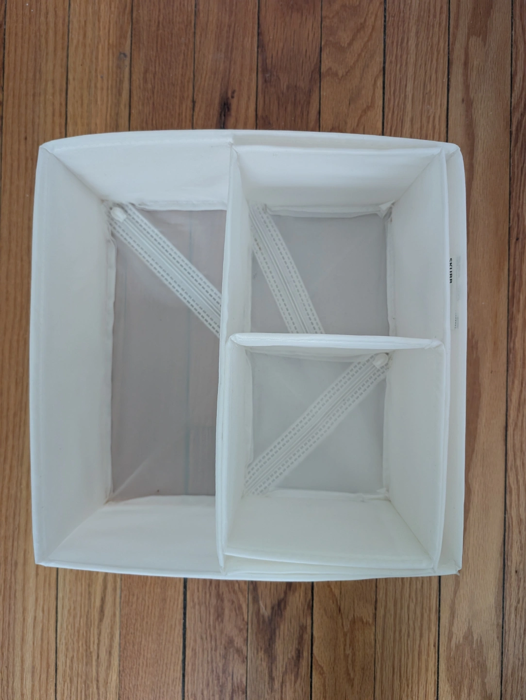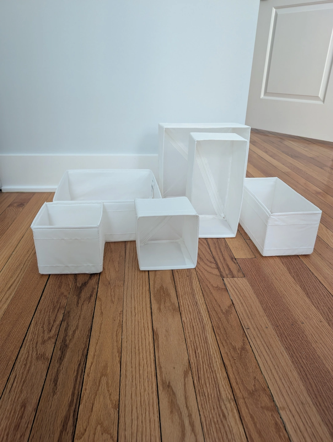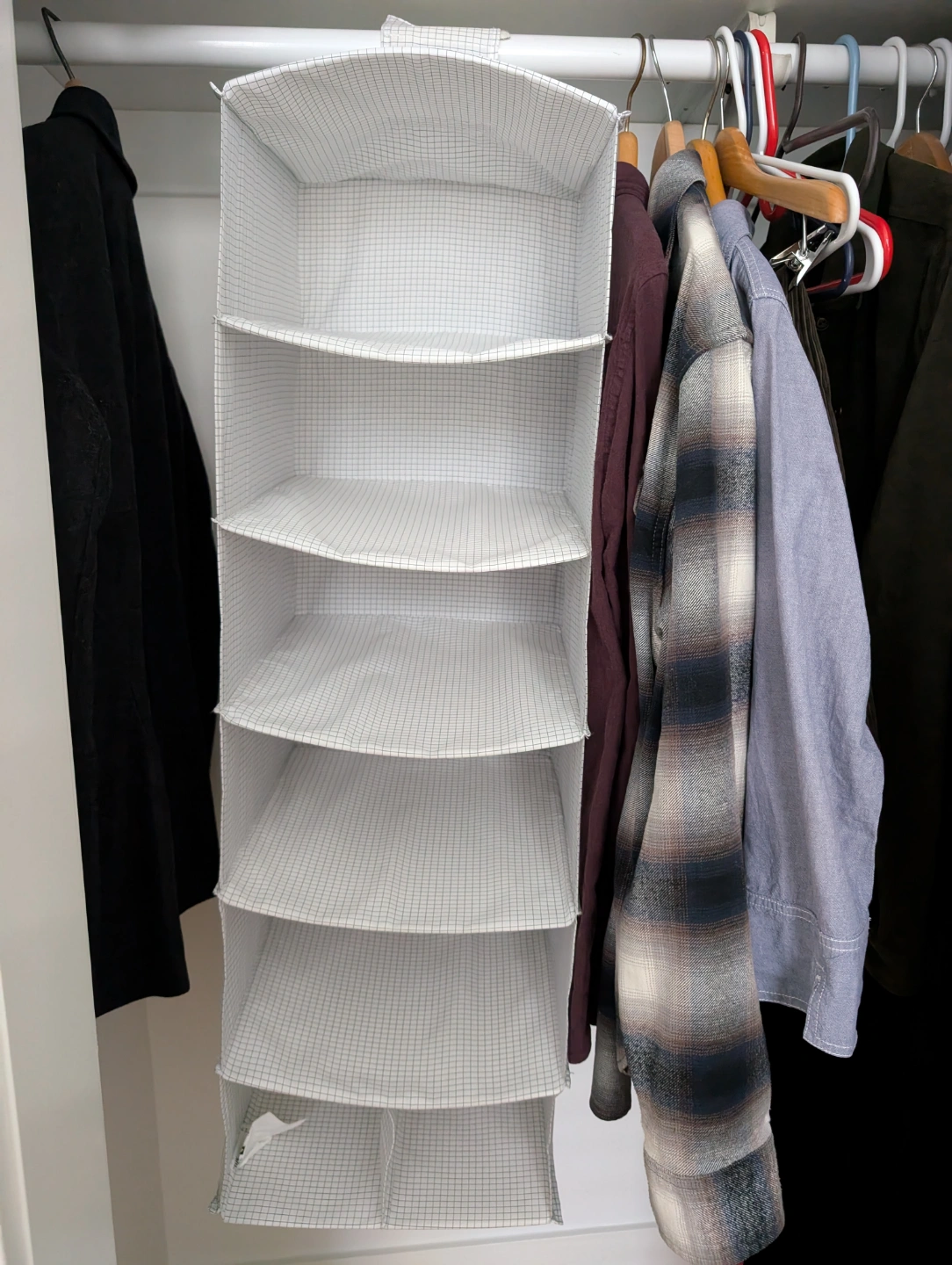 A hanging fabric closet organizer with matching bins. Great for organizing clothes, toys, or other items. Collapsible for easy storage. There's nothing wrong with it, I just don't need it anymore.