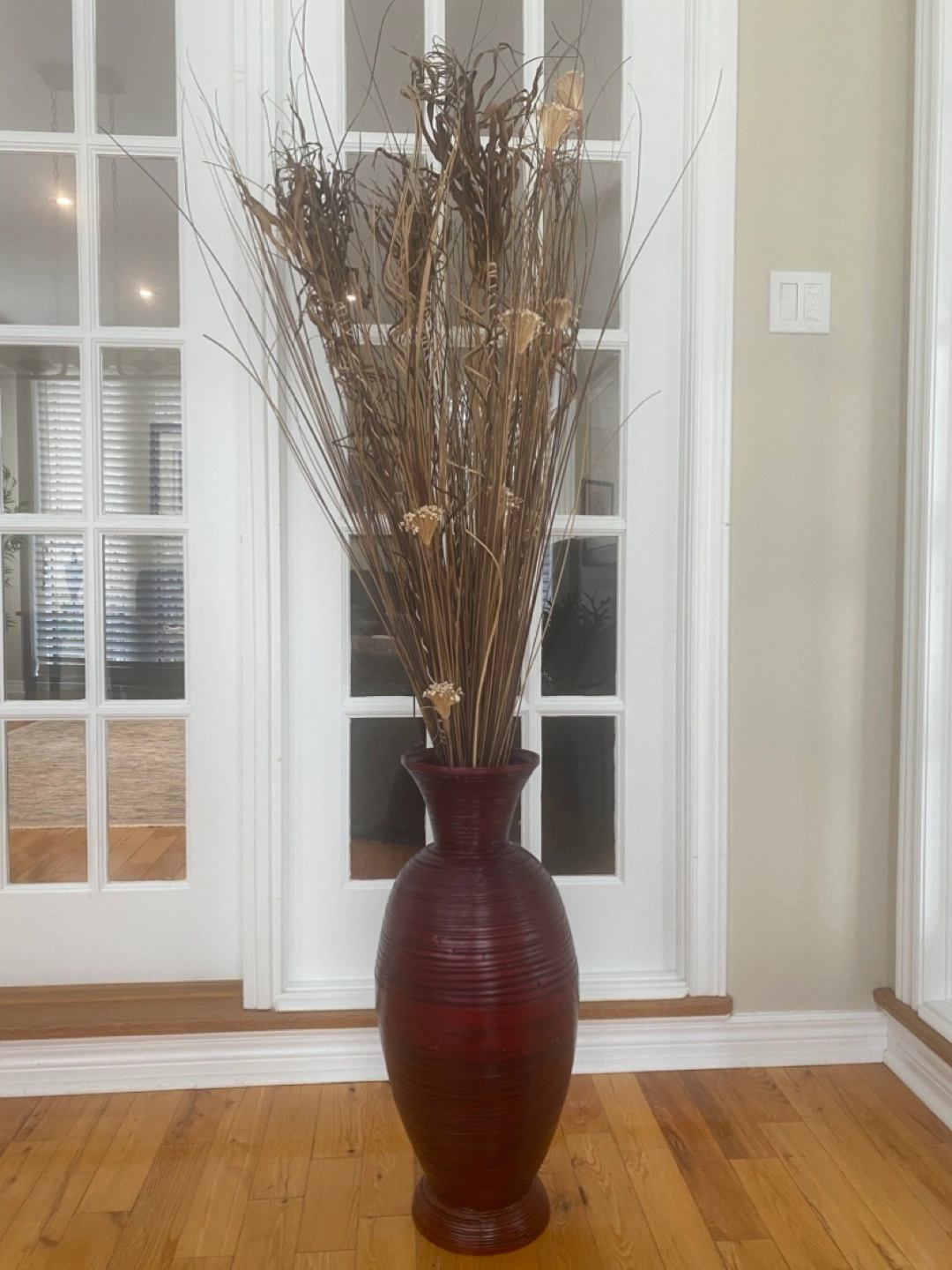 Bamboo Tall, dark red vase. Ribbed texture. Contains dried flowers and grasses. Perfect for home decor. Will compliment any room.