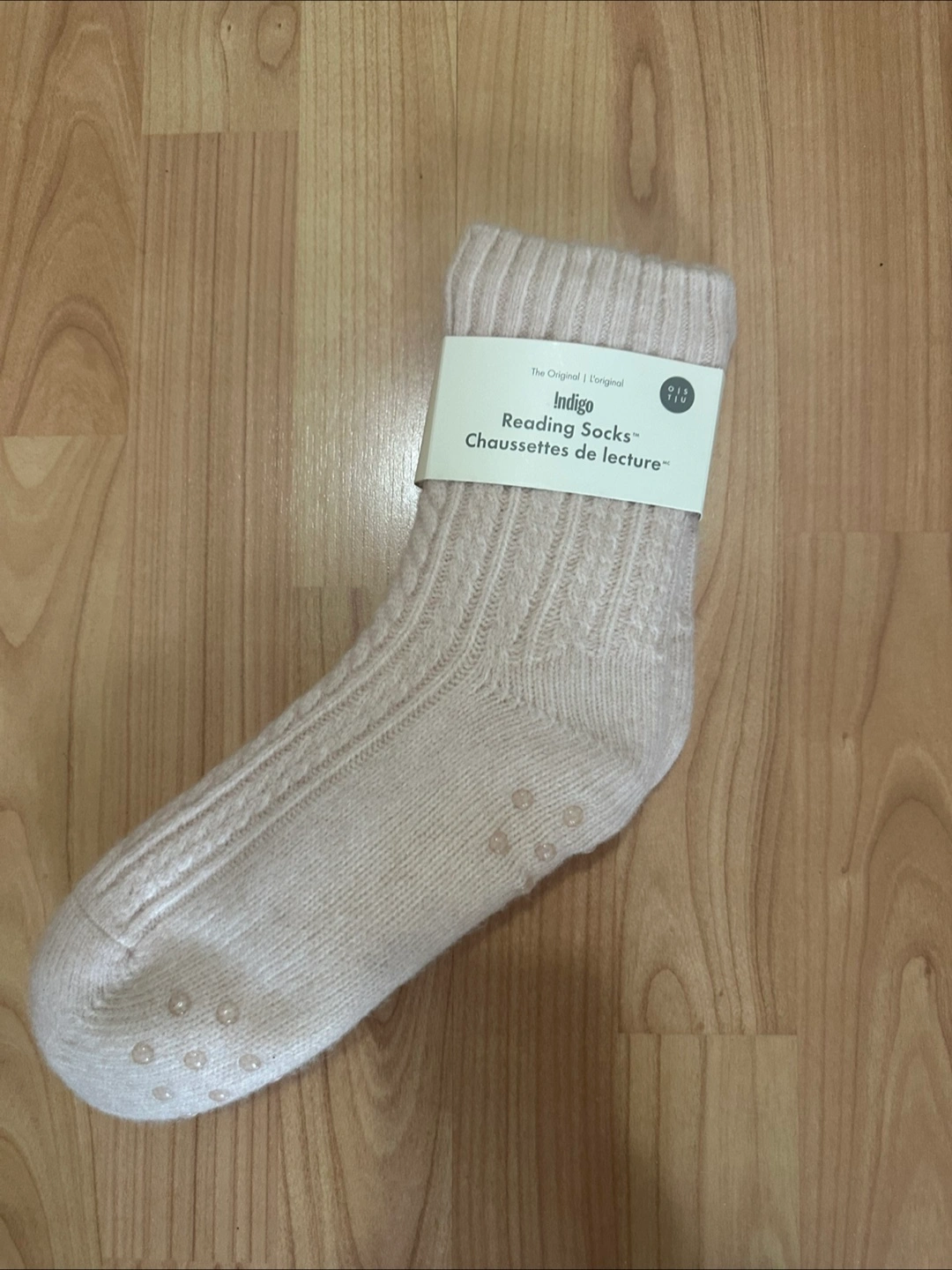 New in packaging. Light pink Indigo cozy reading socks /sock-slipper with non-slip grips on the soles of the feet.