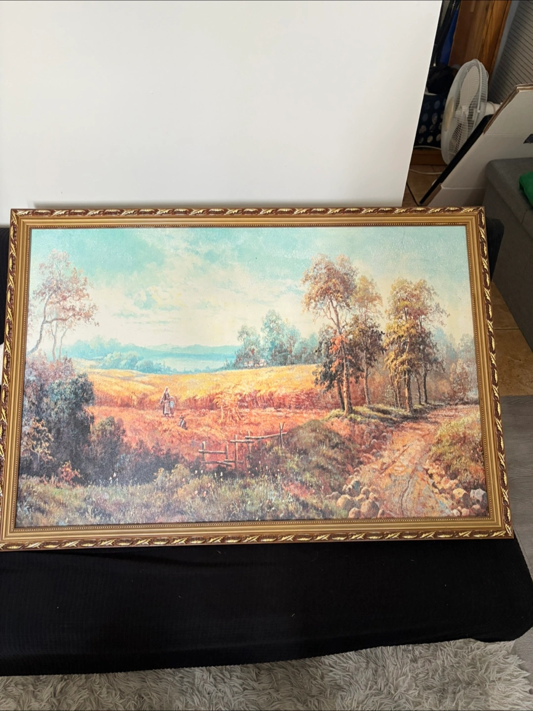 Beautiful landscape painting in a brown and gold frame. Depicts a rural scene with trees, fields, and a path. Measures approximately 40" x 20". Looks great on a wall or blank space