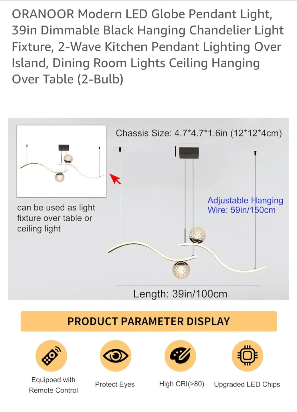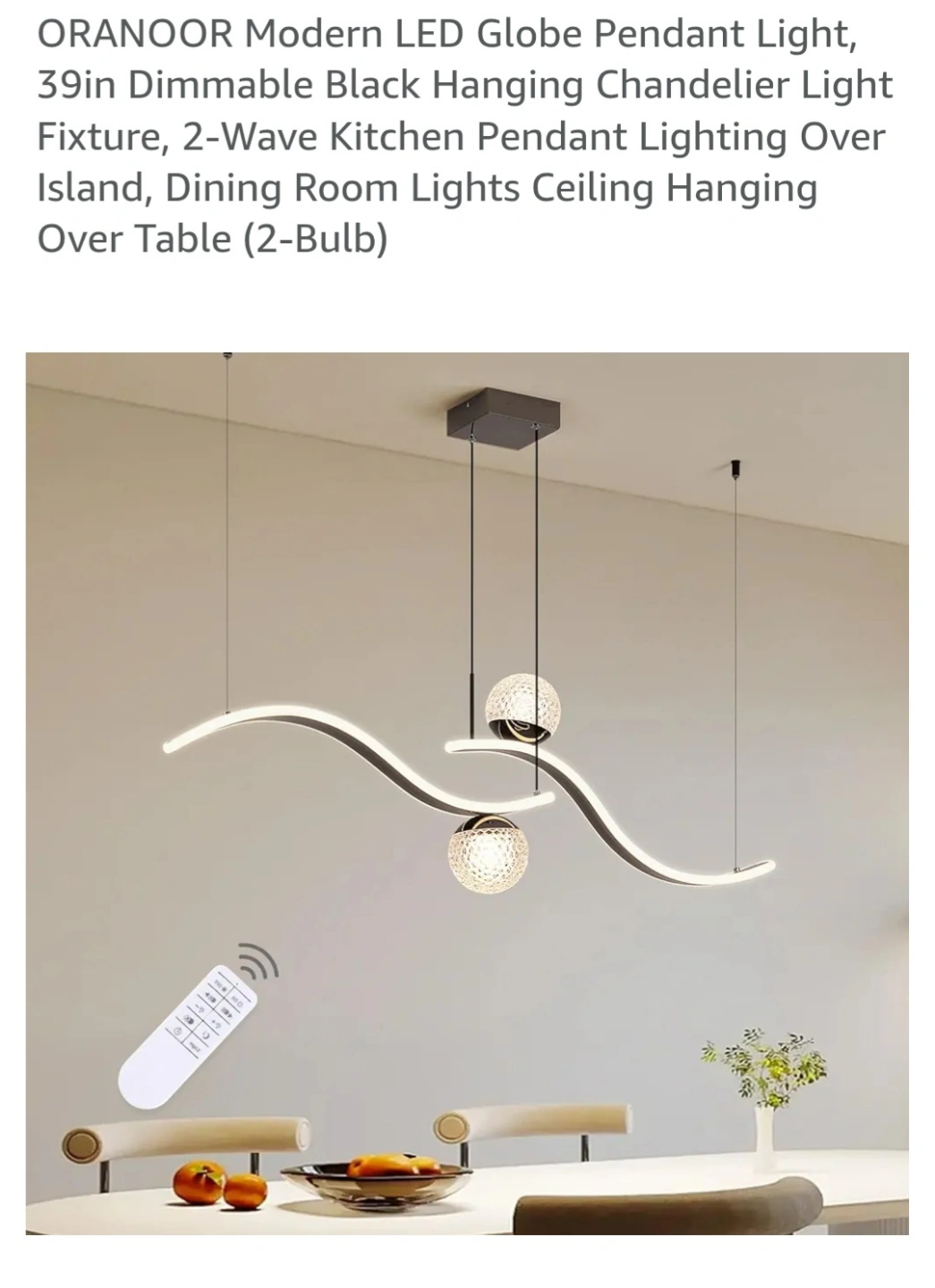 39in Dimmable black hanging chandelier. Two-wave design. Kitchen island or dining room lighting. Ceiling hanging light over table. Includes remote control. Two bulbs. Brand new - open box.
