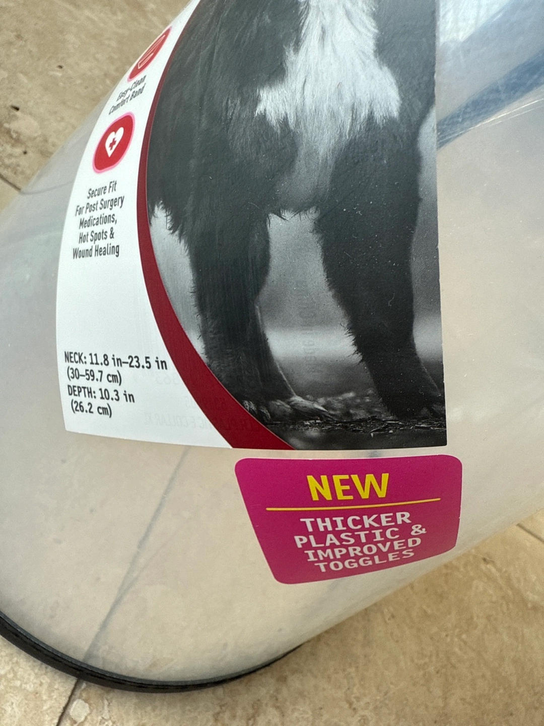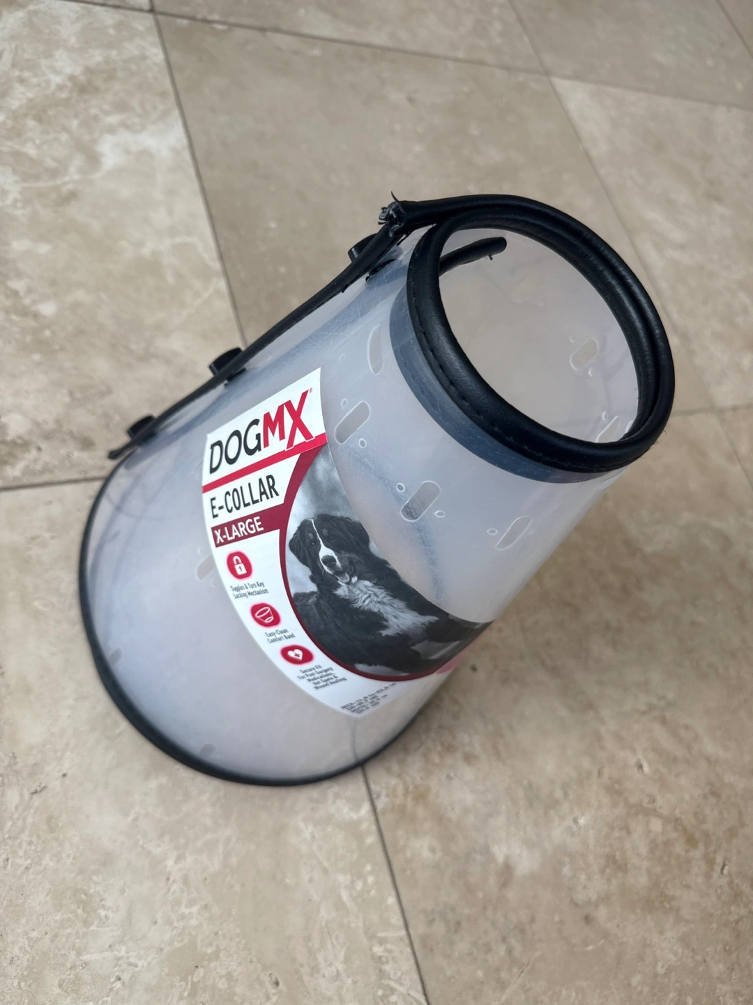 Little used DOGMX e-collar. X-Large size. Clear plastic. Features toggles & turn key locking mechanism. Easy-clean comfort band. Secure fit for post surgery, medications, hot spots & wound healing.