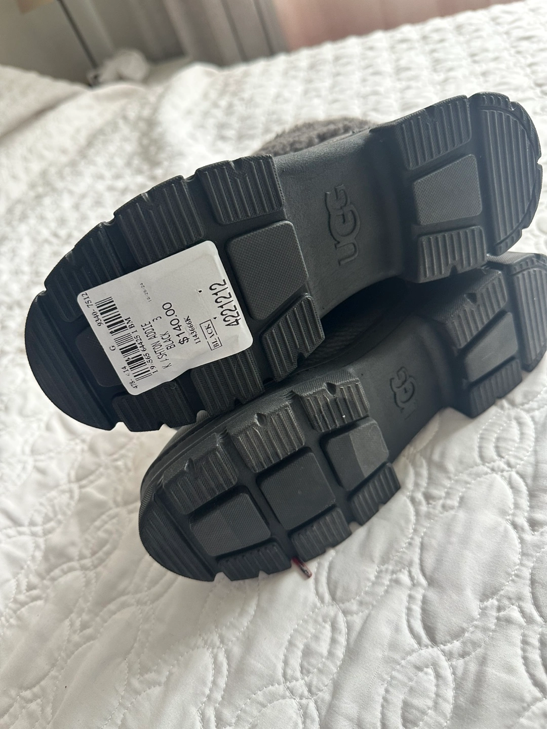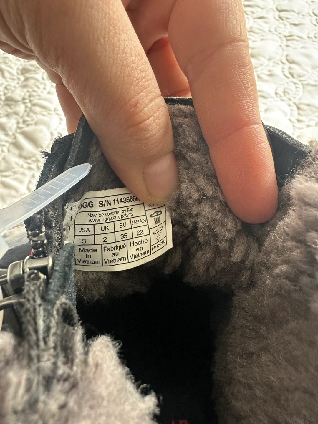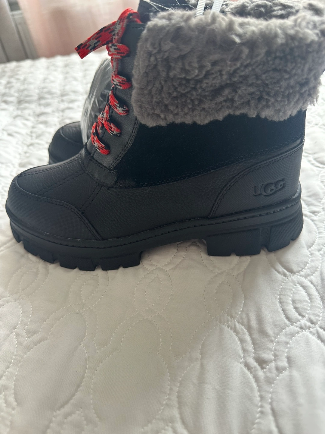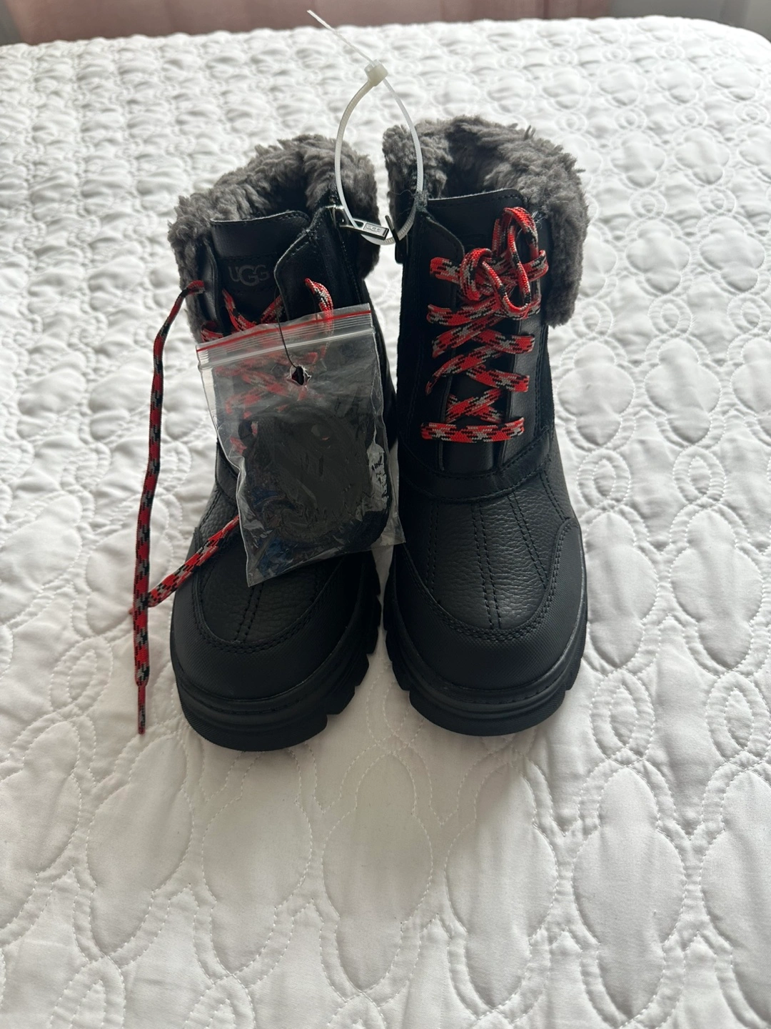 Black leather UGG kids' winter boots. Lace-up style with grey faux fur trim. Size 3. New with tags. Yonge and st Clair is location