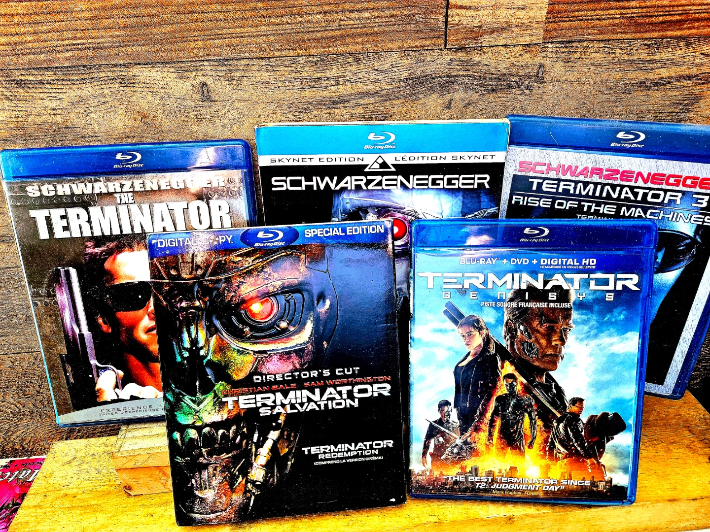 Five Terminator Blu-ray discs. Includes The Terminator, Terminator Judgement day, Terminator Salvation, Terminator Genisys, and Terminator 3: Rise of the Machines. Different editions and special features.