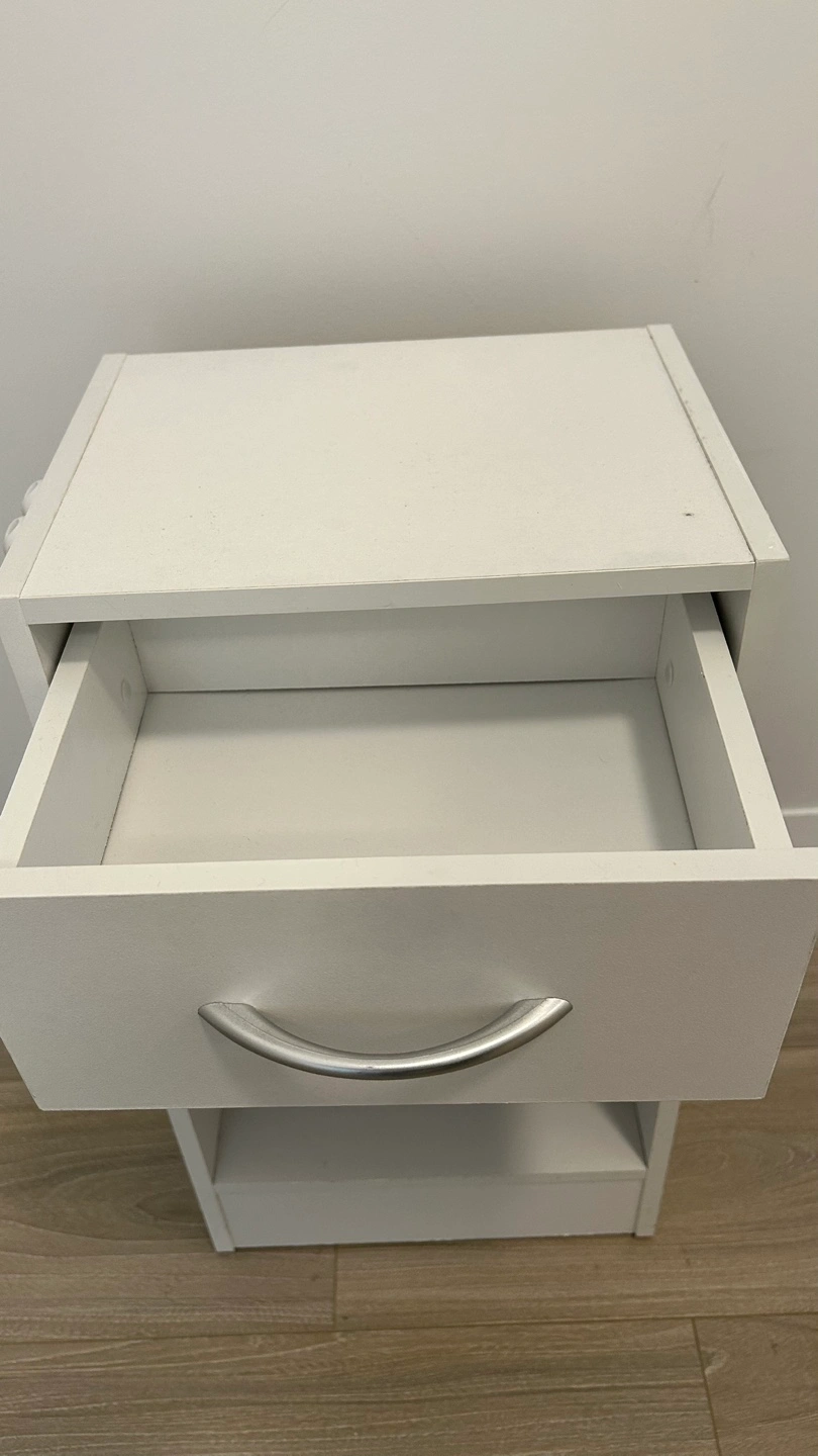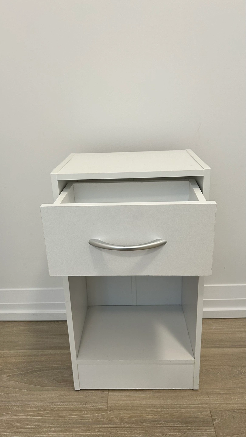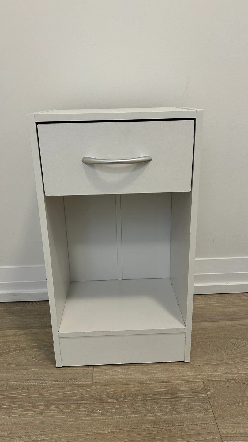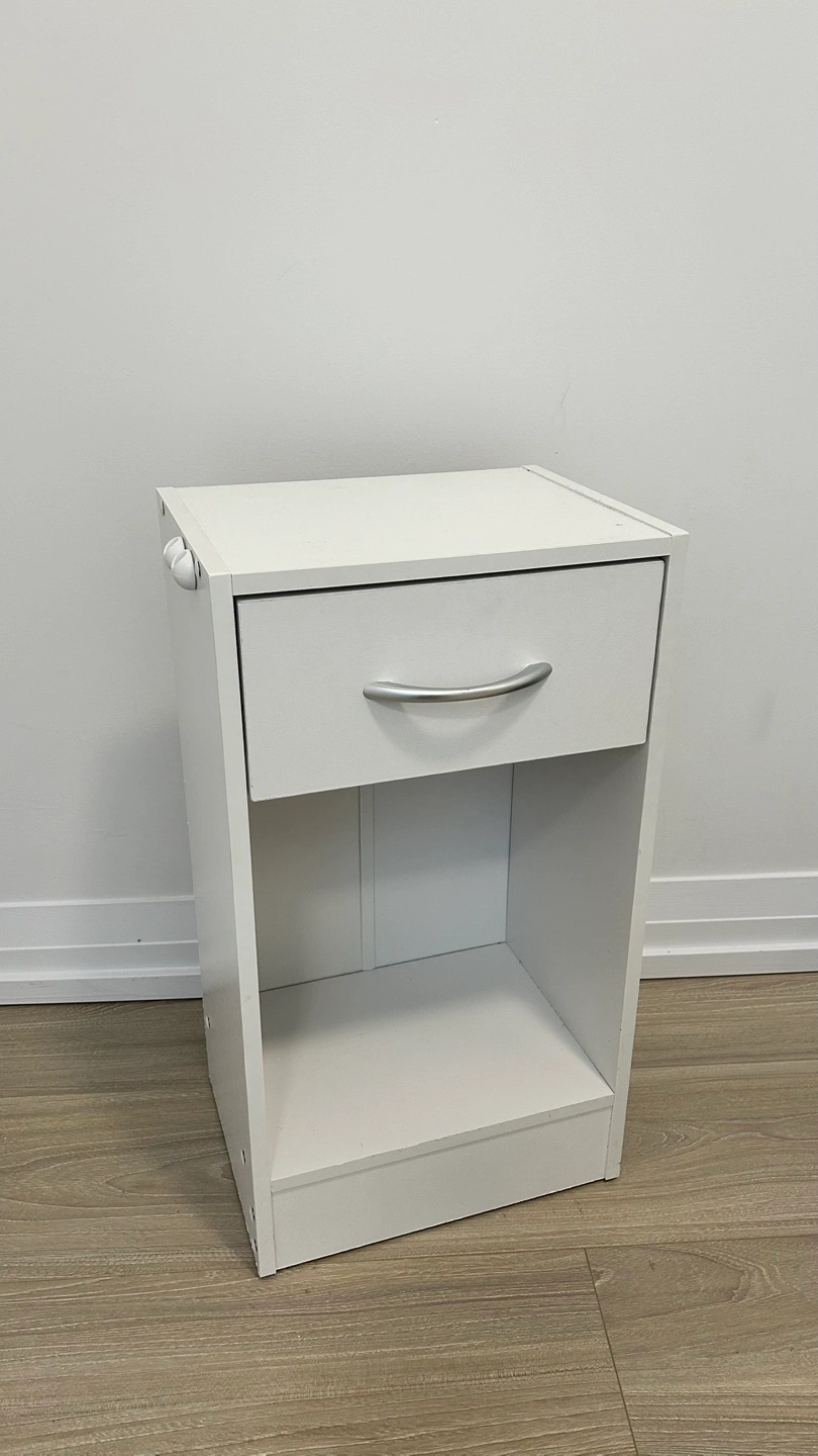Mini bedside table (Very Small) white. One drawer and open shelving. Perfect for a bedroom or small space. Measures: