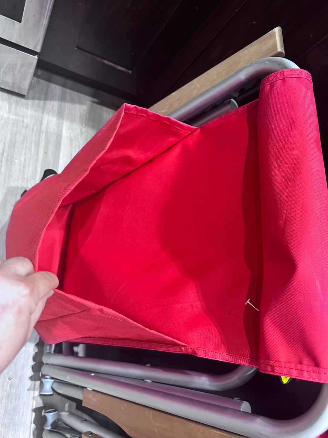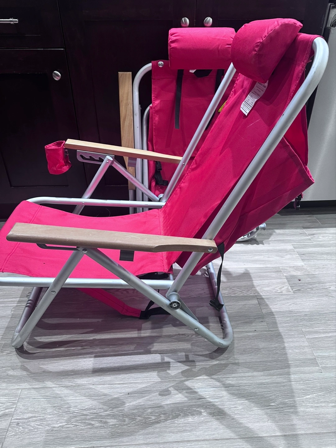 Pair of portable folding chairs. Red fabric, aluminum frame, and wooden armrests. Includes cup holders and headrests. Great for outdoor events. Has big compartment in the back for all your beach blankets, clothing and accessories. Paid over $100 each. Selling two for the price of one. Great for Vancouver folk fest, fireworks and beach days