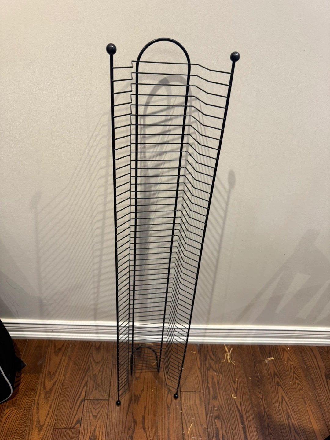 Two-piece storage solution. One is a freestanding metal rack, holds many discs. The other is a black wooden shelf unit with metal rods for organizing. Both great for media storage.