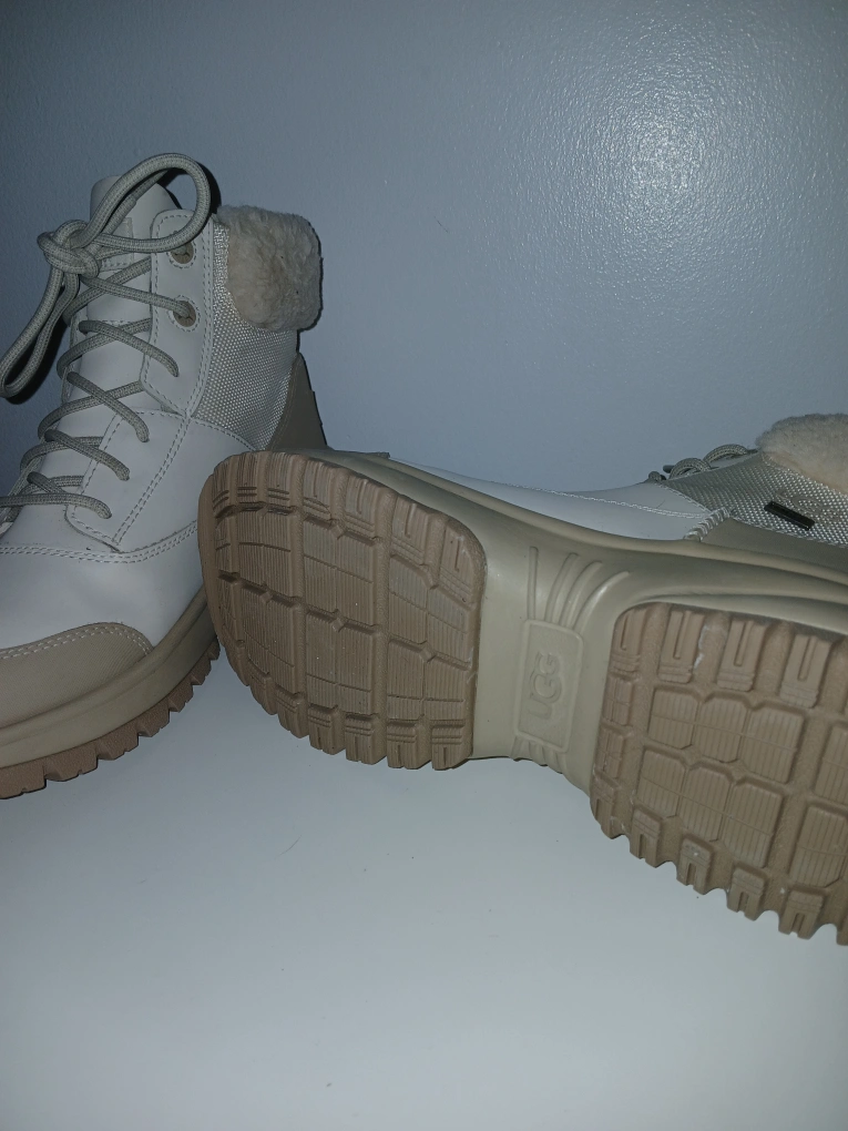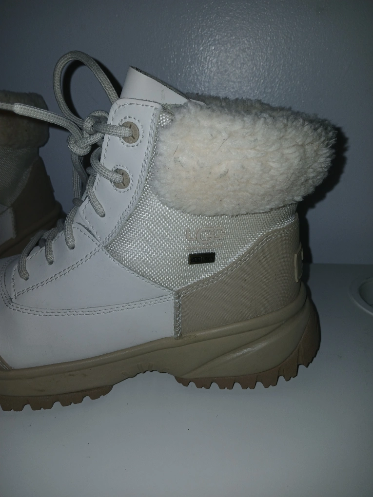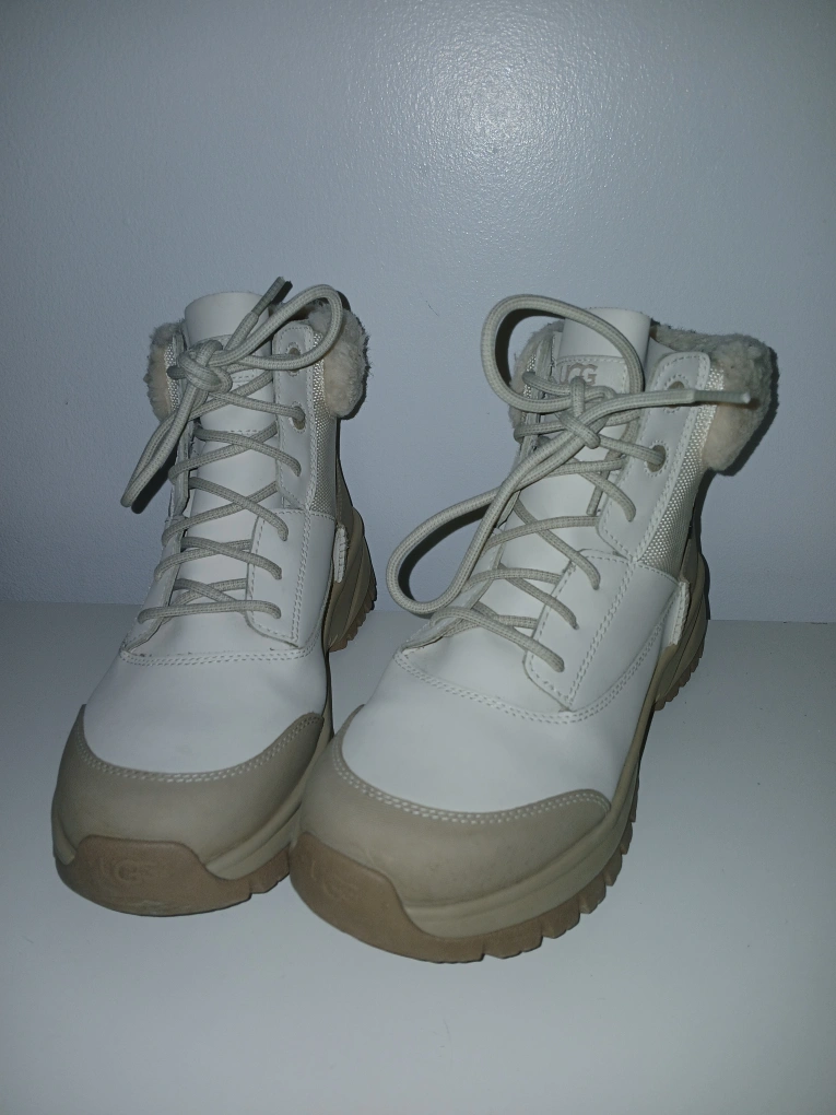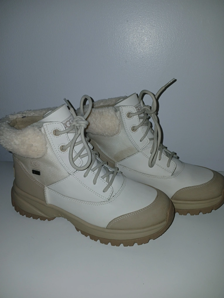 Women's UGG Yose fluff boots. Size 8. Off-white leather upper. Beige accents. Lace-up closure. Good tread on the sole.