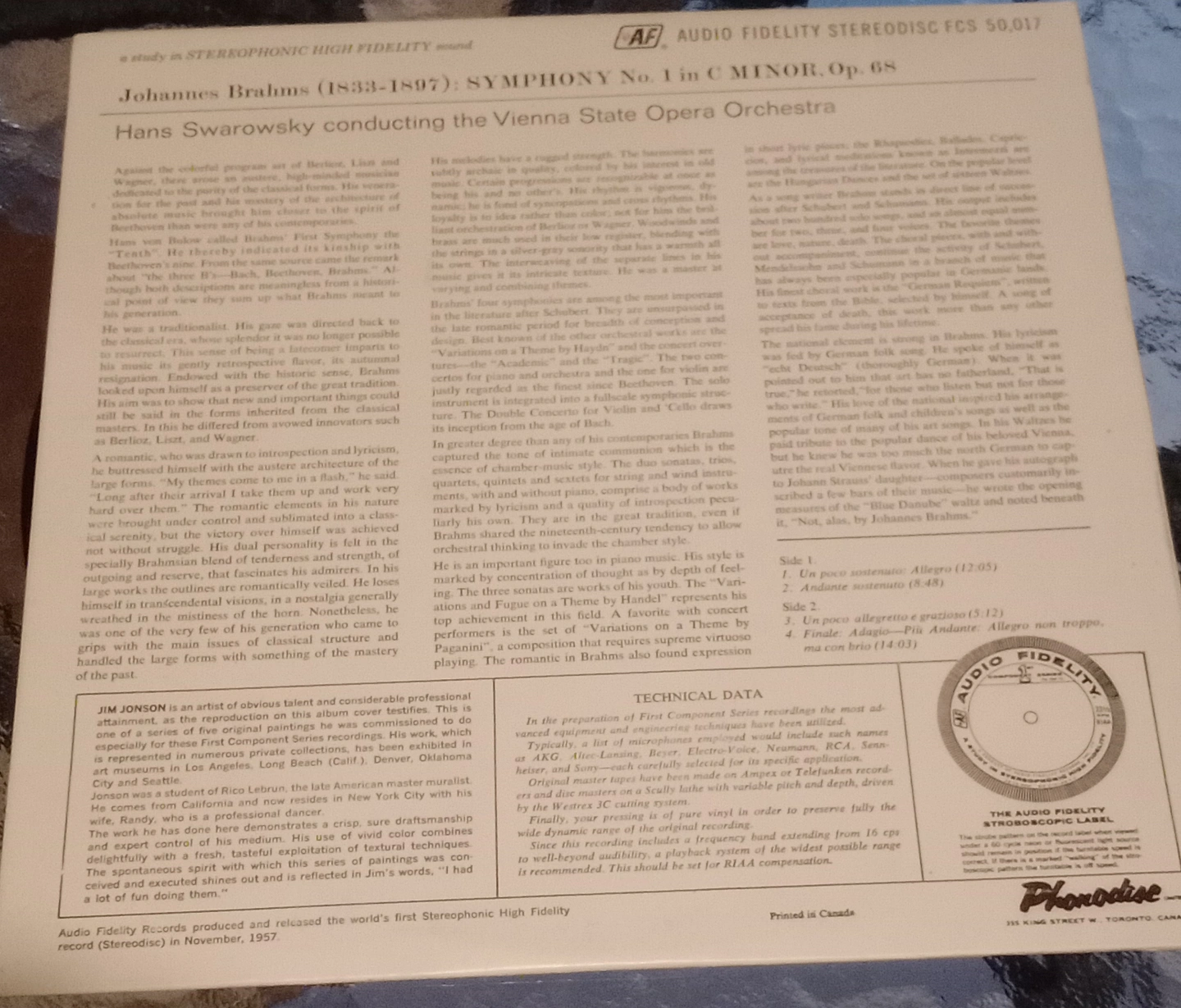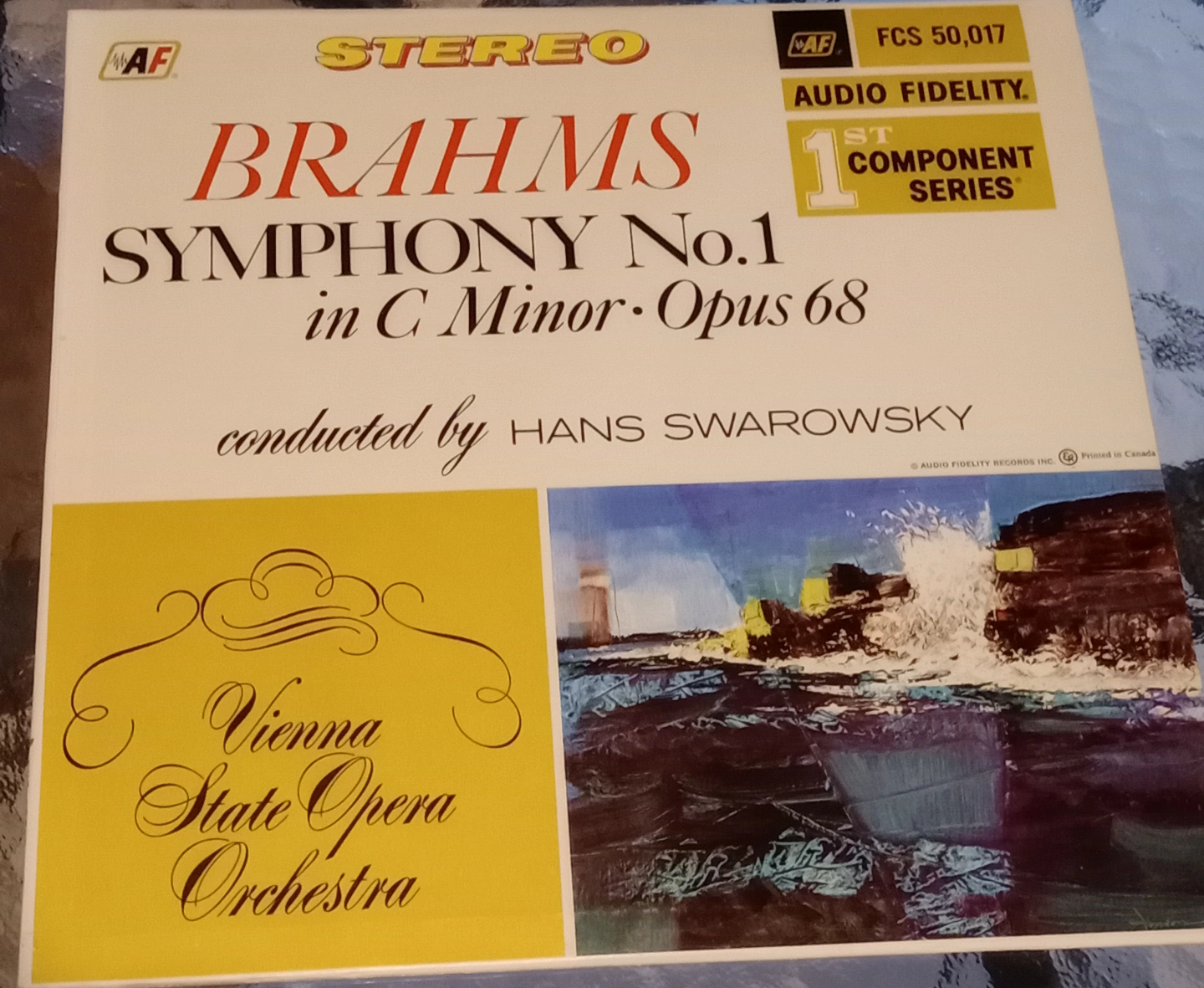 Offered here is a used Audio Fidelity stereo LP record, featuring Brahms' Symphony No. 1, conducted by Hans Swarowsky with the Vienna State Opera Orchestra. This record is part of the First Component Series and presents a high-fidelity listening experience. The cover exhibits some wear, as visible in the photos, but the record itself is in good condition for listening enjoyment.