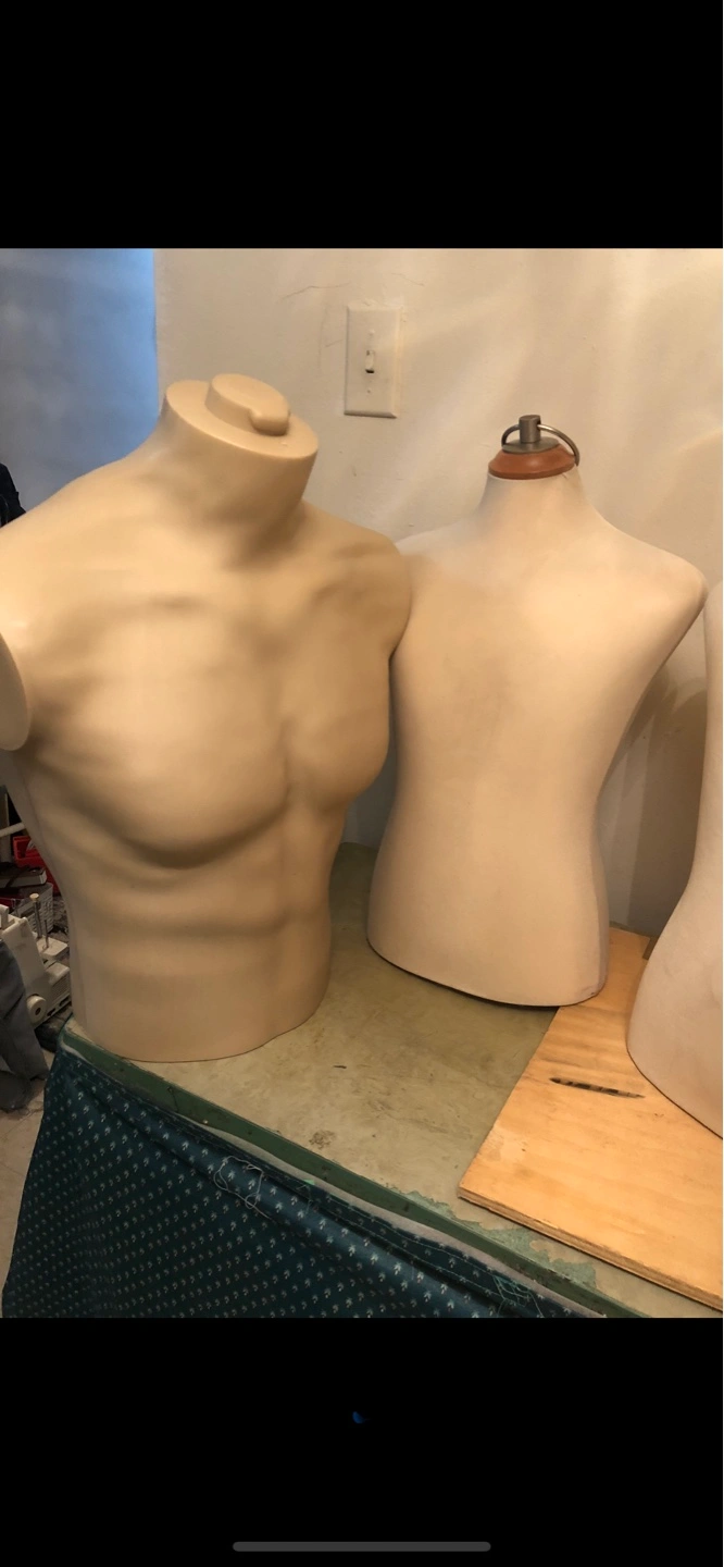 2 male dress forms. Two are beige plastic, one is beige fabric. Varying sizes. Ideal for displaying clothing or for crafting projects.
