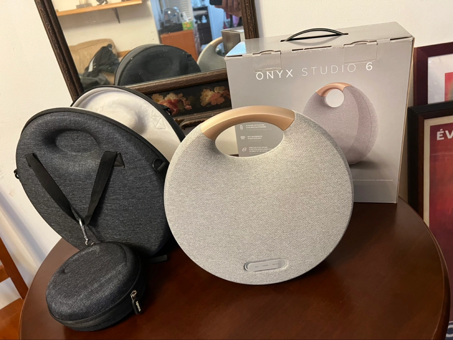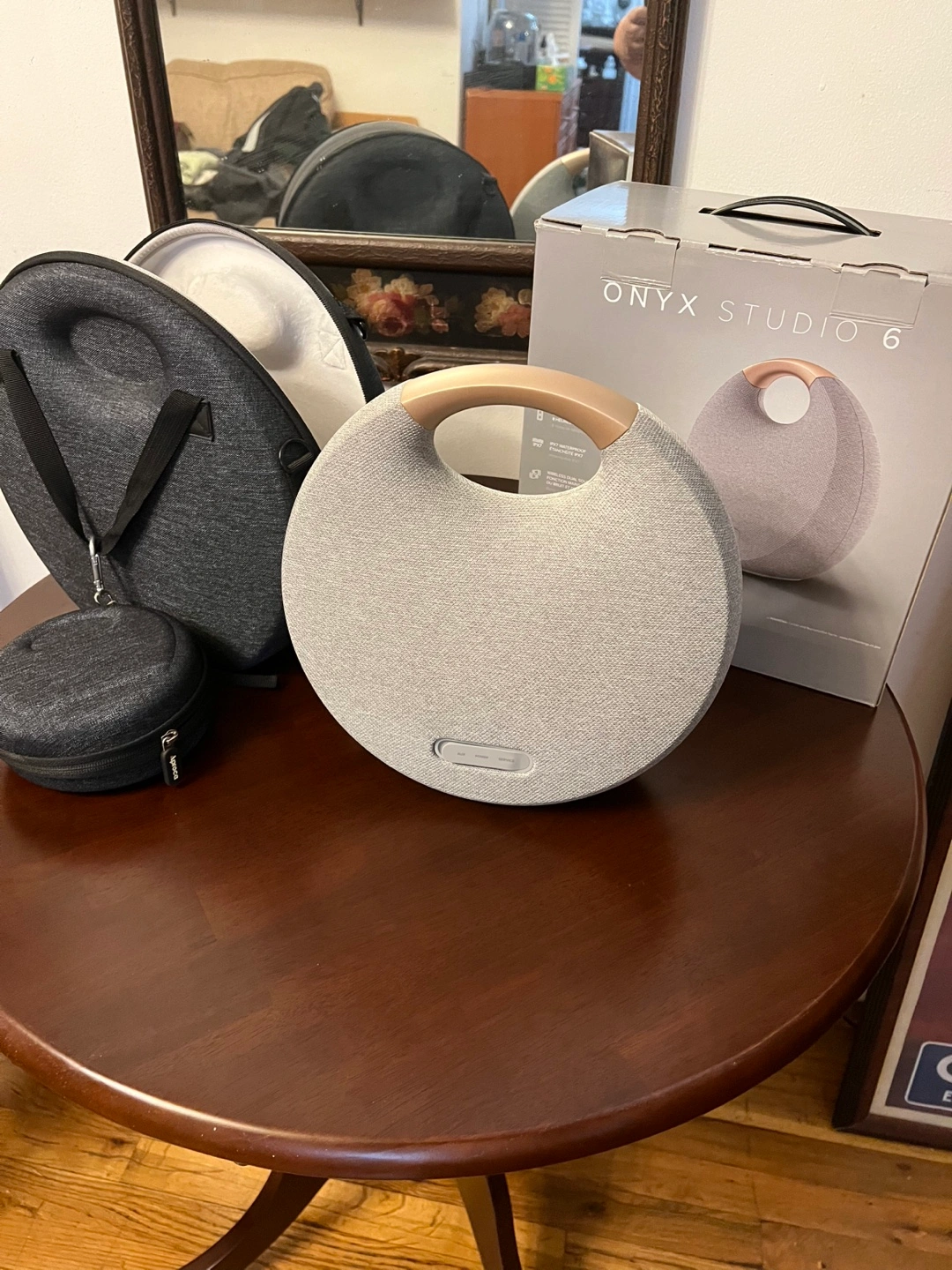 Onyx Studio 6 portable Bluetooth speaker. covering. handle. original box and two carrying cases. One large for the speaker, one smaller.