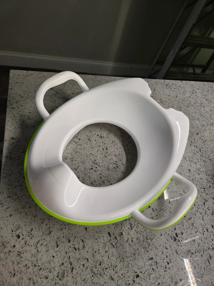 White and lime green potty training seat. Features two handles for easy gripping. Designed to fit standard toilets.