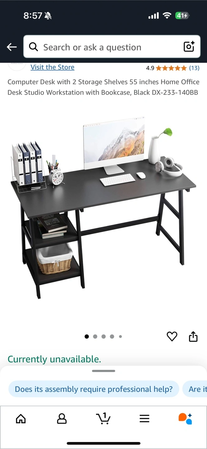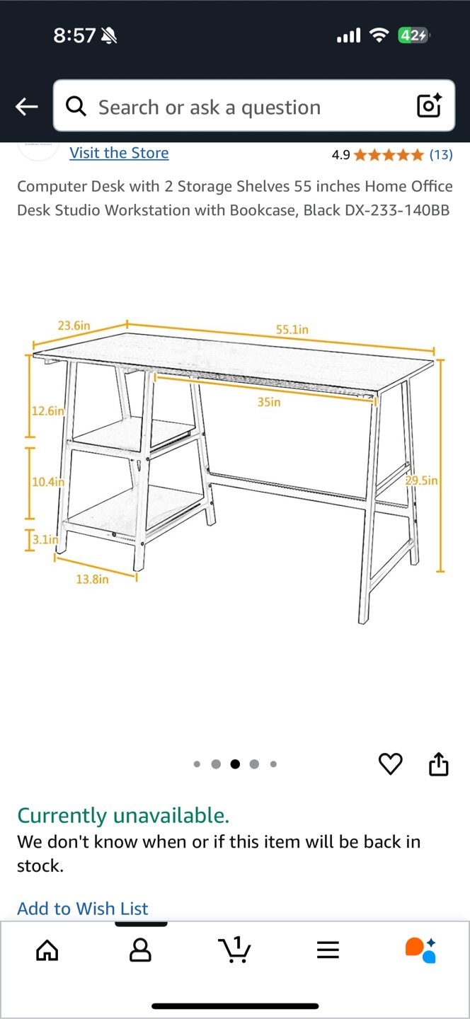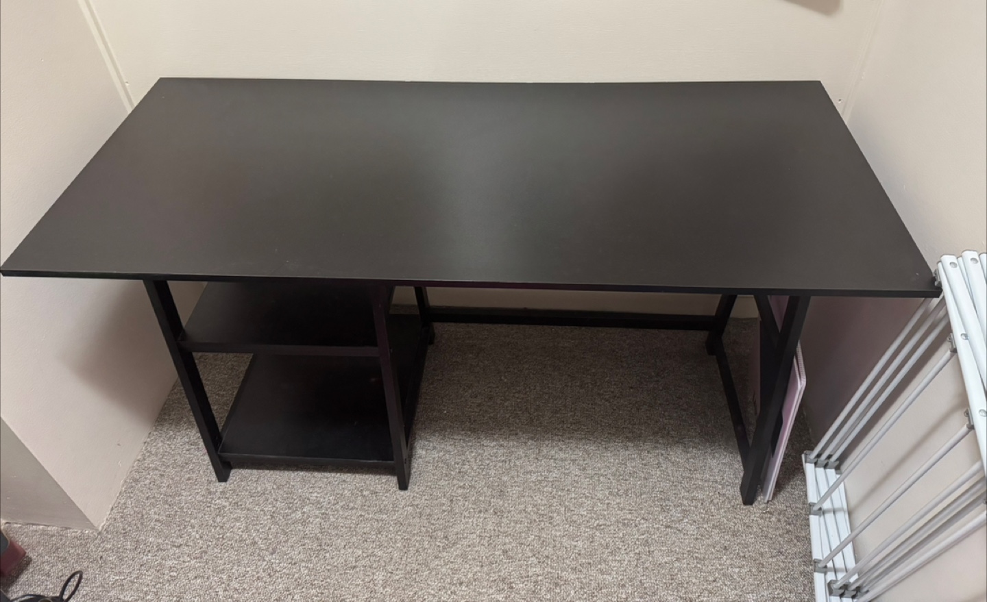 55-inch home office desk. Features two storage shelves. Black finish. Simple design. Good for home or office use. Barely used. Pick up in the west end only.
