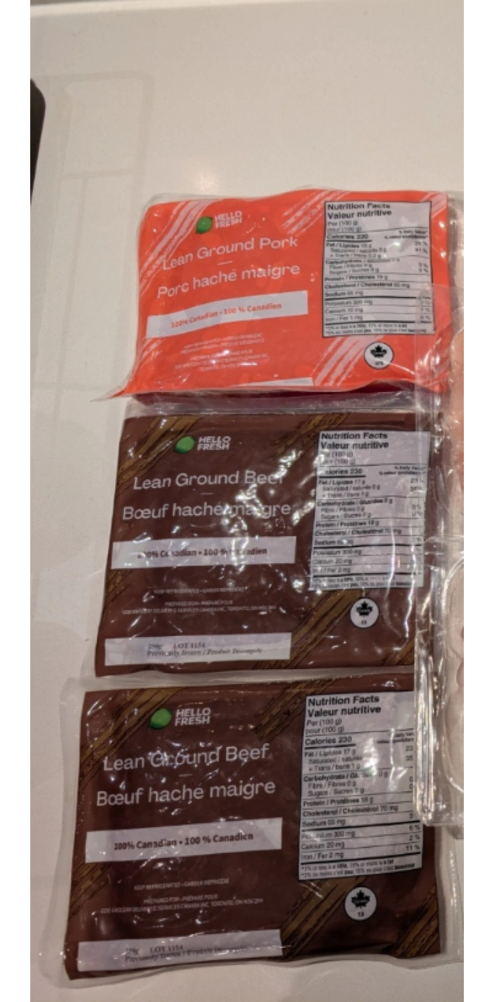 Three packs of HelloFresh lean ground meat. One pack of pork and twi of beef. Previously frozen. 100% Canadian.
