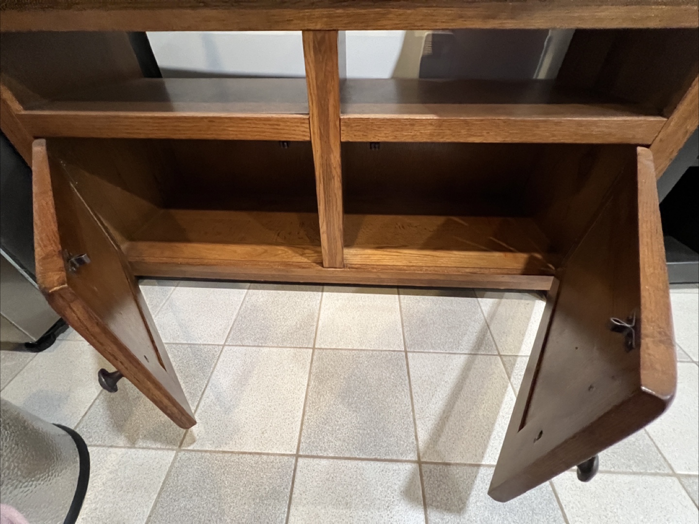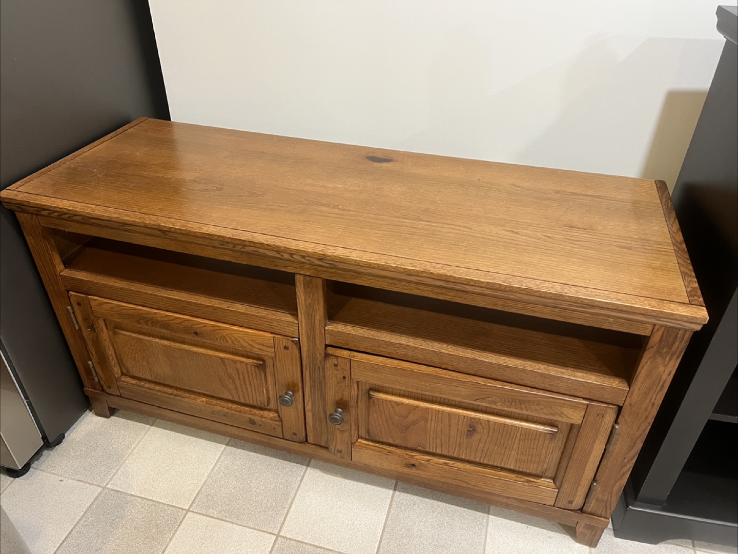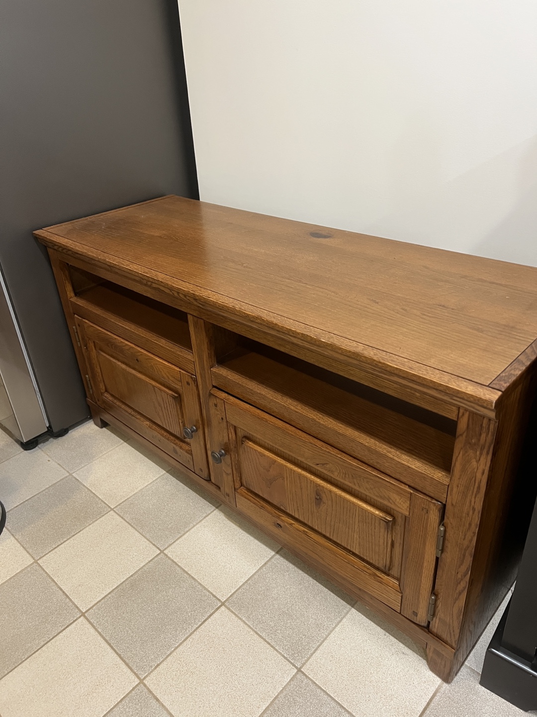 brown wooden TV stand. Two cabinet doors with shelf space inside. Open shelving in the middle. Solid and strong will last a lifetime!