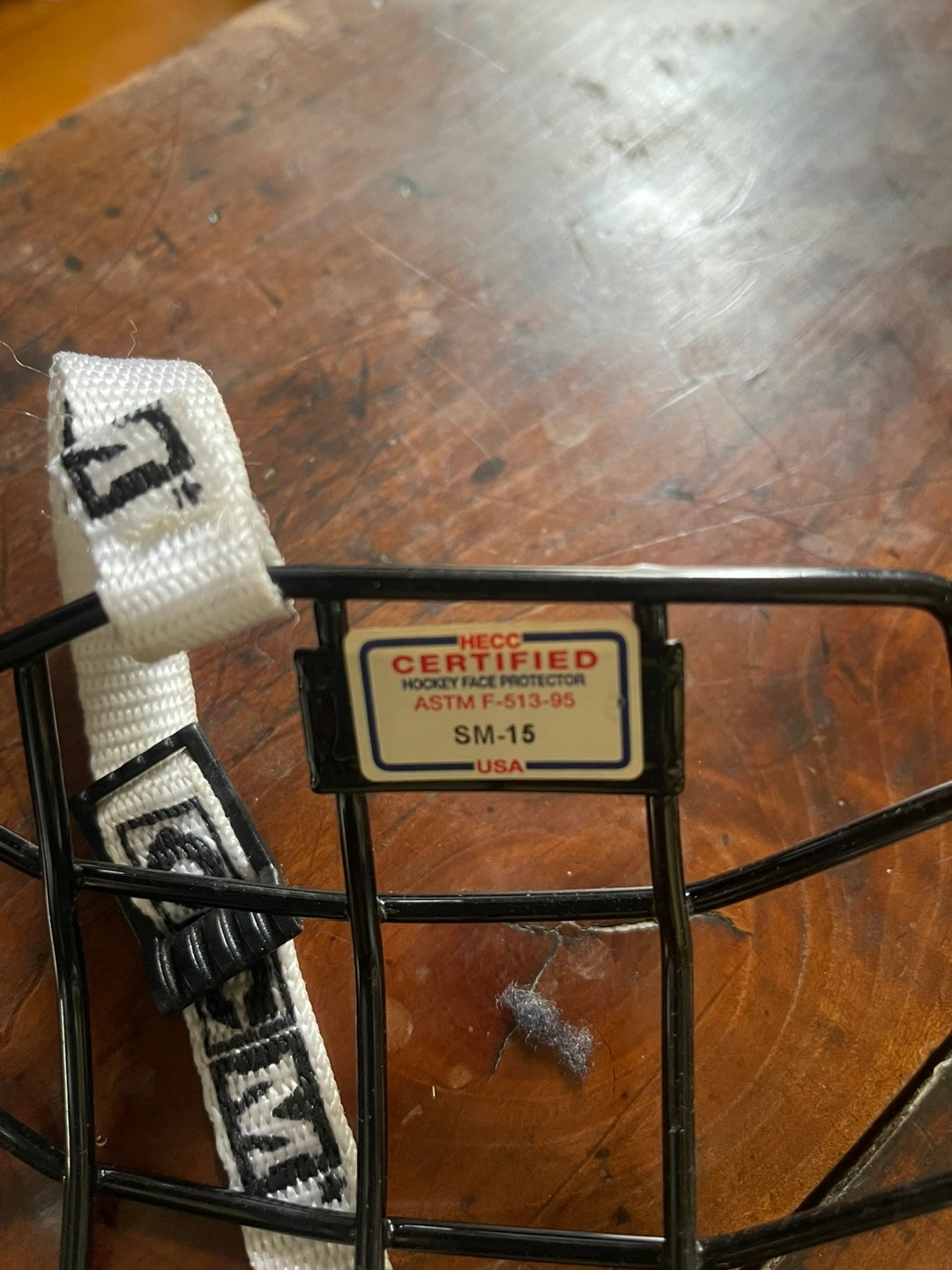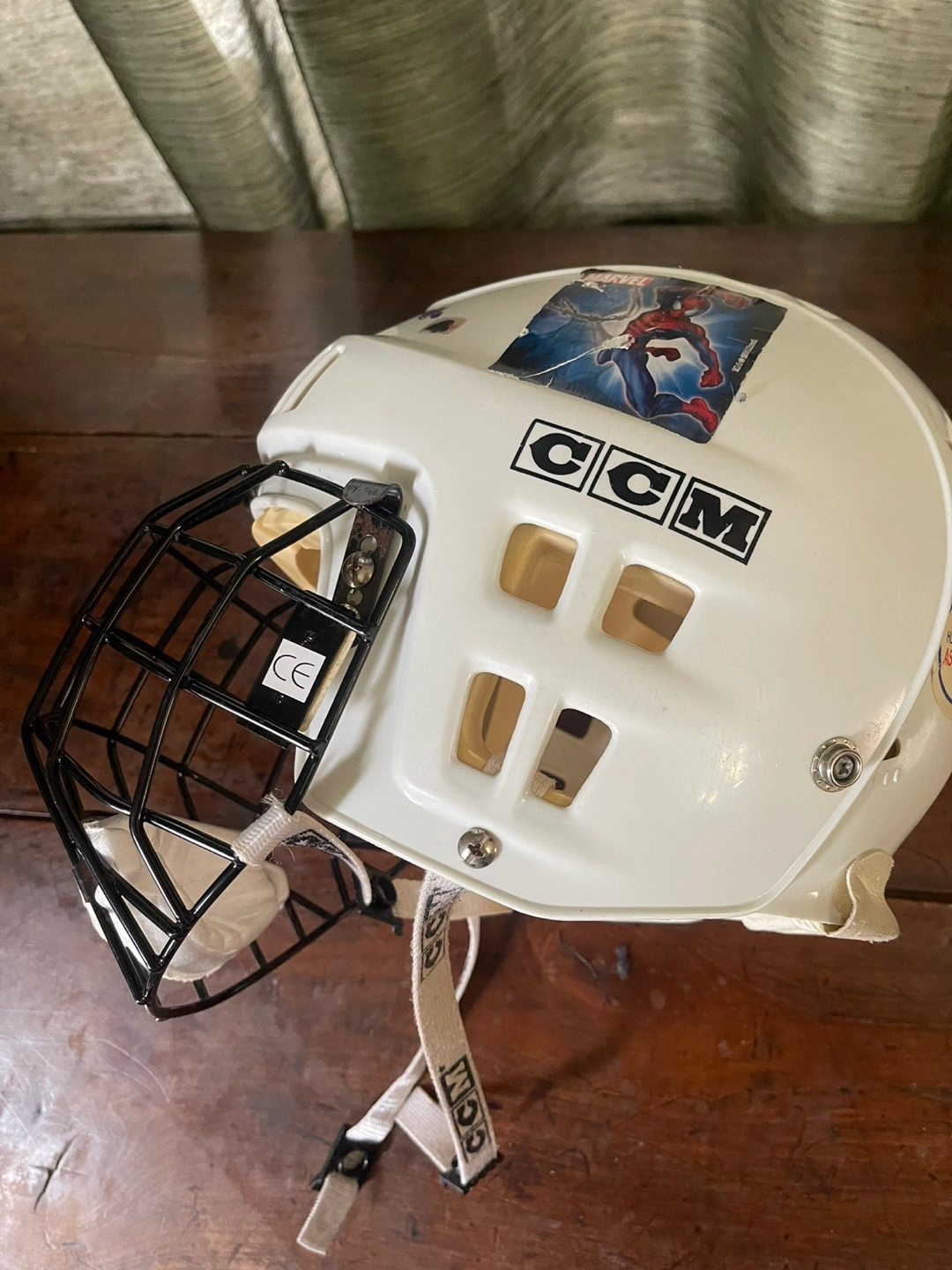 CCM hockey helmet and cage. White helmet. Good used condition. Includes cage and chin strap.