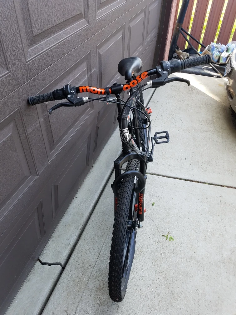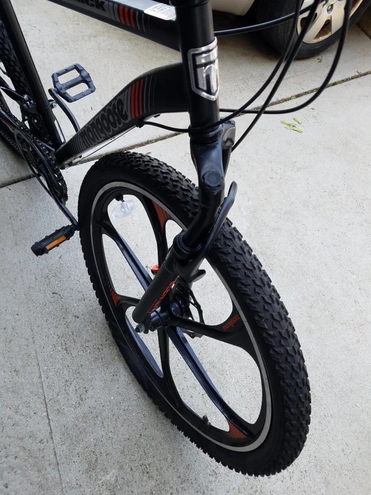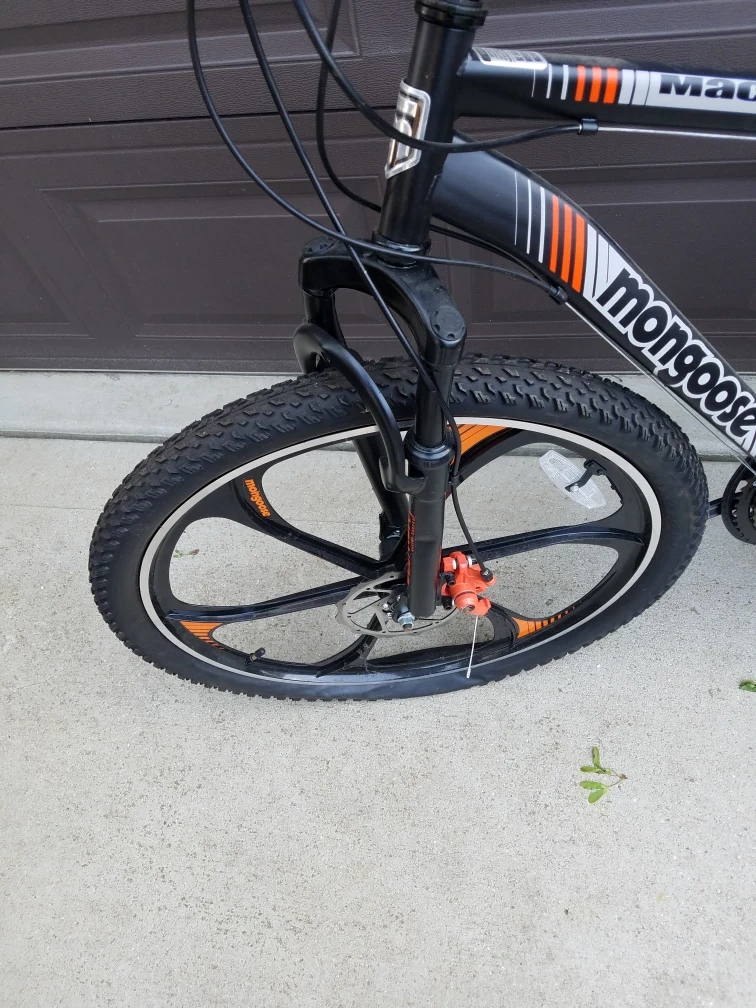 Black mountain bike with orange accents. Features disc brakes and unique spoke wheels. Good condition. front fork needs to be replaced it's bent can be fixed