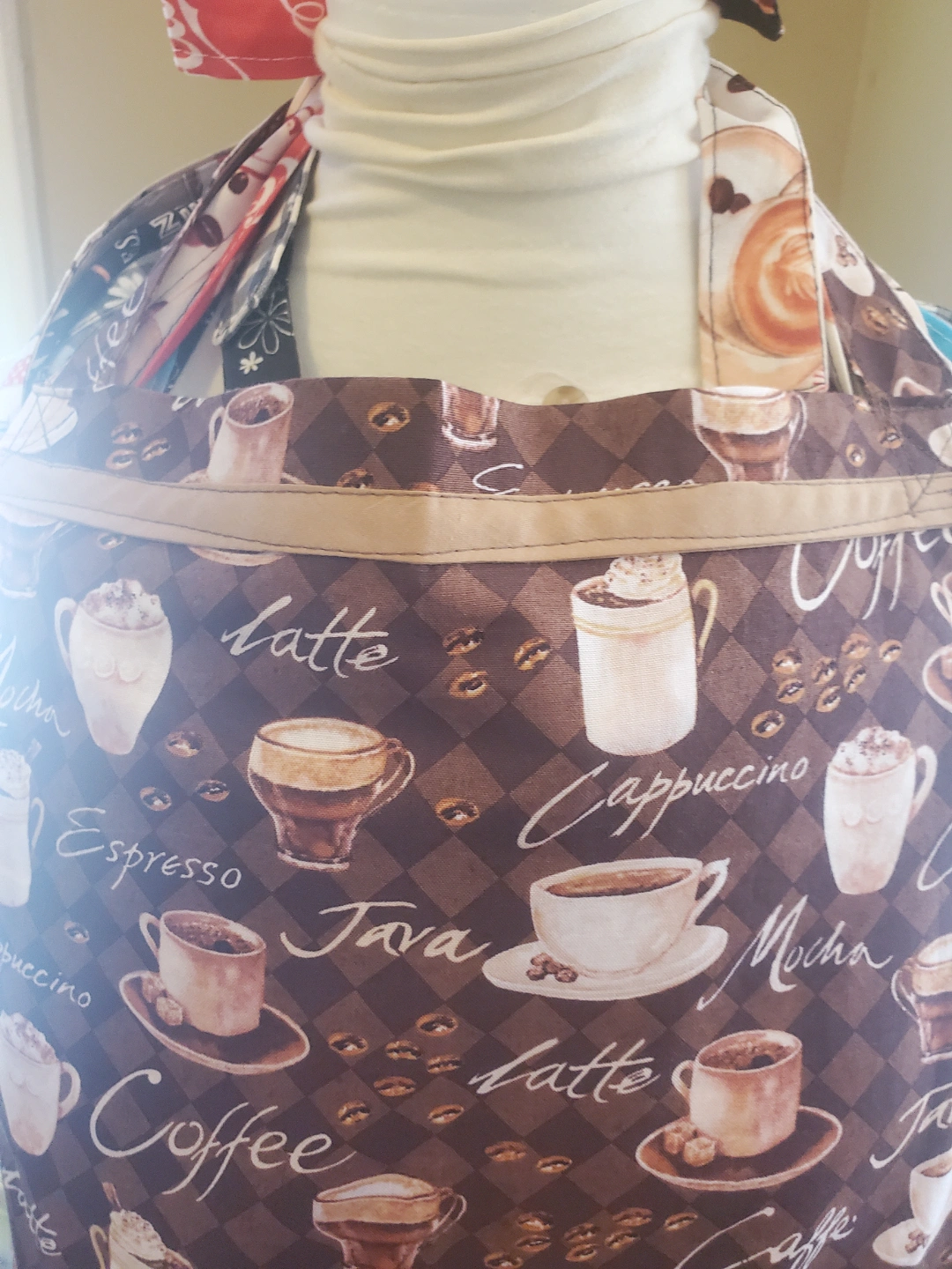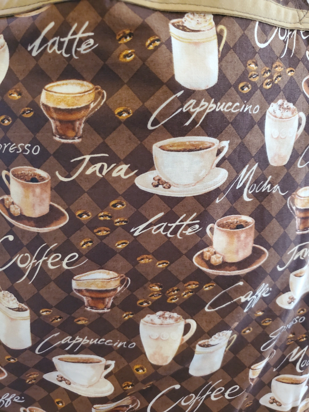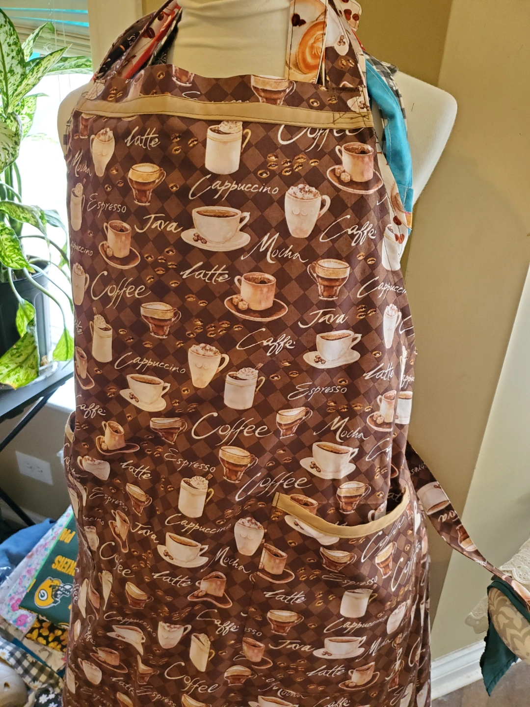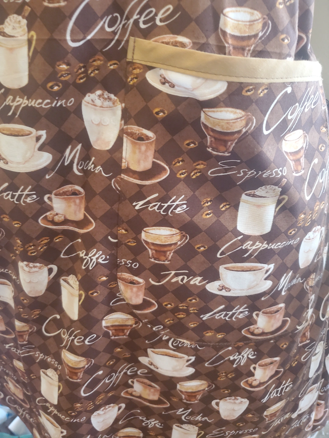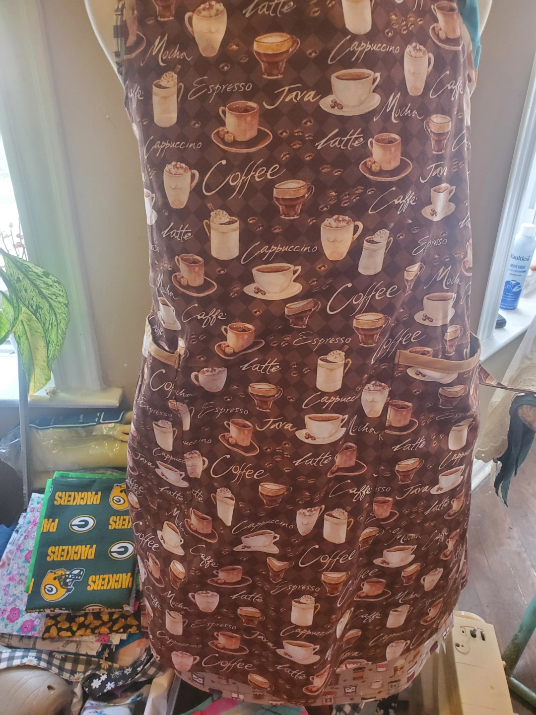 Adorable handmade apron. Features a coffee-themed print. Has pockets. Perfect for coffee shops or home use, from my smoke pet and odor free home, kept in zip lock bags... reinforced pockets and ties.