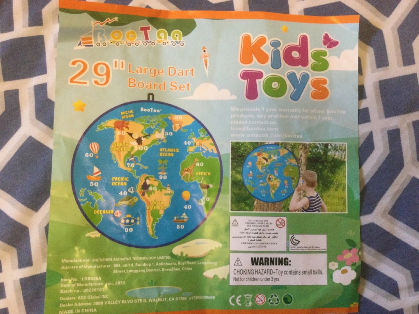 Fun kids toy. 29 inch dartboard. Features a world map design. Includes small balls. Not for children under 3.