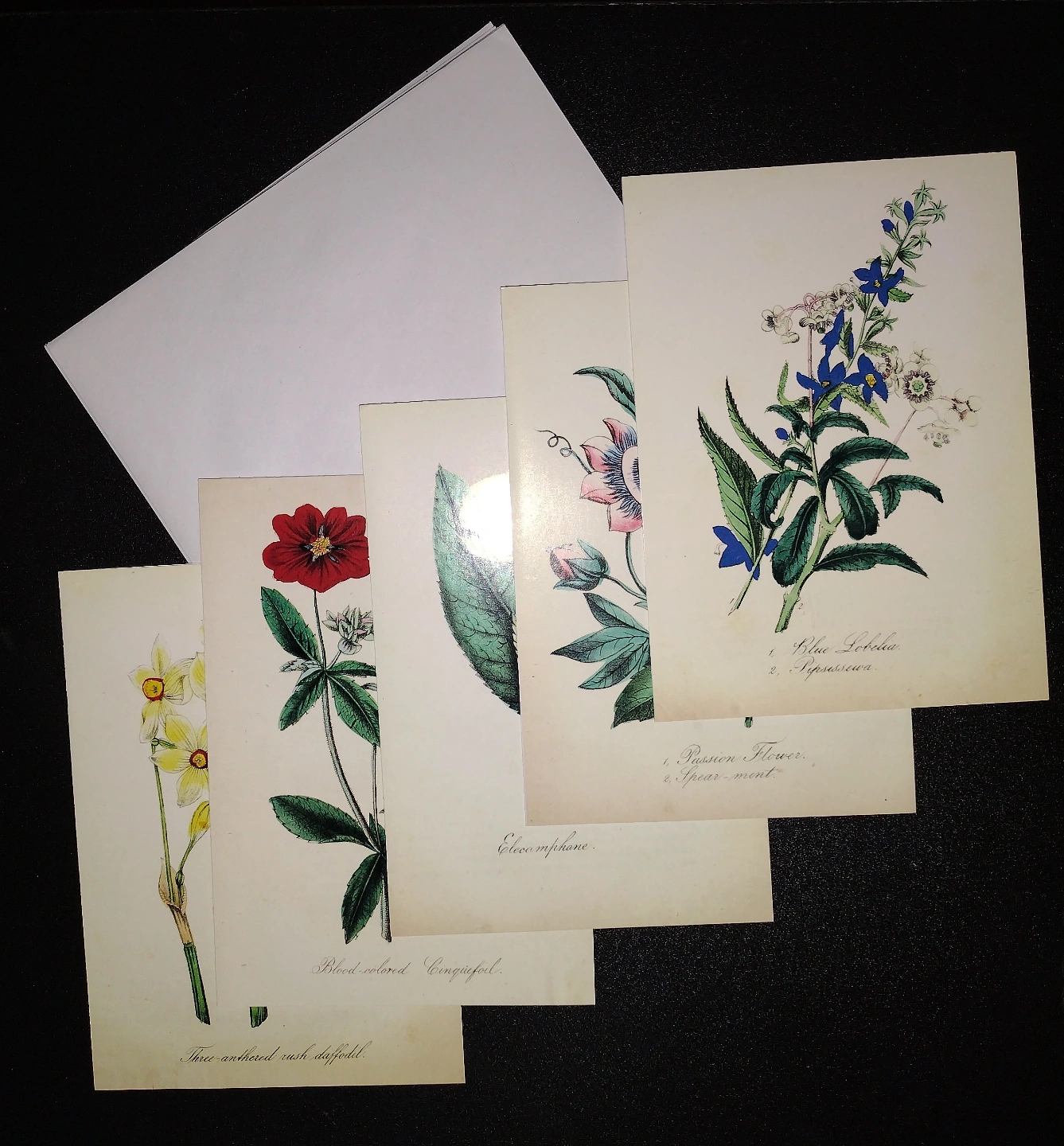 Set of four vintage botanical prints greeting cards. Features various flowers, including daffodils, passion flower, lobelia, and cinquefoil. Printed on cream-colored card stock. Includes white envelopes.