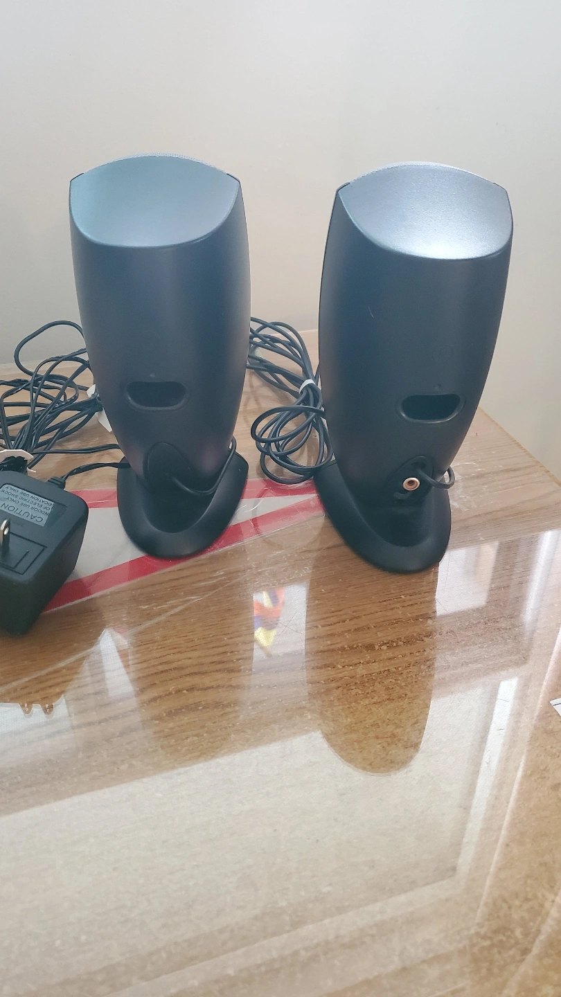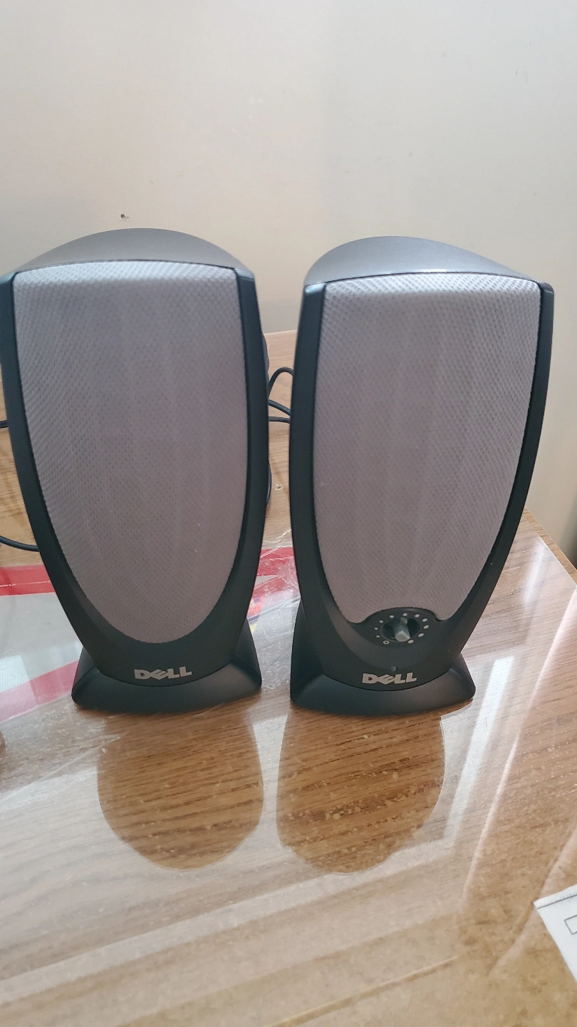 Pair of Dell computer speakers. Includes power adapter. Good condition. Compact design. Wired connection.