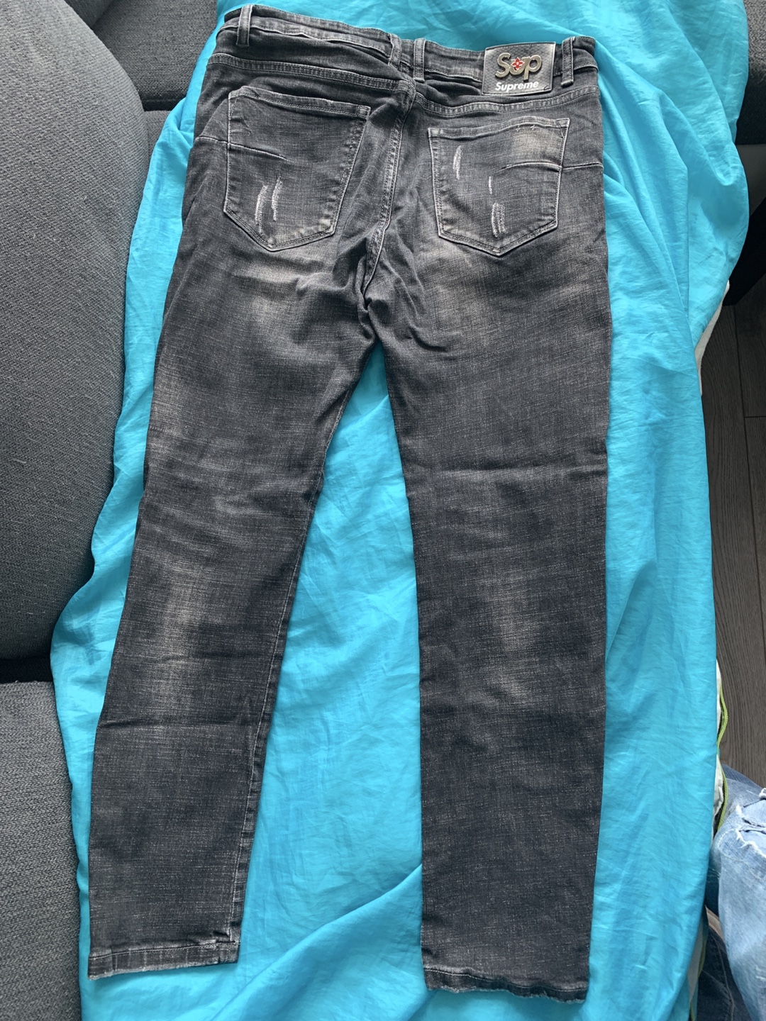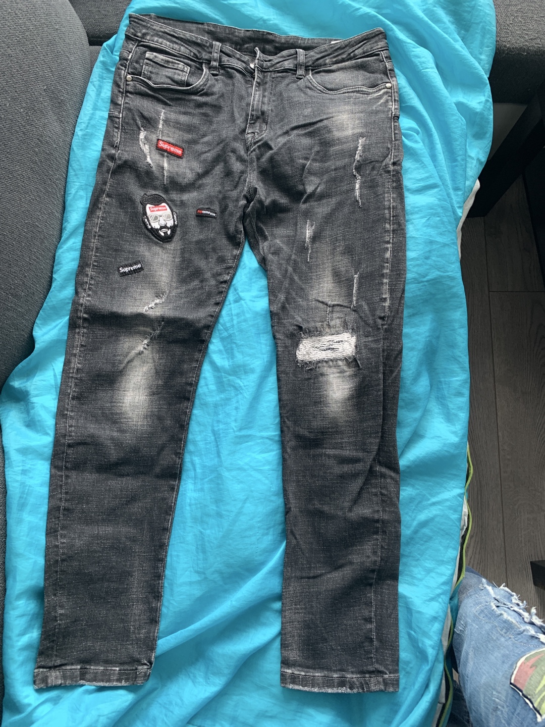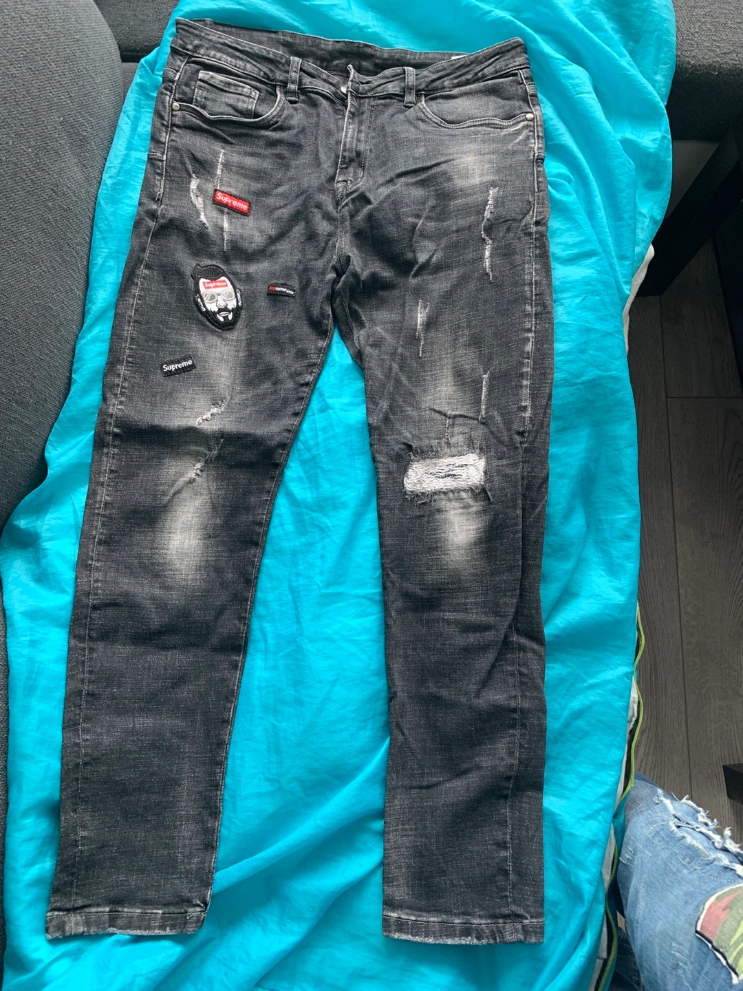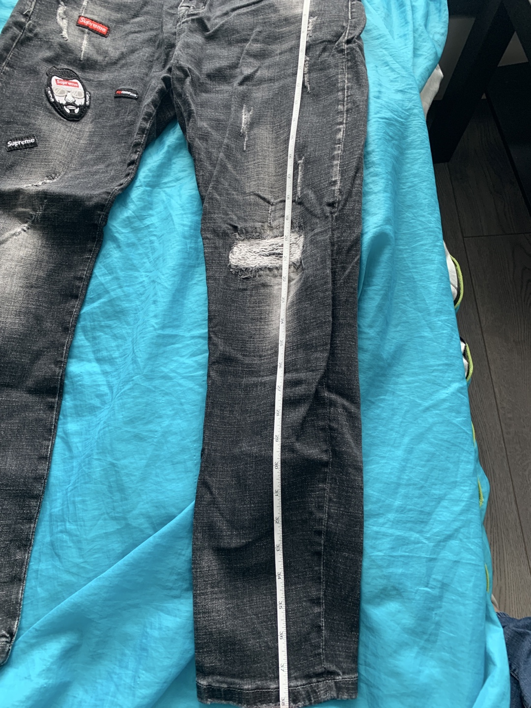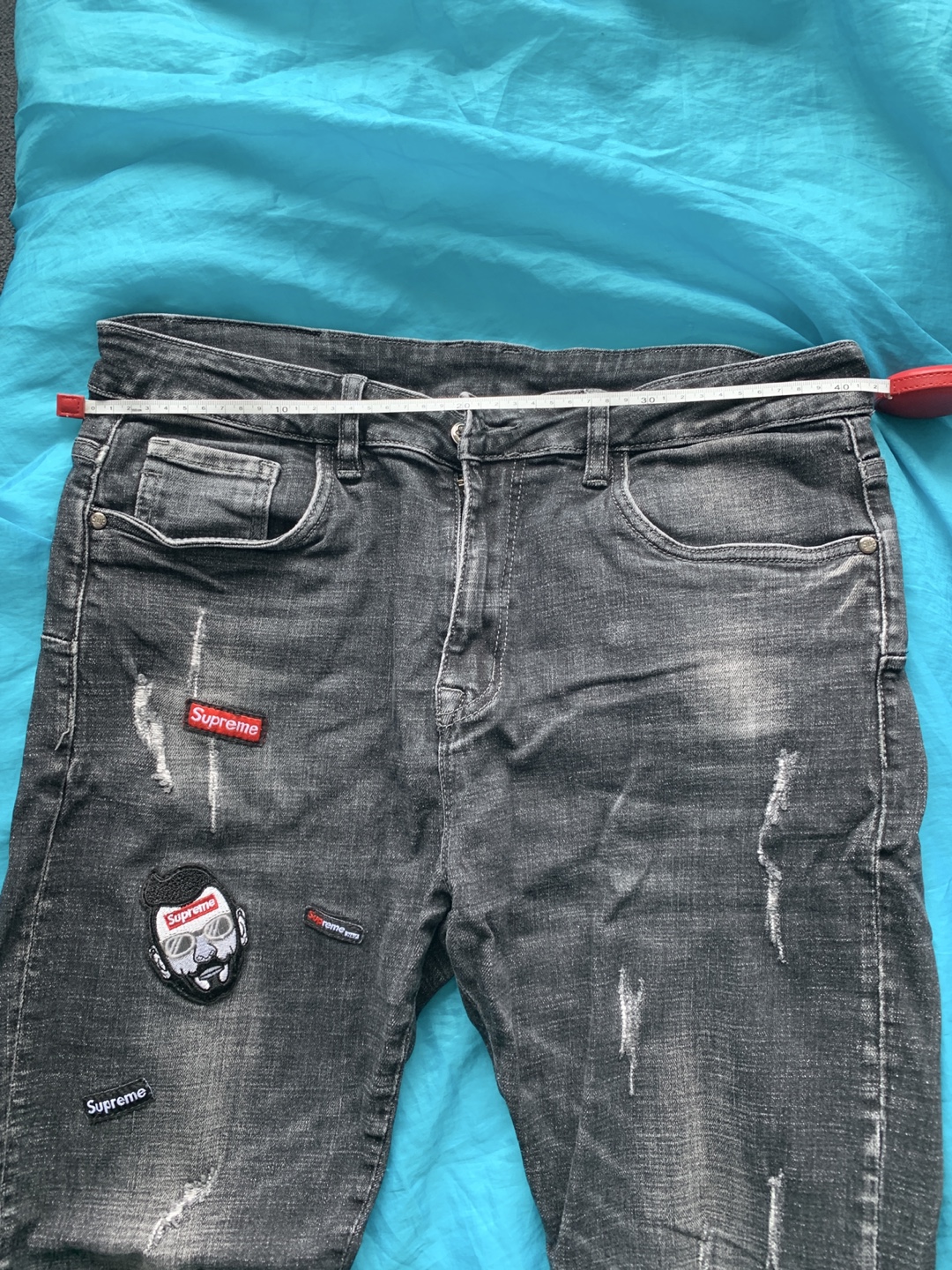 Dark wash denim jeans. Features multiple distressed areas and embroidered Supreme patches. Slim fit. Good condition.