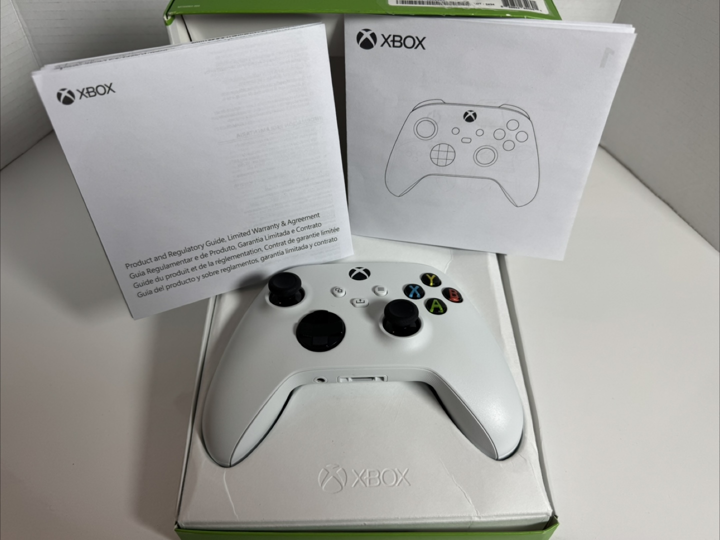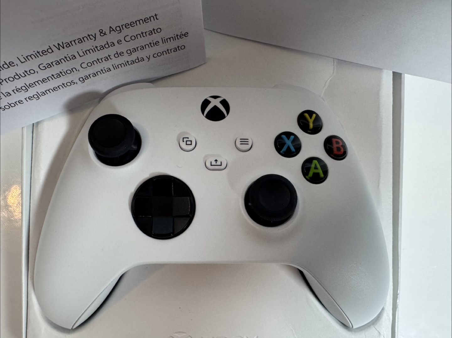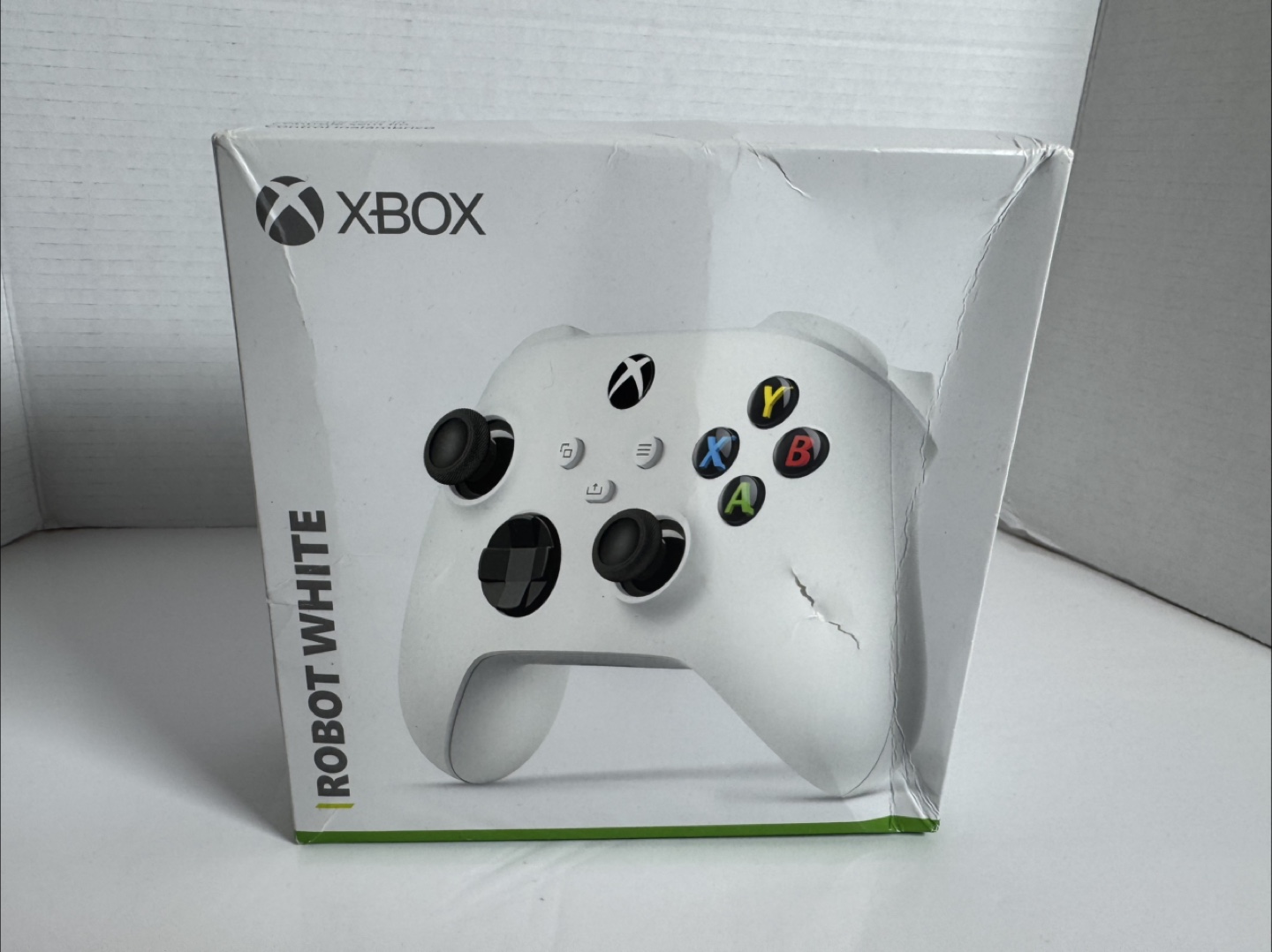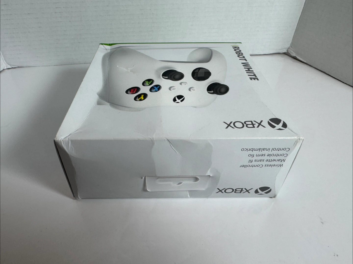 Robot White Xbox Wireless Controller. Features textured grip and share button. Includes Bluetooth functionality. Comes in original packaging.
