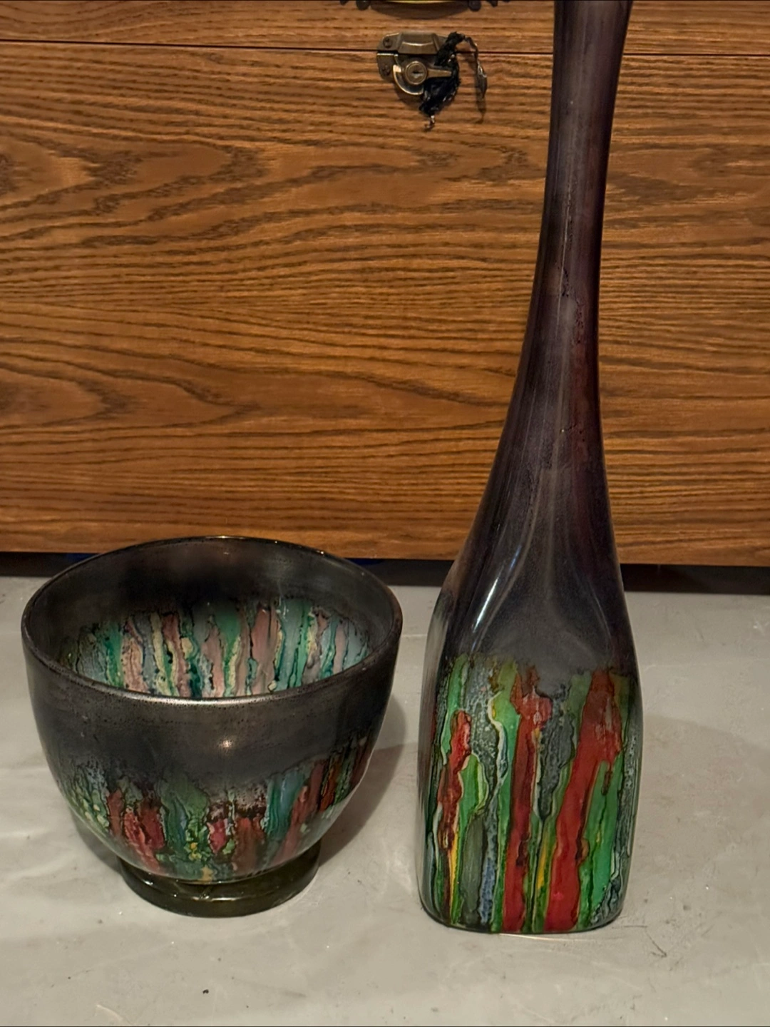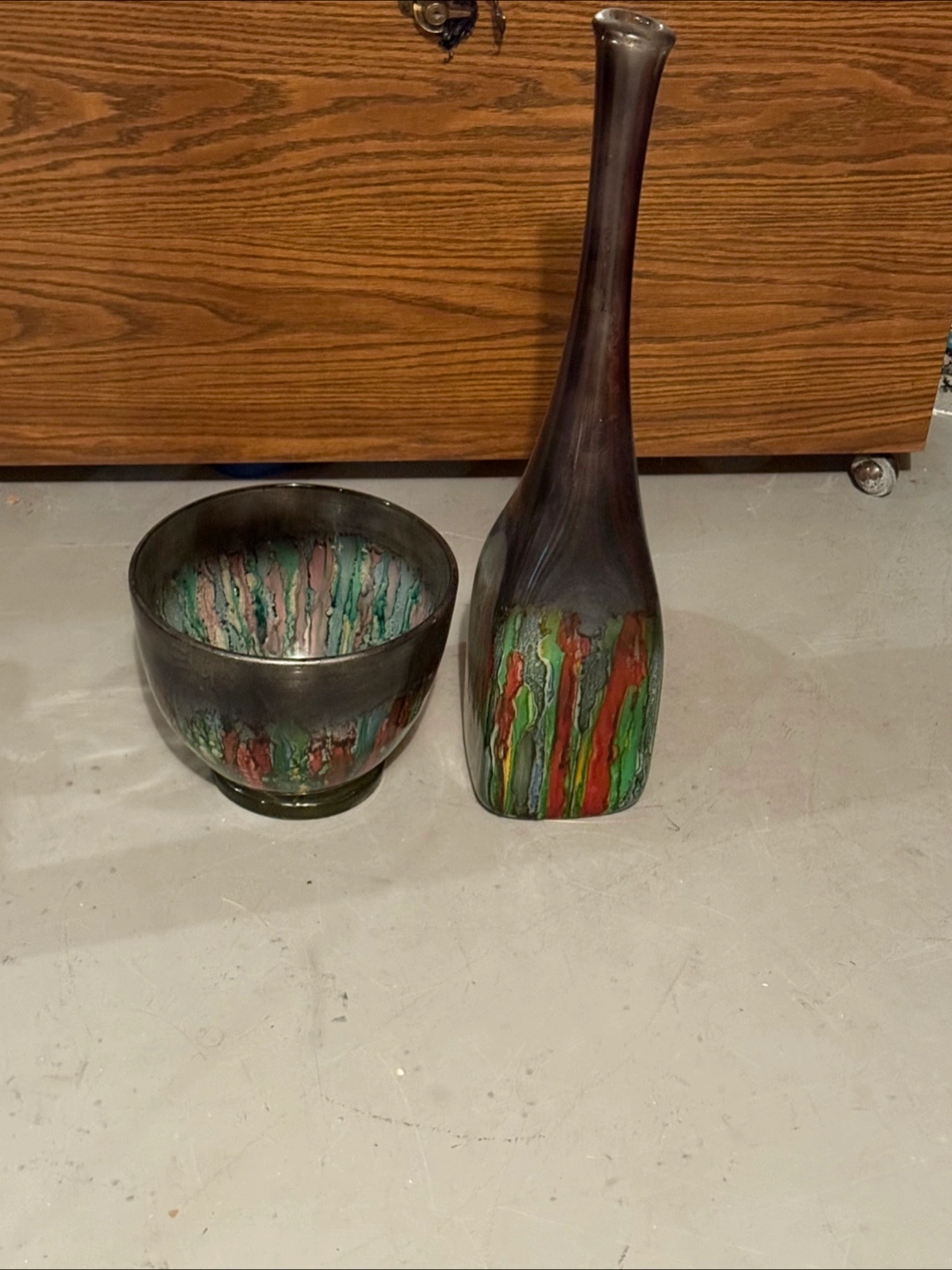 Beautiful handmade glass bowl and vase set. Features a unique marbled design in shades of green, red, and purple. Great centerpiece or decorative accent for your home bought at winners