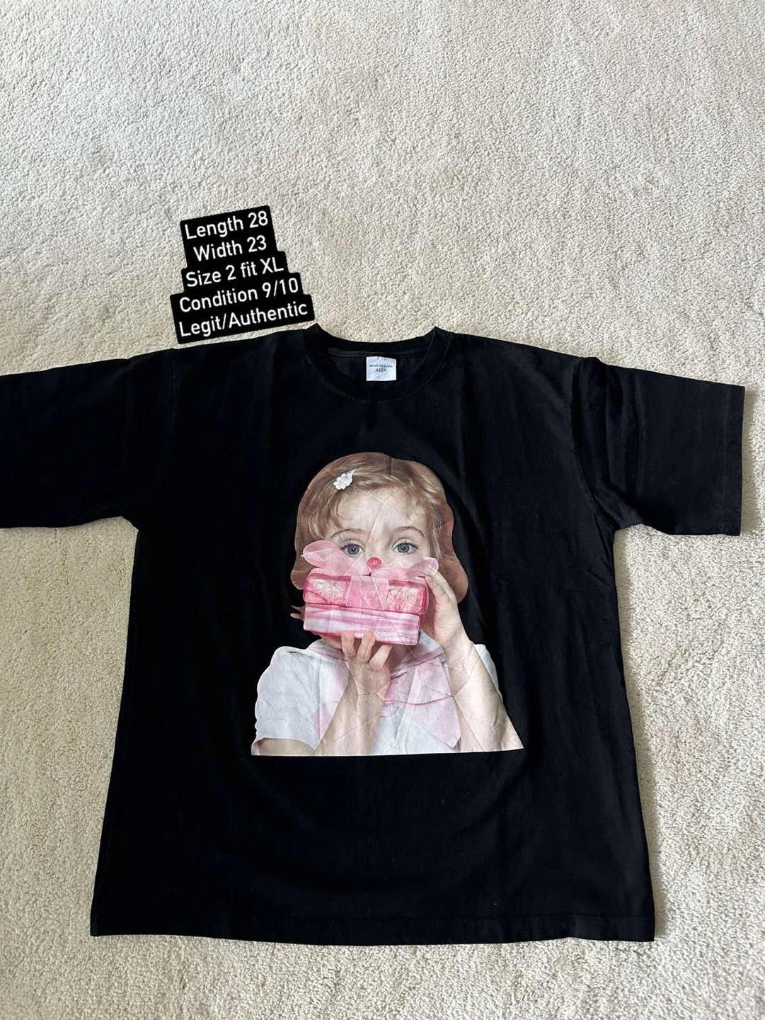 Black t-shirt. Features a graphic of a young girl holding a gift box. Size XL. Some hairline on the print