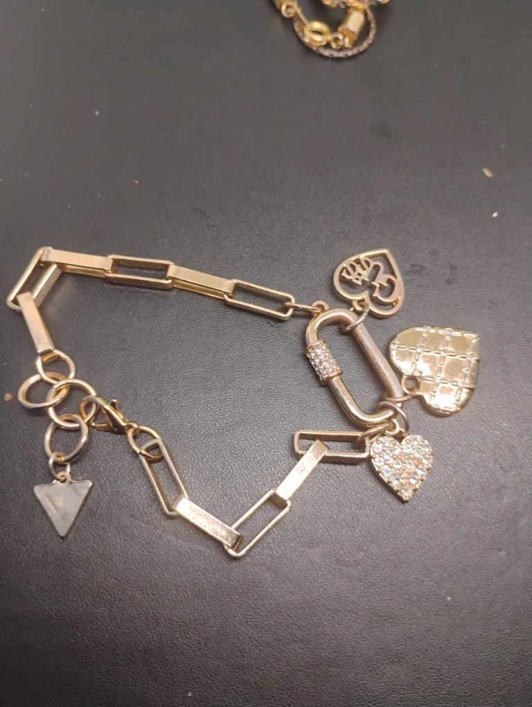 Gold tone bracelet. Features a chain link design and multiple charms. Includes a heart, carabiner, and triangle charms. Some charms have clear stones.