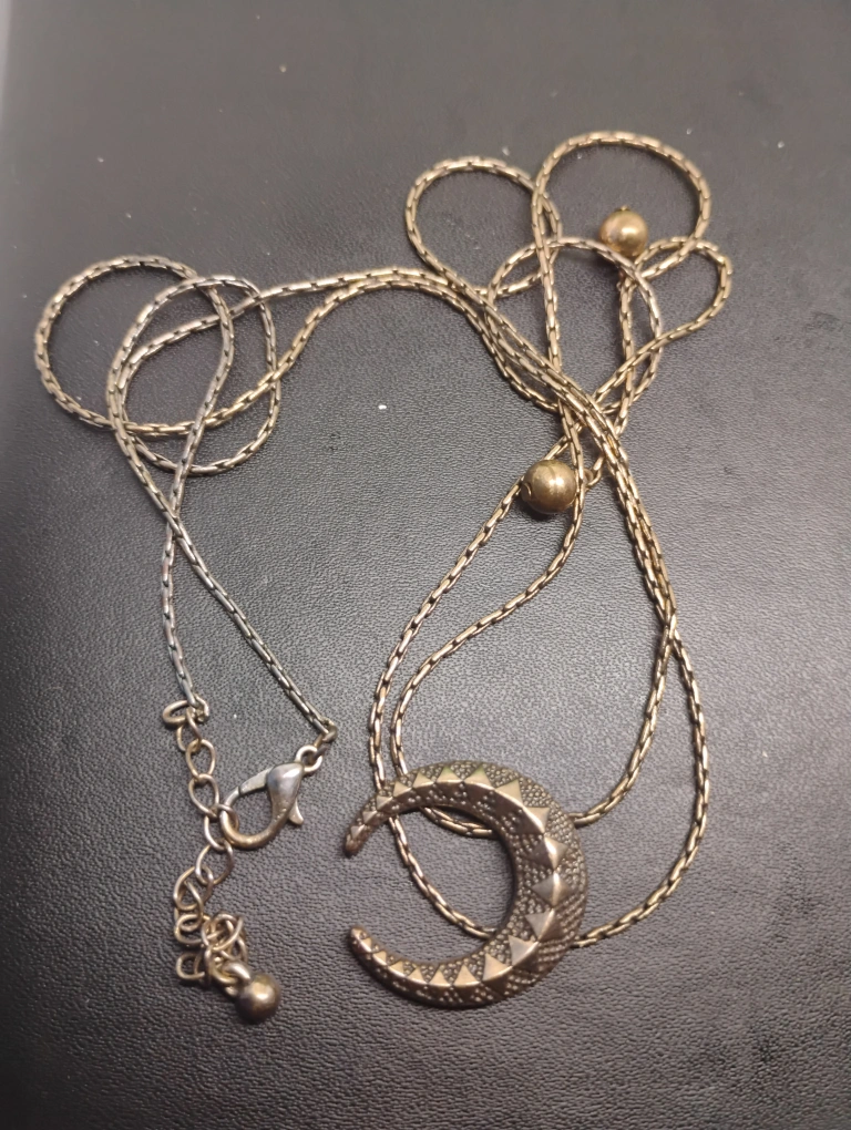 81Double chain necklace. Features a crescent moon pendant. Gold and silver tones. Lobster clasp.