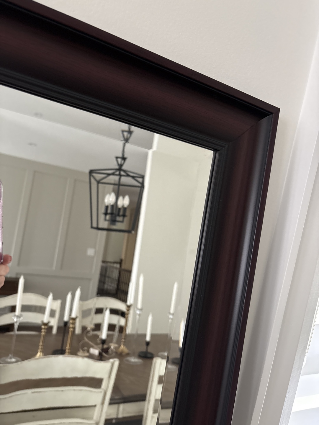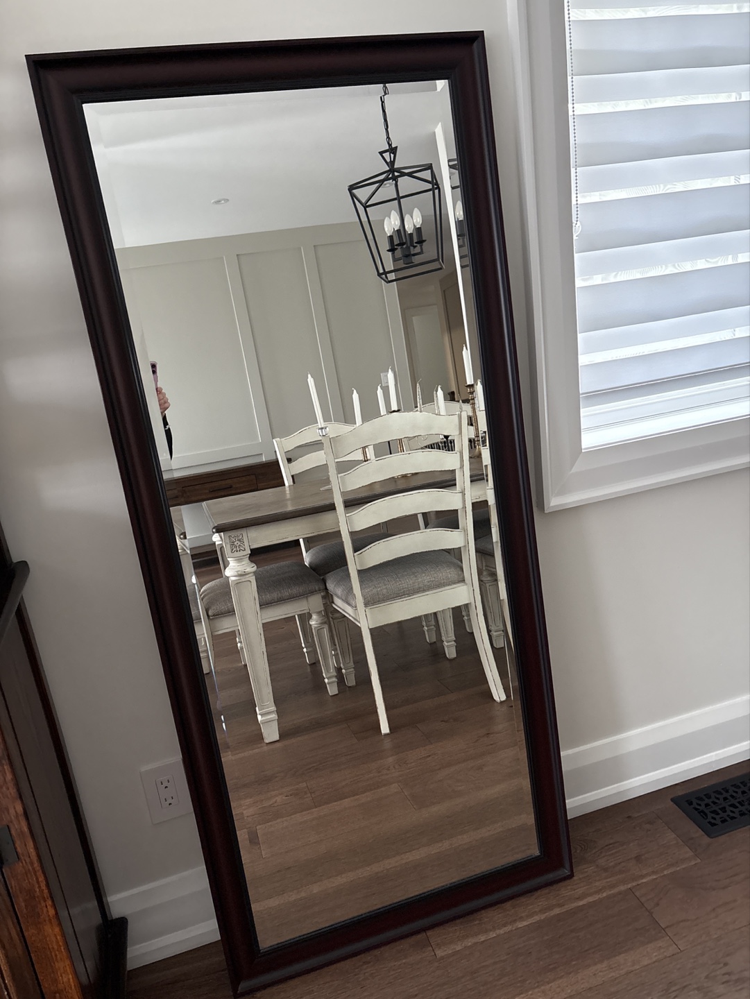 Tall standing mirror. Dark brown frame. Floor-length reflection. Great for a hallway or bedroom. Can also be hung, has wire in the back.