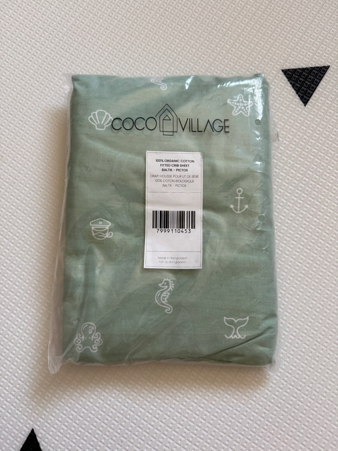 100% organic cotton fitted crib sheet. Sage green colour. Features nautical designs. Brand new, never used. Made in Bangladesh.