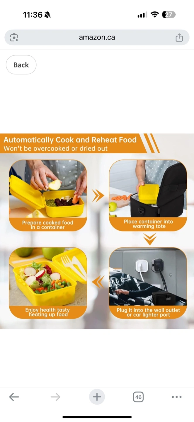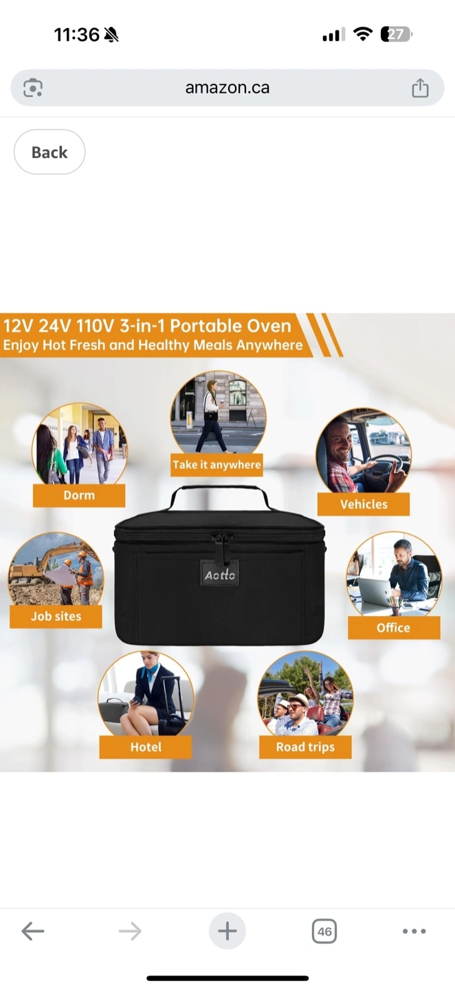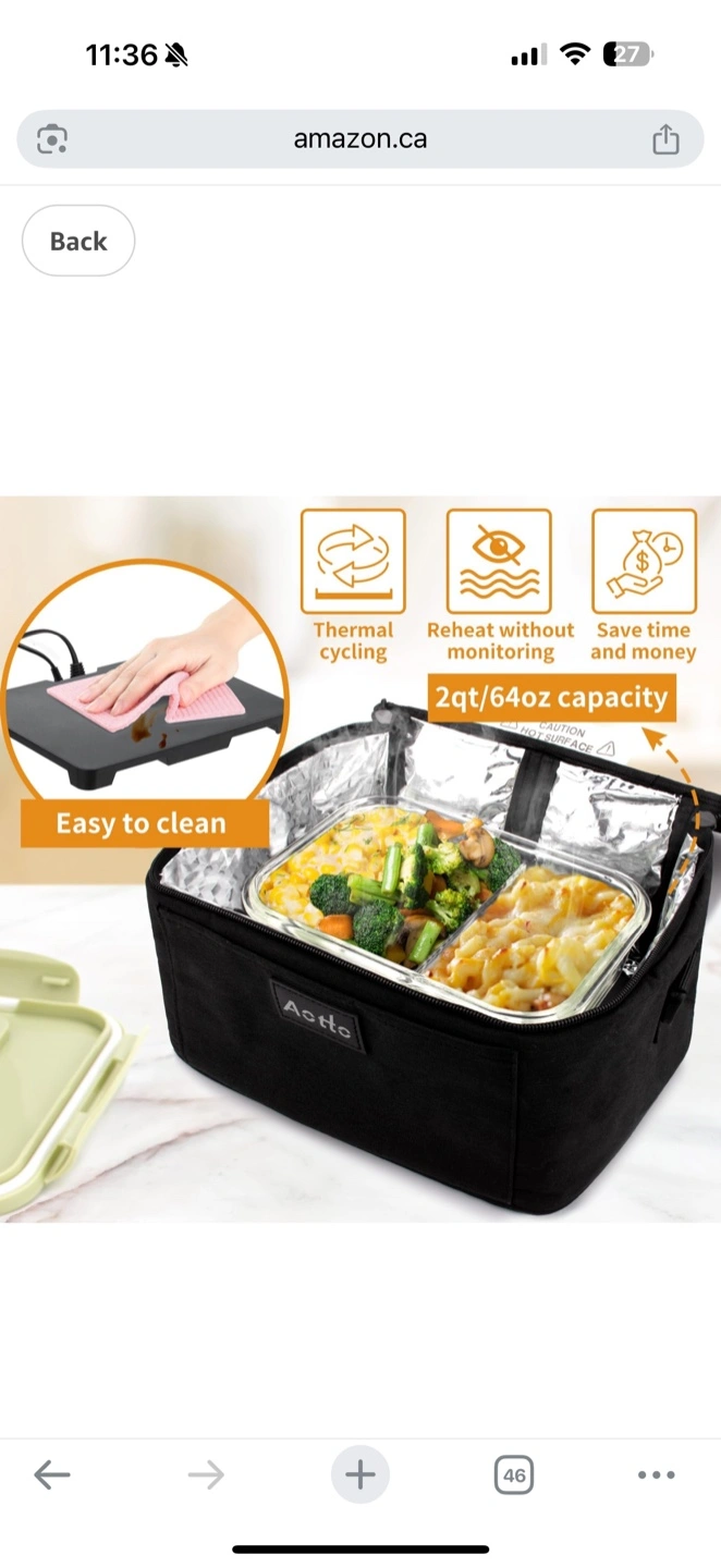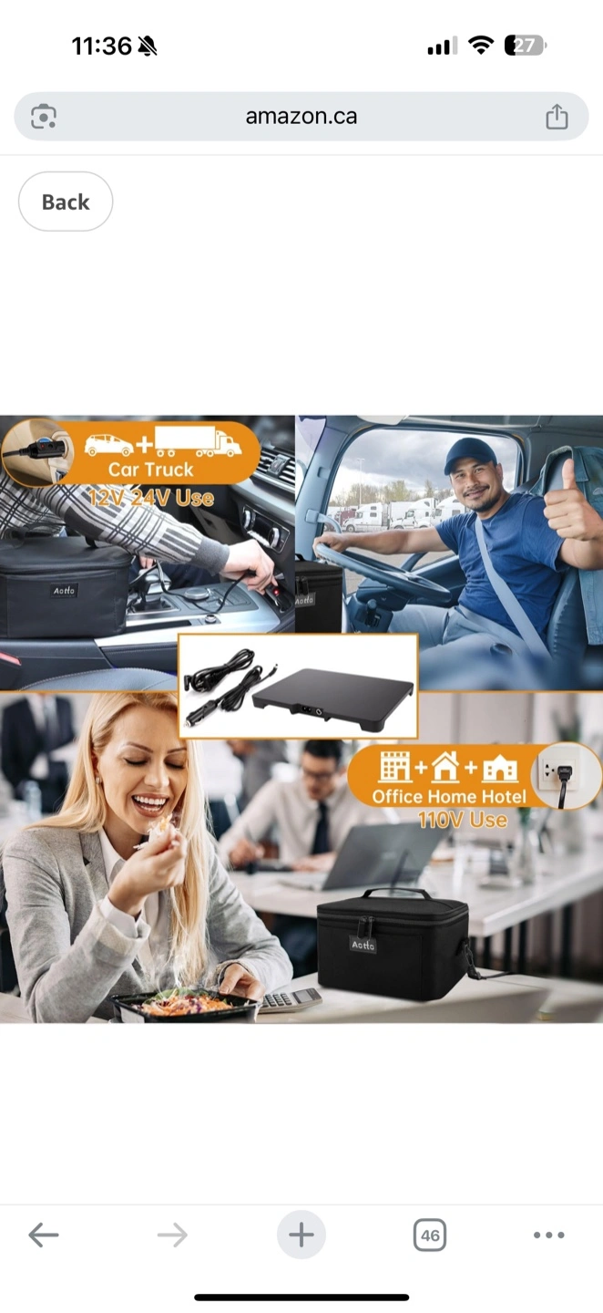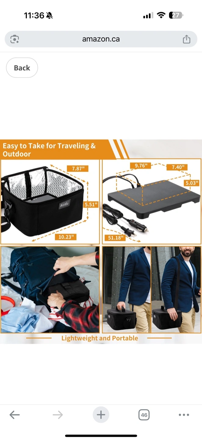 Heated lunch bag. Dual heating system. Works with 110V and 12V power sources. Large capacity. Durable and easy to carry. Includes carrying strap and power cords.