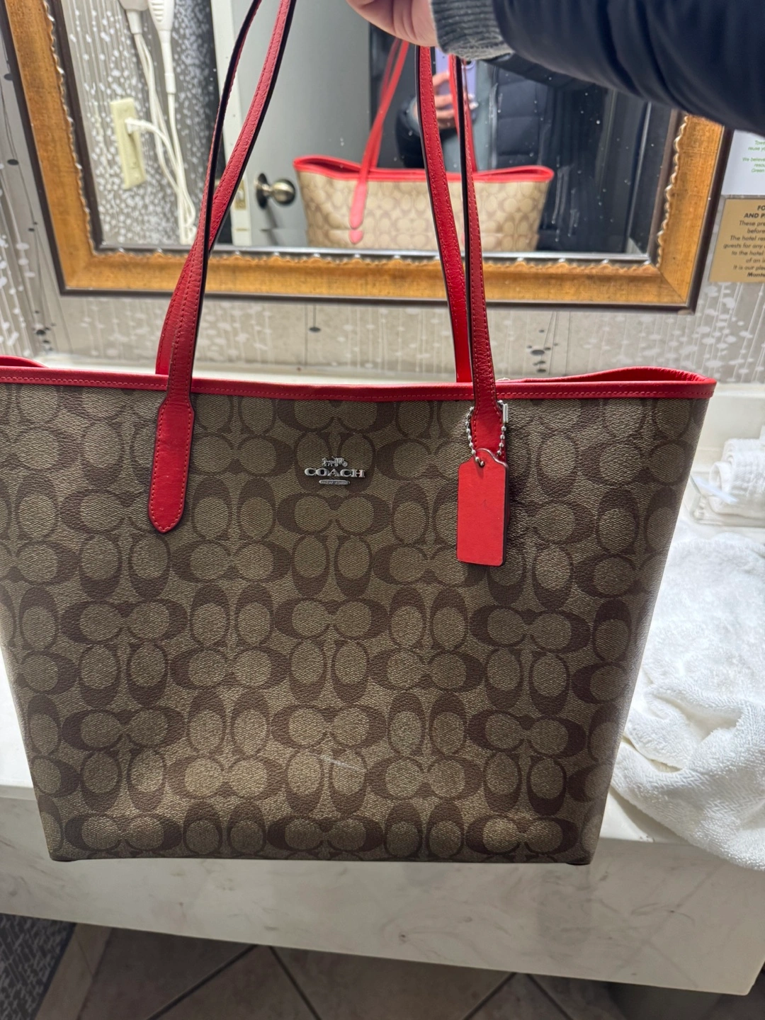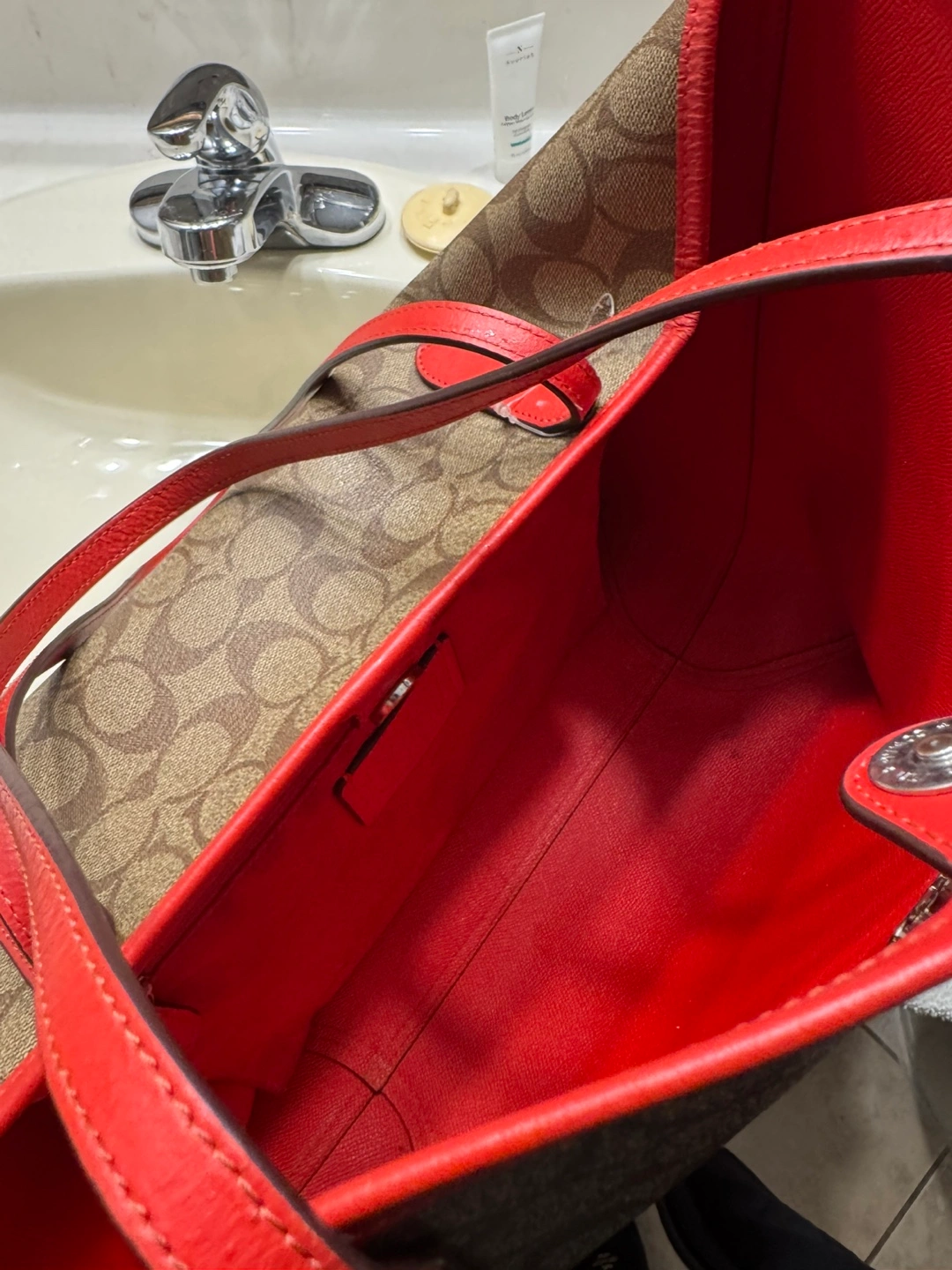 Large tote bag. Brown Coach signature canvas exterior. Red leather trim and interior. Two top handles. Small interior pocket. Coach tag.